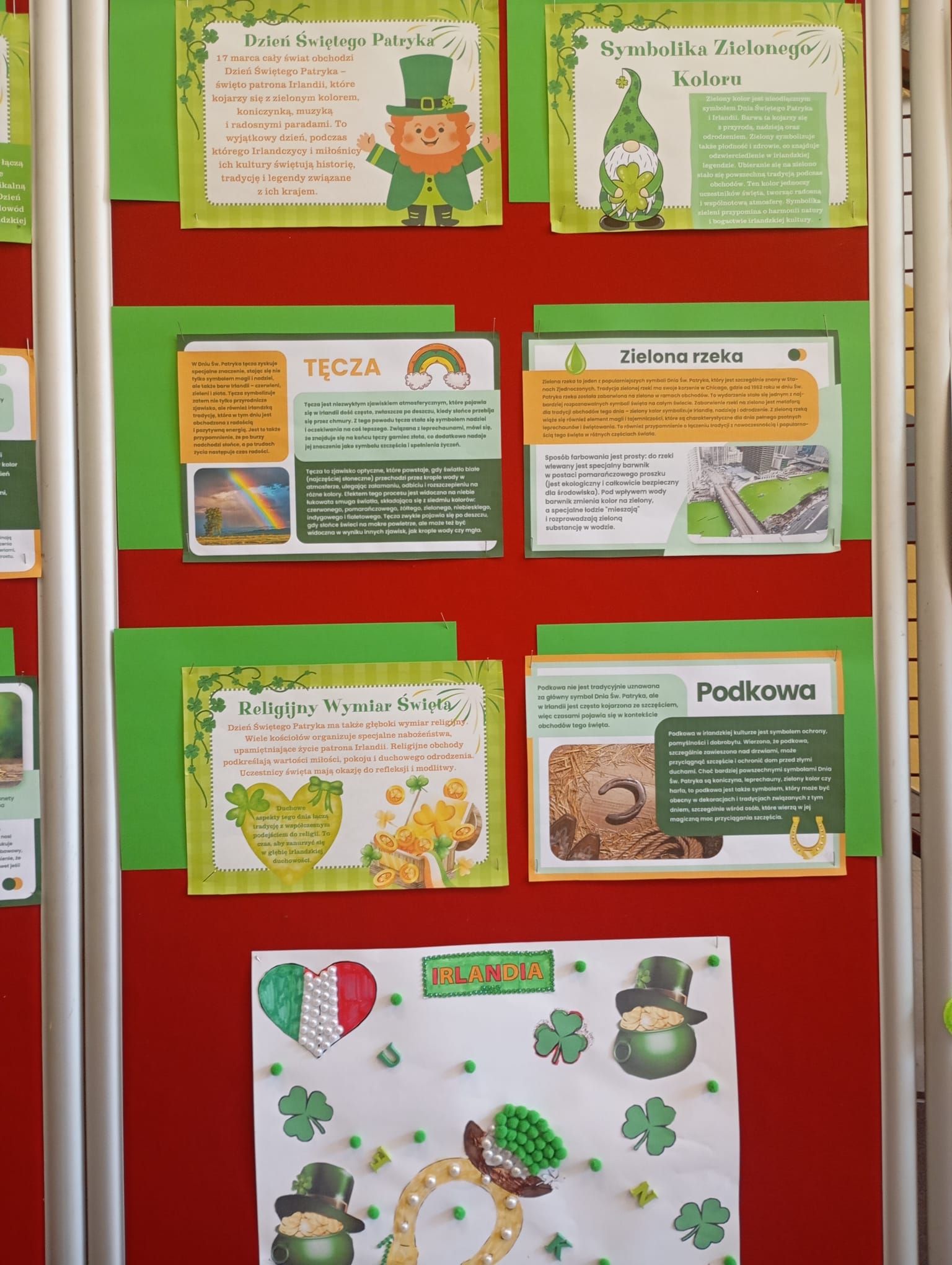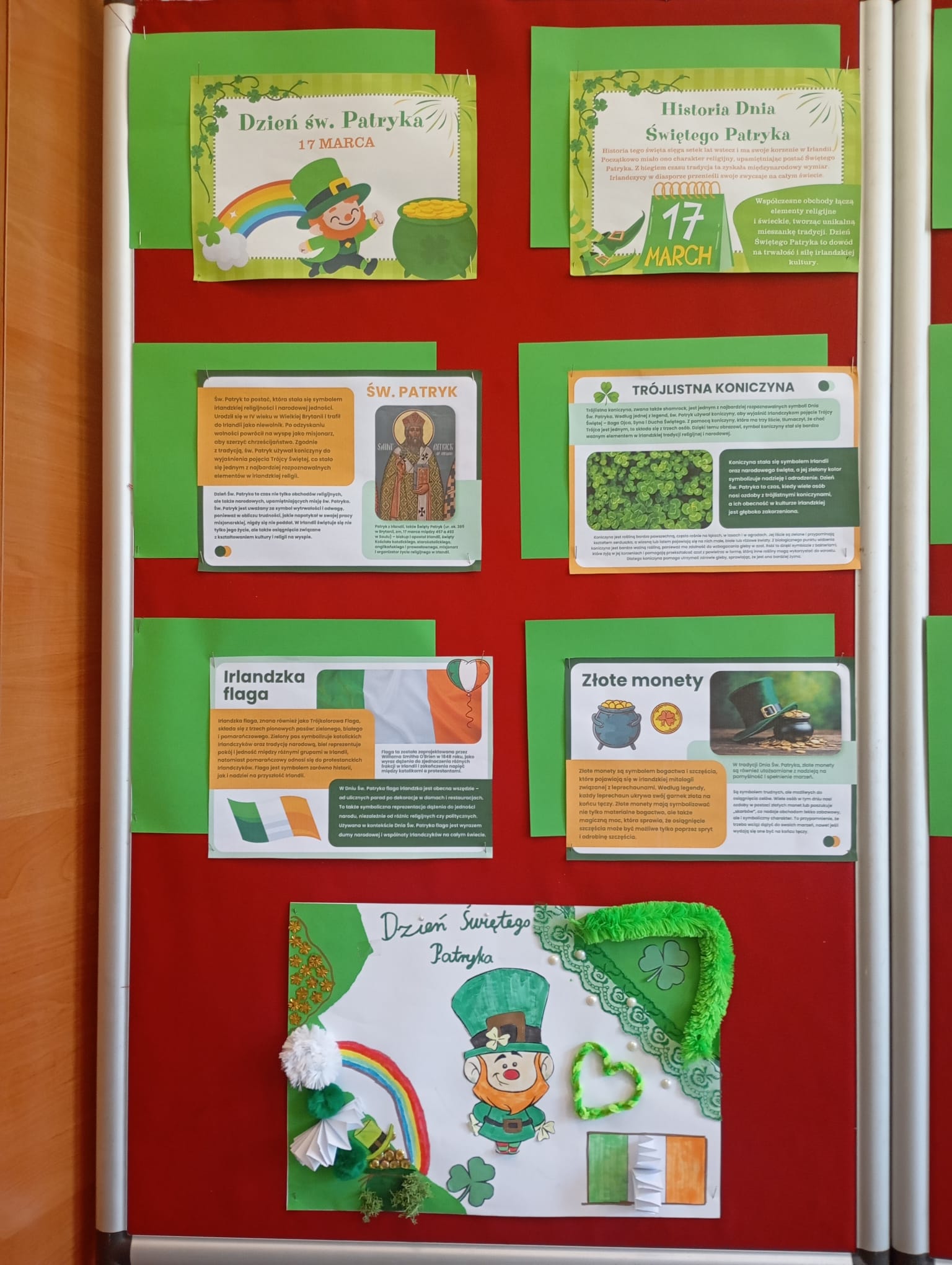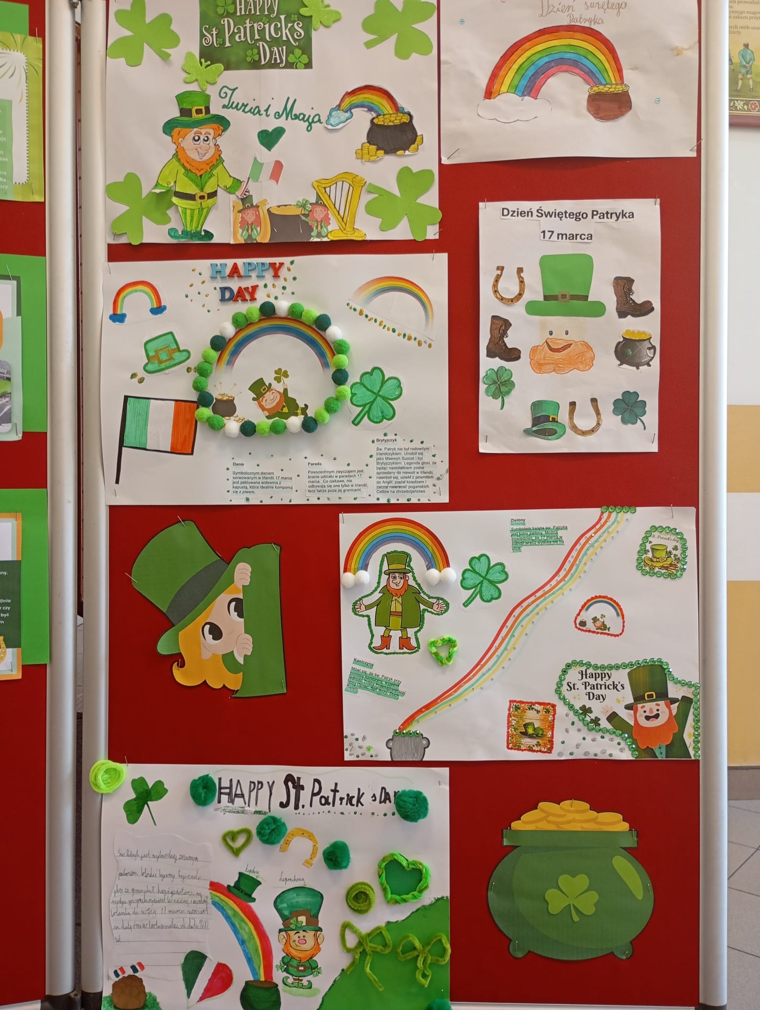 Dzień Świętego Patryka (St. Patrick’s Day) obchodzimy co roku 17 marca na cześć patrona Irlandii – Świętego Patryka. W naszej szkole, my również uroczyście obchodziliśmy ten dzień. Uczniowie klas 1 – 3 zostali zapoznani z historią i tradycjami związanymi z Dniem Świętego Patryka na lekcjach języka angielskiego. Wykonały również plakaty, rysunki i kolorowanki na temat tego święta, które ozdobiły korytarz i sale lekcyjne.