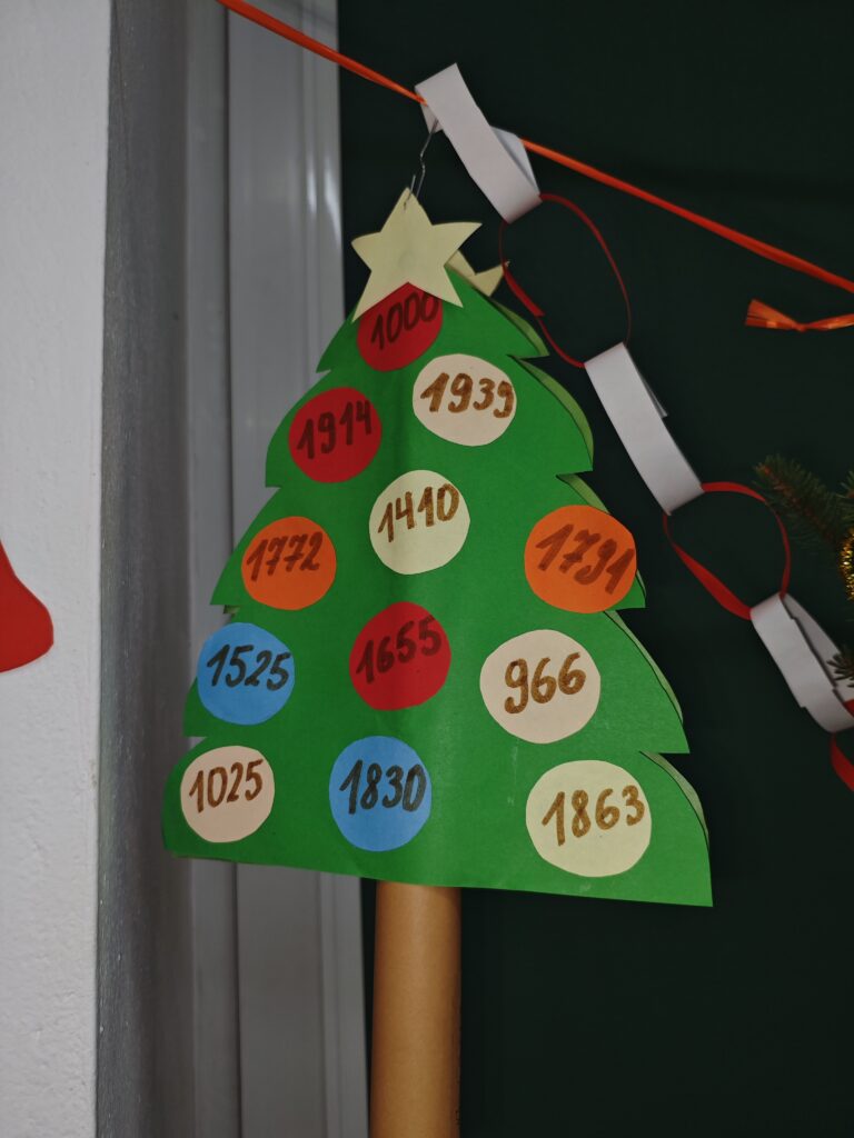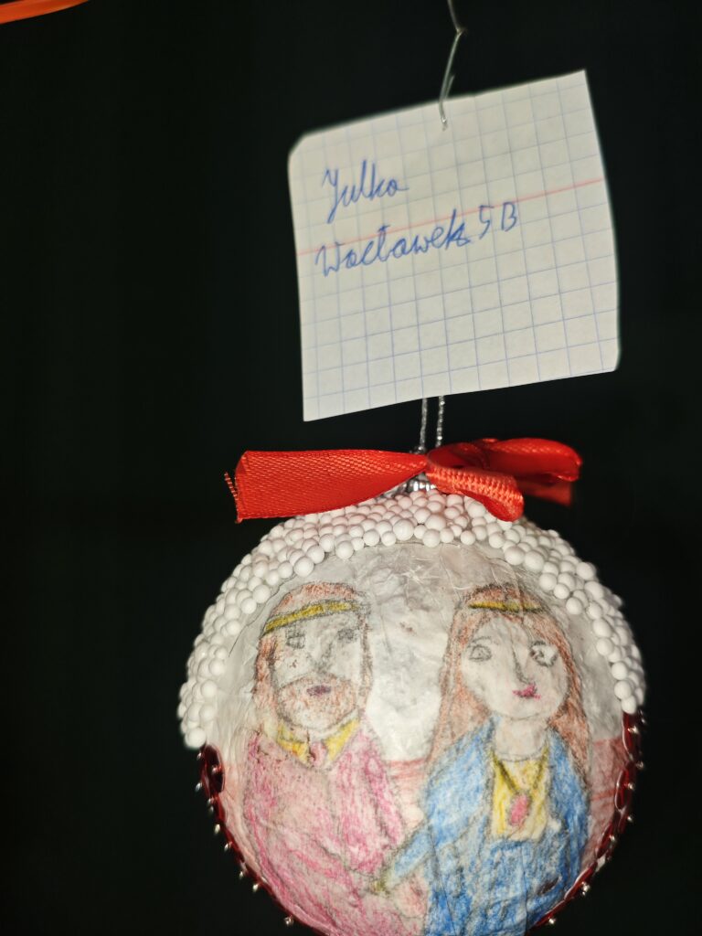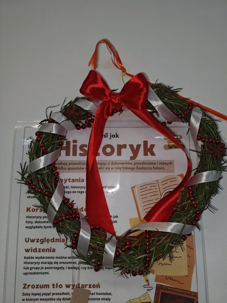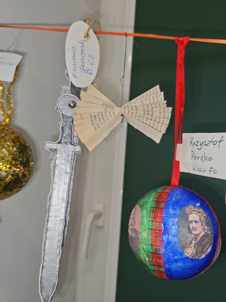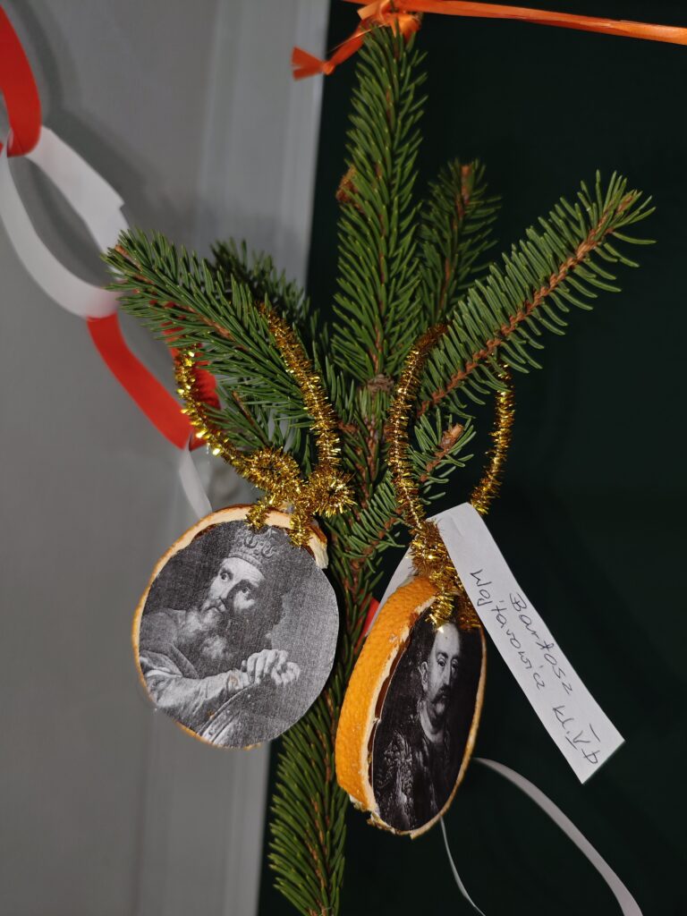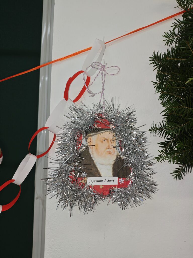 W ramach szkolnego Historycznego Kalendarza Adwentowego jednym z zadań było przygotowanie ozdoby bożonarodzeniowej inspirowanej wydarzeniem historycznym lub postacią historyczną. Uczniowie wykazali się dużą kreatywnością, łącząc wiedzę z historii z atmosferą świąt Bożego Narodzenia. Wykonane prace zostały umieszczone na wystawie w sali historycznej, gdzie można było podziwiać m.in. bombki nawiązujące do ważnych bitew, symboliczne portrety wybitnych władców i bohaterów narodowych oraz ozdoby inspirowane przełomowymi momentami w dziejach Polski i świata. Zadanie nie tylko wprowadziło wszystkich w świąteczny nastrój, ale także pokazało, że historia może być ciekawa, twórcza i obecna w codziennym życiu. [TS]
