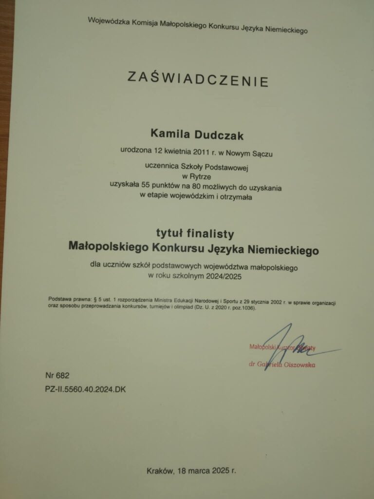 Ponowny sukces uczennicy Szkoły Podstawowej imienia Stefana Pawlika w Rytrze w Małopolskim Konkursie Języka Niemieckiego w roku szkolnym 2024/2025