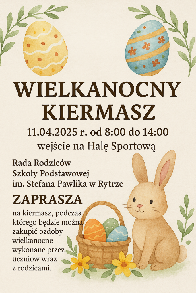 Kiermasz wielkanocny 7 kwietnia 2025 7 kwietnia 2025 Ogłoszenia Rada Rodziców przy Szkole Podstawowej im. Stefana Pawlika w Rytrze zaprasza na kiermasz wielkanocny, który odbędzie się w dniu 11.04.2025 r. w godz. 8.00-14.00 w holu hali sportowej. ZAPRASZAMY!