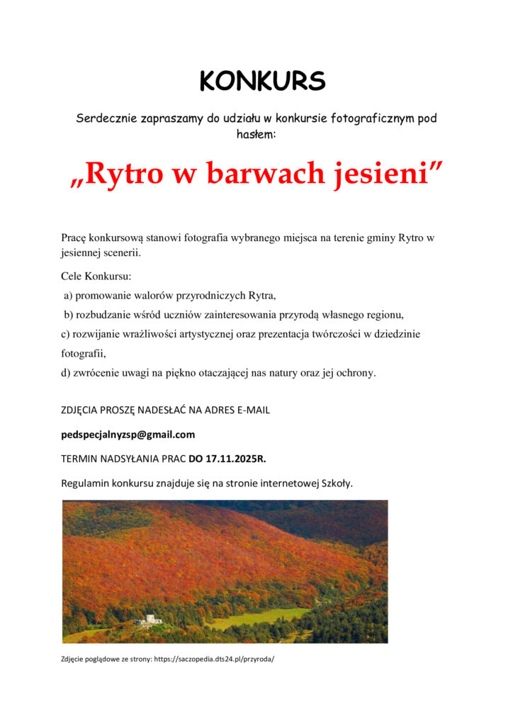 Konkurs: Rytro w barwach jesieni 6 października 2025 6 października 2025 Konkurs Zachęcamy uczniów naszej szkoły do udziału w konkursie. Szczegóły w regulaminie. Regulamin – konkurs Rytro w barwach jesieni