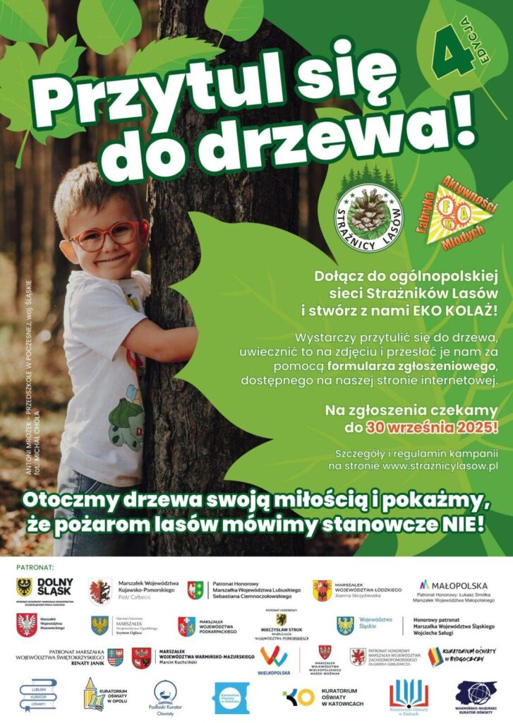 Nasza Szkoła bierze udział w 4. edycji ogólnopolskiej kampanii PRZYTUL się do DRZEWA. Ma ona na celu zwrócenie uwagi na bezpieczne i mądre poruszanie się po lasach, uczula na rzeczy, które mogą nieświadomie doprowadzić do pożaru. Zachęcamy każdego do włączenia się do akcji i PRZYTULENIA DRZEWA! Pokażmy, że kochamy nasze Polskie lasy i chronimy je przed powstawaniem pożarów. Prosimy o Przytulenie się do drzewa, zrobienie zdjęcia, indywidualnie bądź grupowo i przesłanie przez dziennik do p. Karoliny Bodziony do 30.09.2025 r. Wszystkie zdjęcia zostaną przesłane i utworzą eko kolaż zdjęć dzieci i młodzieży z całego kraju. Szczegóły kampanii dostępne w poniższym linku. [KB]