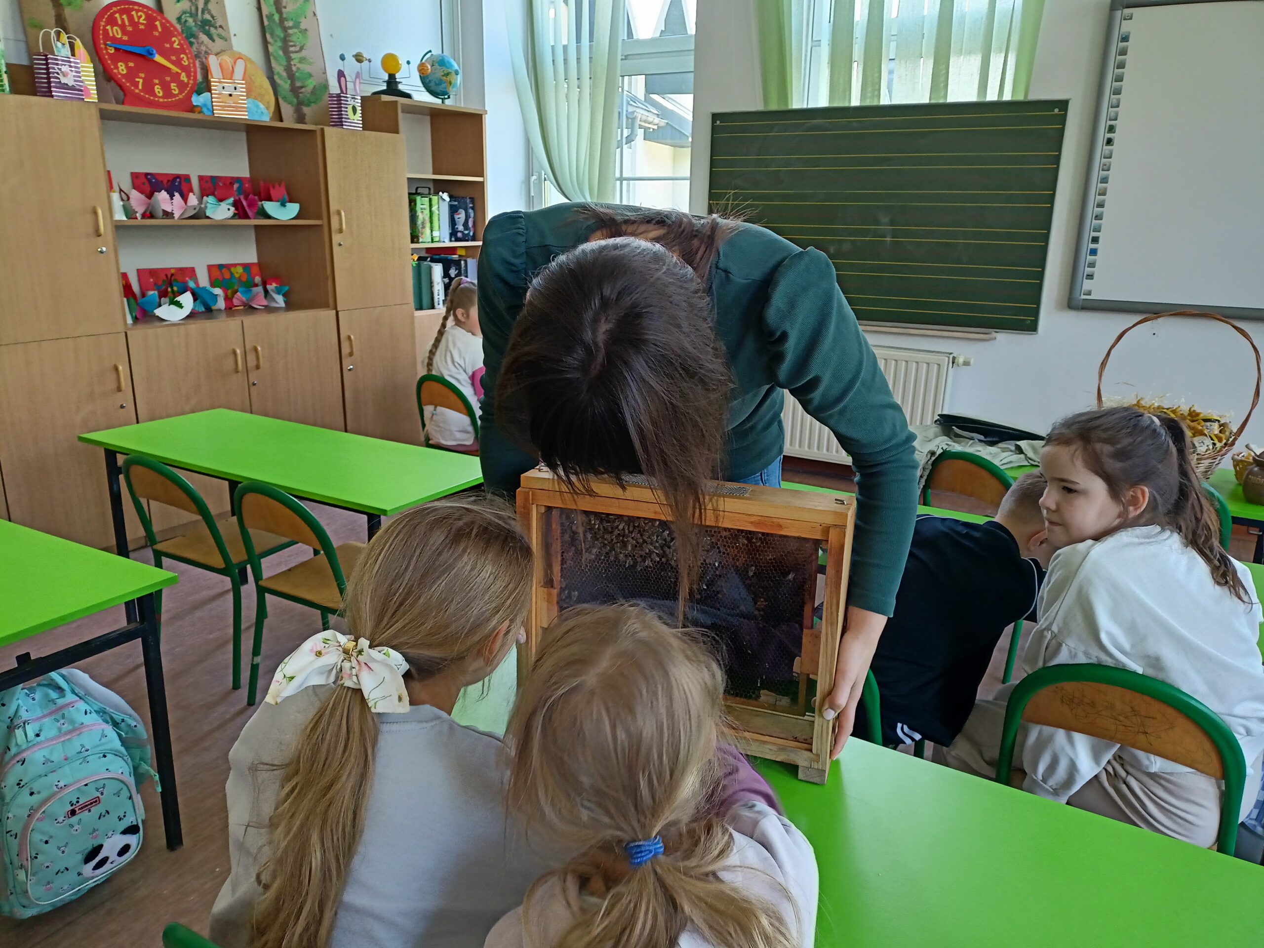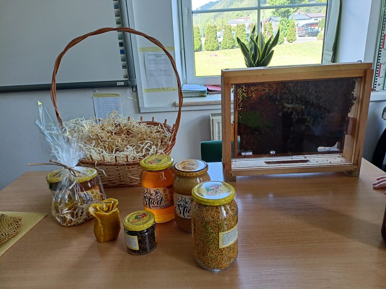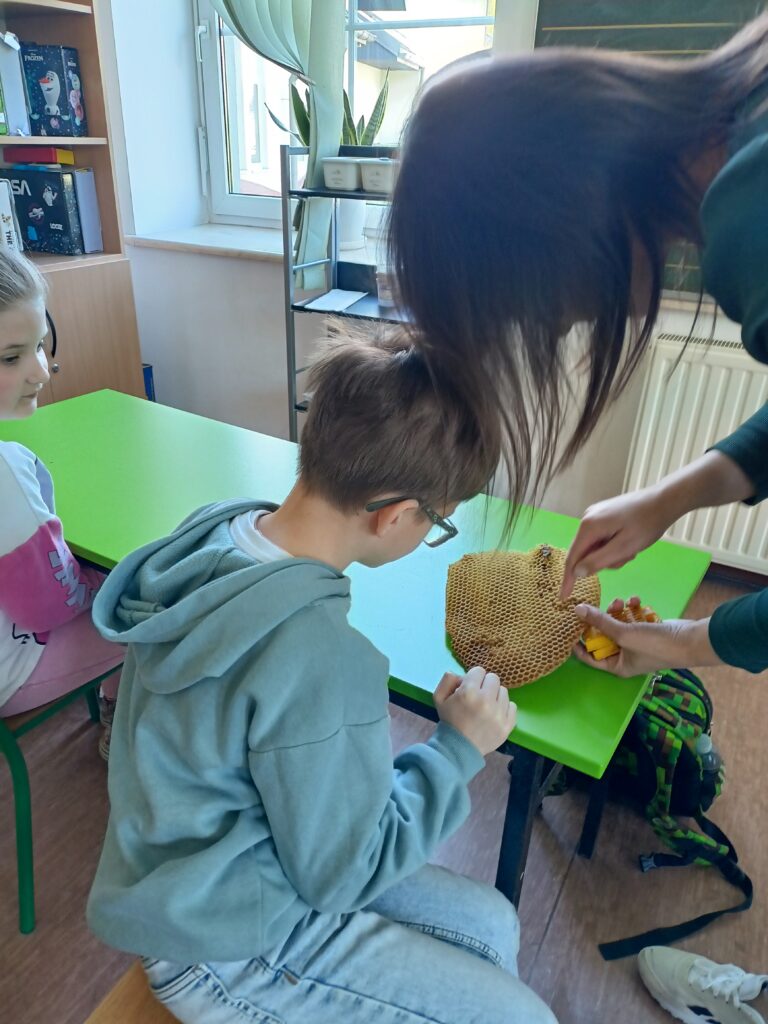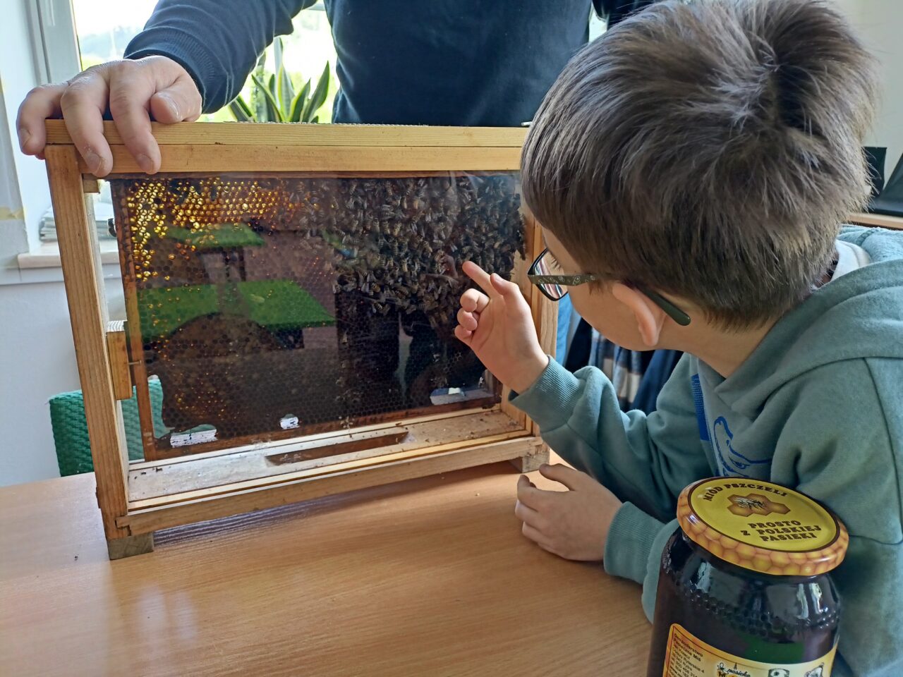 Klasa 2a wzięła udział w niecodziennym spotkaniu z pszczelarzem. Zawód nie tak powszechny, a jakże ważny i nieoceniony w dzisiejszych czasach. Nie byłoby życia na ziemi bez pszczół. O tym przypominają słowa Alberta Einsteina „Kiedy wyginą pszczoły, rodzajowi ludzkiemu pozostaną jedynie 4 lata istnienia…”. Dzięki uprzejmości rodziców naszej uczennicy, którzy zawodowo zajmują się pszczelarstwem i prowadzą gospodarstwo pasieczne „Miś” w naszym rodzinnym Rytrze, dzieci dowiedziały się ciekawostek z życia pszczół. Mogły zobaczyć tzw. „żywy ul” i pracę tych pożytecznych owadów. Jednak największą uwagę zwrócił na siebie truteń Gucio, który brylował podczas naszego spotkania. Dzieci miały doskonałą okazję do degustacji różnych rodzajów miodu oraz produktów pszczelich takich jak pyłek czy pierzga. Była to niezapomniana lekcja przyrody. [MS]
