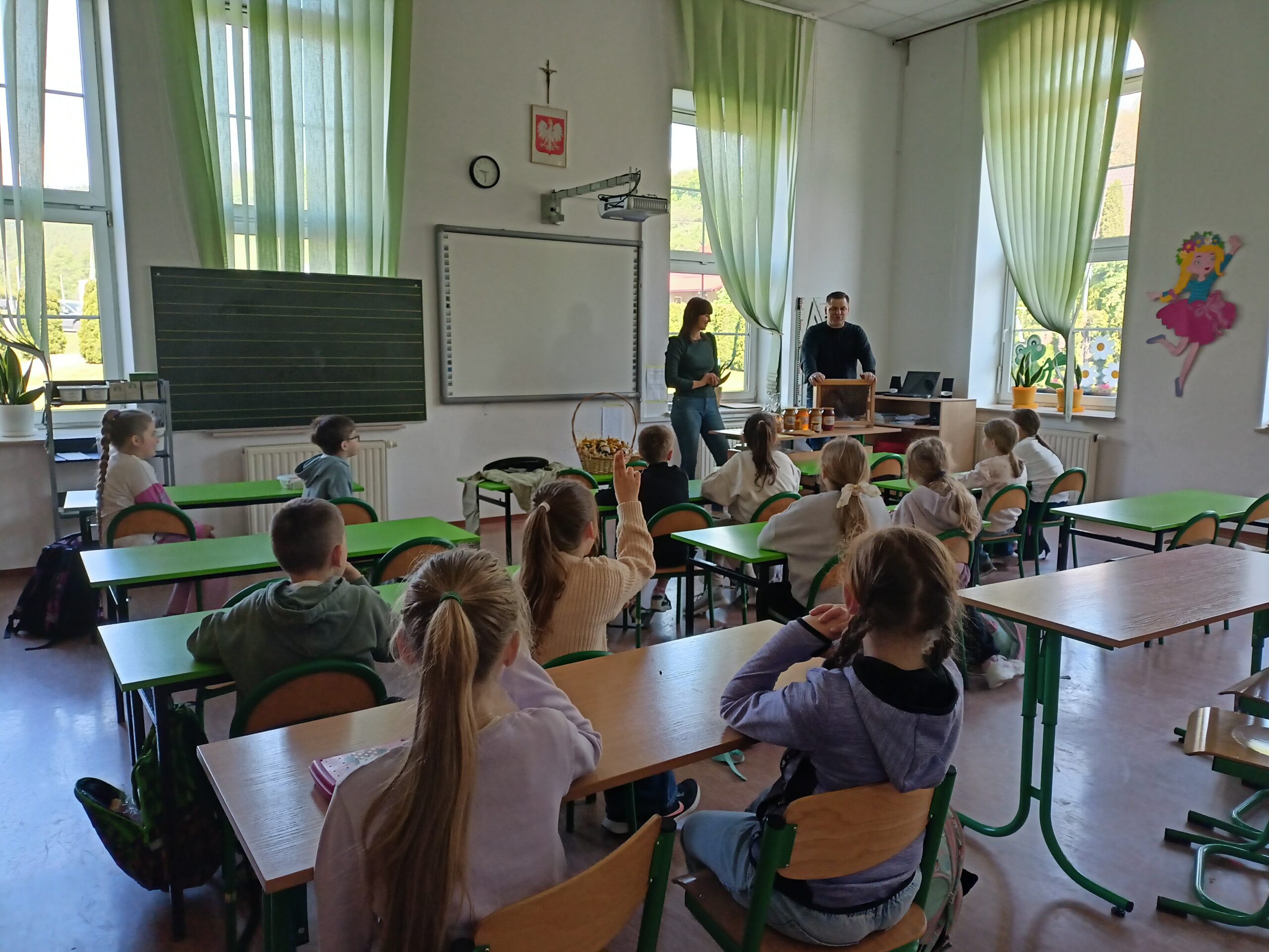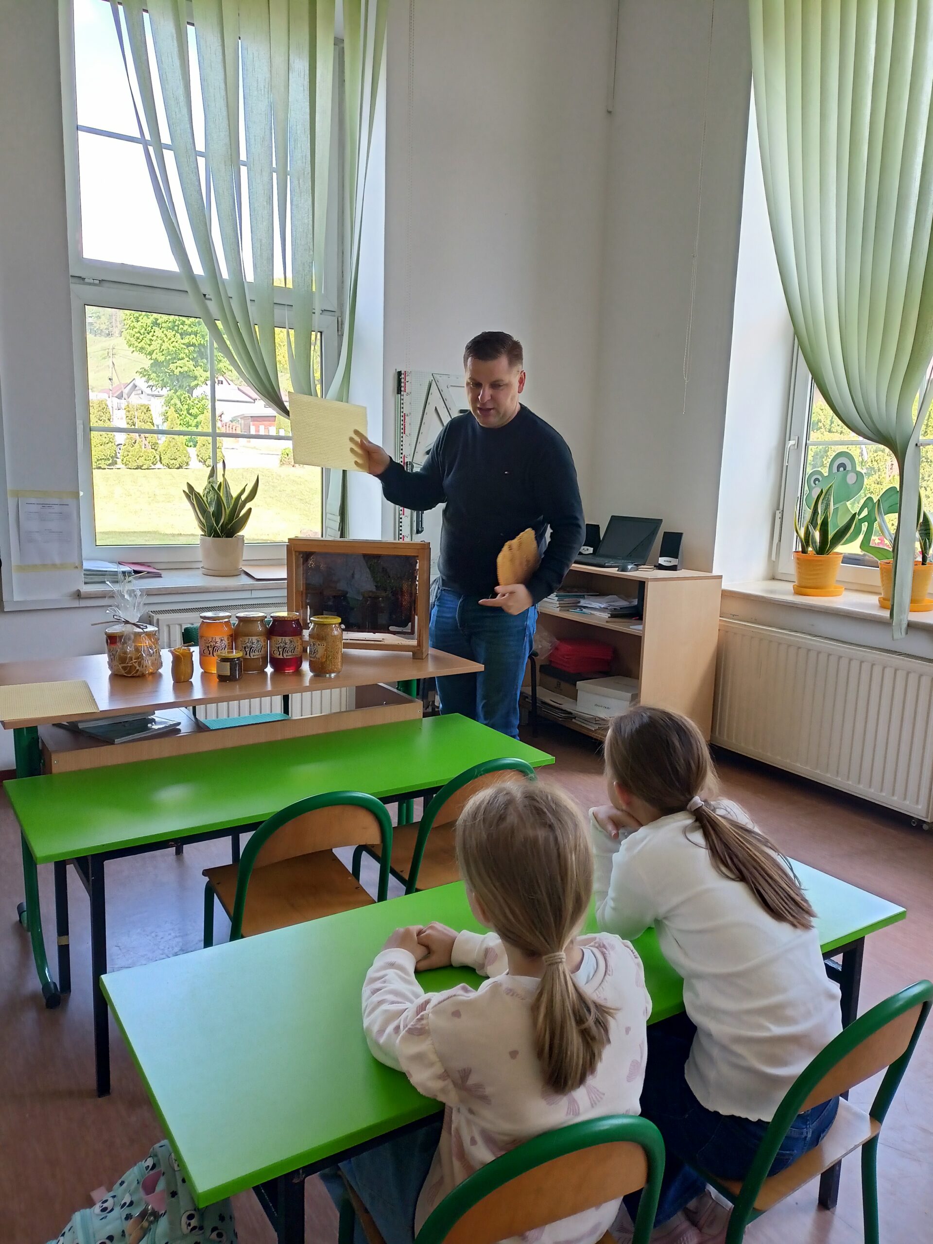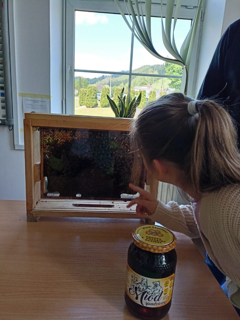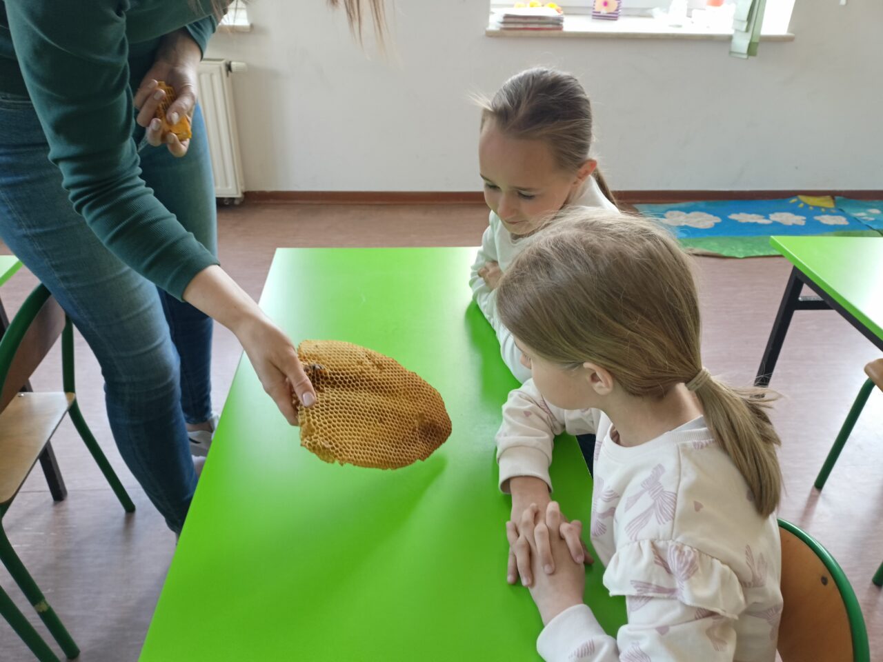 Klasa 2a wzięła udział w niecodziennym spotkaniu z pszczelarzem. Zawód nie tak powszechny, a jakże ważny i nieoceniony w dzisiejszych czasach. Nie byłoby życia na ziemi bez pszczół. O tym przypominają słowa Alberta Einsteina „Kiedy wyginą pszczoły, rodzajowi ludzkiemu pozostaną jedynie 4 lata istnienia…”. Dzięki uprzejmości rodziców naszej uczennicy, którzy zawodowo zajmują się pszczelarstwem i prowadzą gospodarstwo pasieczne „Miś” w naszym rodzinnym Rytrze, dzieci dowiedziały się ciekawostek z życia pszczół. Mogły zobaczyć tzw. „żywy ul” i pracę tych pożytecznych owadów. Jednak największą uwagę zwrócił na siebie truteń Gucio, który brylował podczas naszego spotkania. Dzieci miały doskonałą okazję do degustacji różnych rodzajów miodu oraz produktów pszczelich takich jak pyłek czy pierzga. Była to niezapomniana lekcja przyrody. [MS]