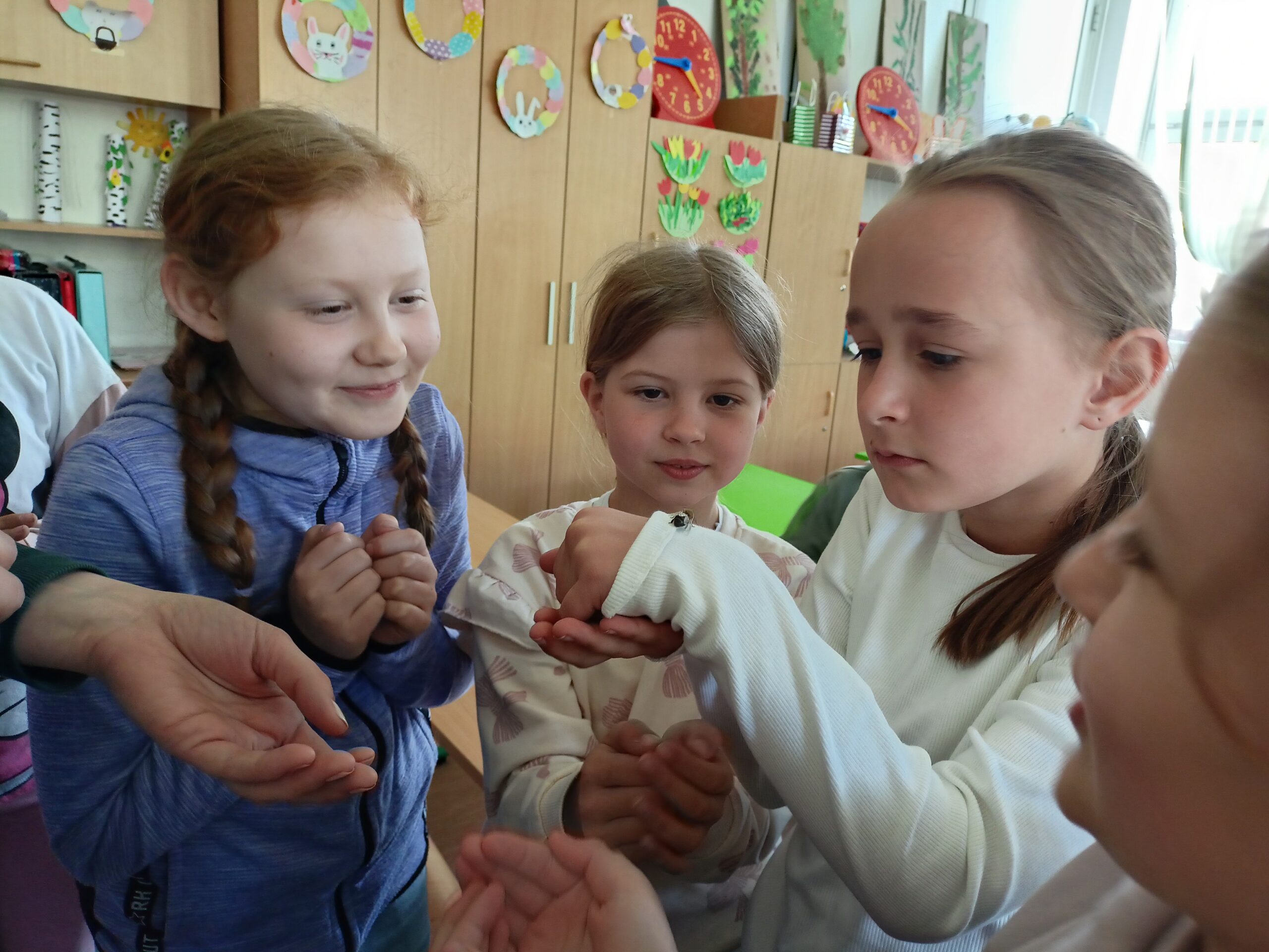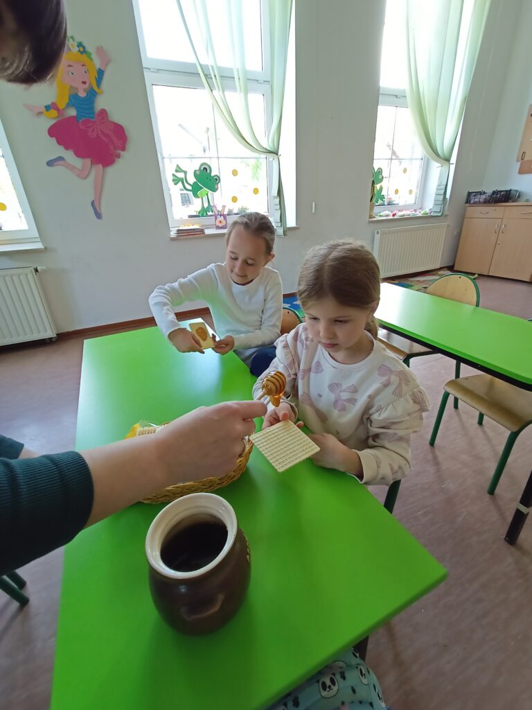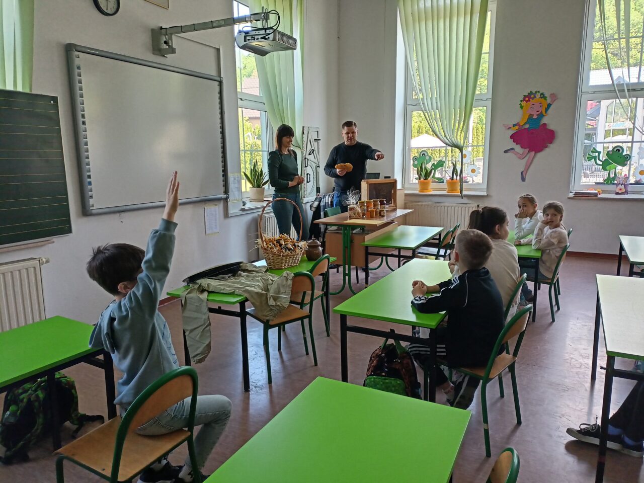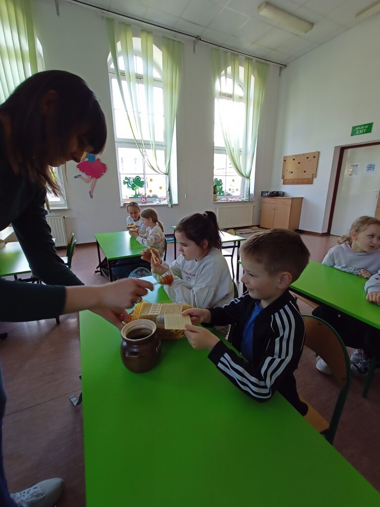 Klasa 2a wzięła udział w niecodziennym spotkaniu z pszczelarzem. Zawód nie tak powszechny, a jakże ważny i nieoceniony w dzisiejszych czasach. Nie byłoby życia na ziemi bez pszczół. O tym przypominają słowa Alberta Einsteina „Kiedy wyginą pszczoły, rodzajowi ludzkiemu pozostaną jedynie 4 lata istnienia…”. Dzięki uprzejmości rodziców naszej uczennicy, którzy zawodowo zajmują się pszczelarstwem i prowadzą gospodarstwo pasieczne „Miś” w naszym rodzinnym Rytrze, dzieci dowiedziały się ciekawostek z życia pszczół. Mogły zobaczyć tzw. „żywy ul” i pracę tych pożytecznych owadów. Jednak największą uwagę zwrócił na siebie truteń Gucio, który brylował podczas naszego spotkania. Dzieci miały doskonałą okazję do degustacji różnych rodzajów miodu oraz produktów pszczelich takich jak pyłek czy pierzga. Była to niezapomniana lekcja przyrody. [MS]