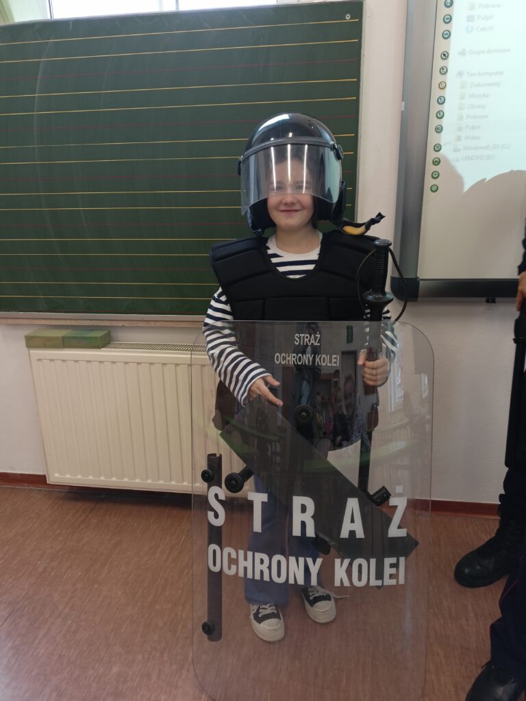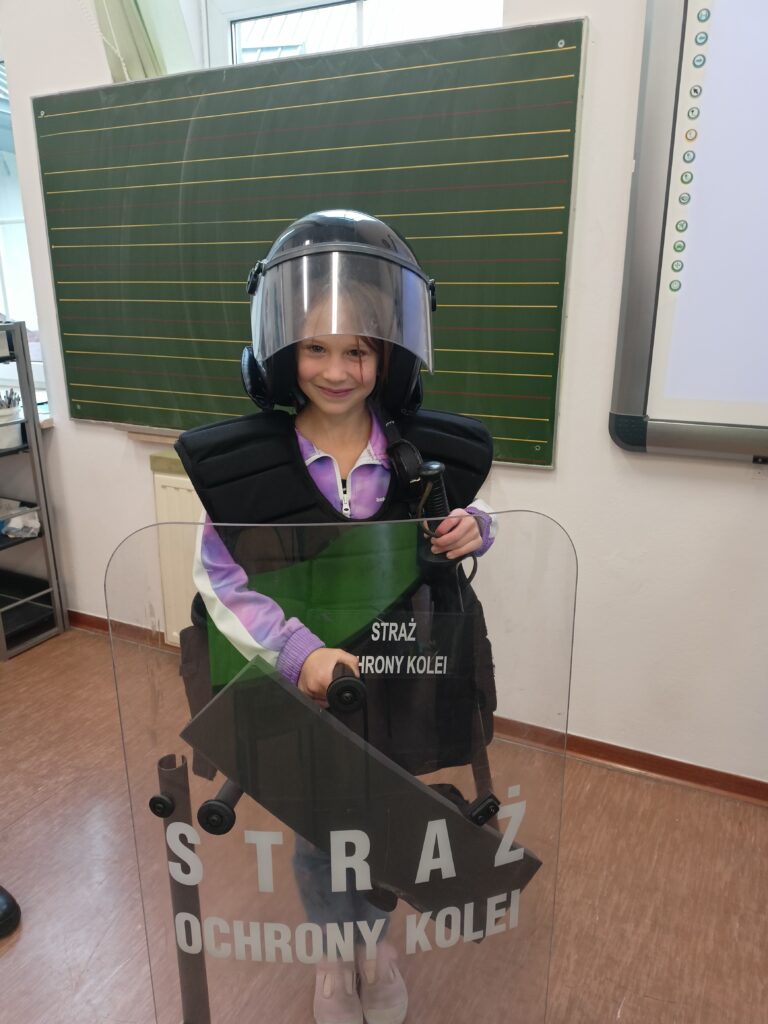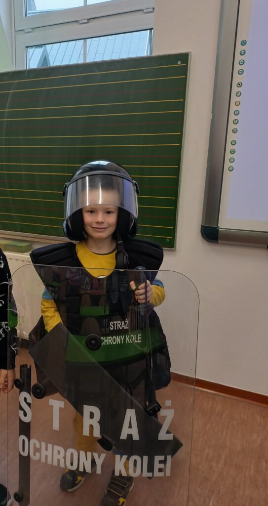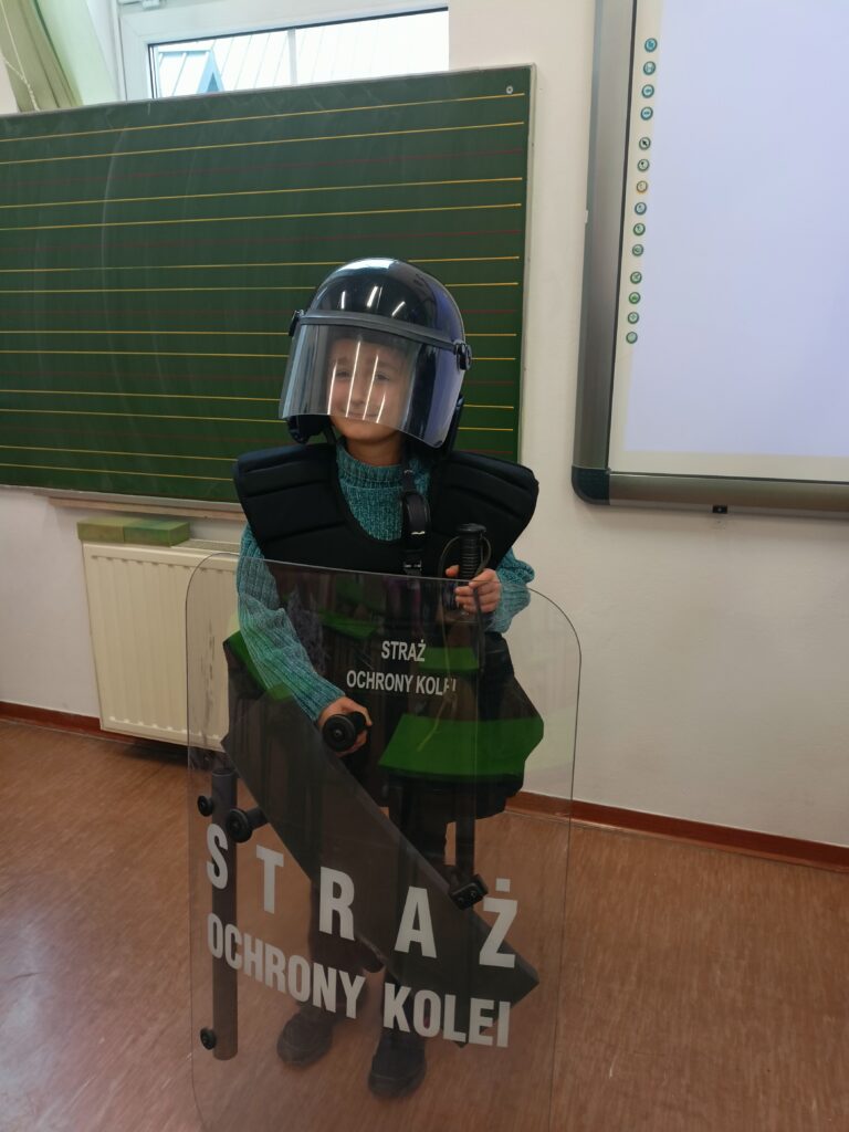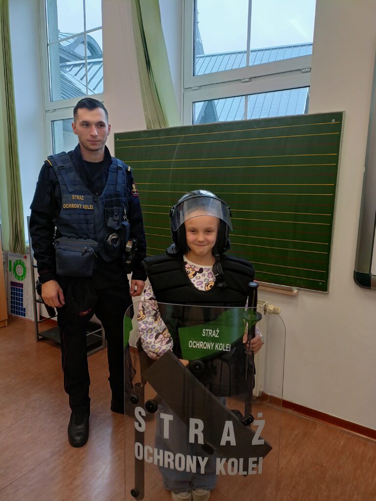 W ramach całorocznej innowacji pedagogicznej związanej z bezpieczeństwem klasa 2a wzięła udział w spotkaniu ze Strażą Ochrony Kolei z Nowego Sącza. SOK to umundurowana i uzbrojona jednostka, której zadaniem jest strzeżenie bezpieczeństwa na przejazdach kolejowych, peronach, w pociągach, na obszarach kolejowych. Funkcjonariusze SOK przeprowadzili zajęcia tematyczne związane z bezpieczeństwem podczas przechodzenia i przejeżdżania przez torowiska. Uczniowie zdobyli cenną wiedzę, która może uratować komuś życie. Dowiedzieli się czym jest tzw. żółta naklejka PLK, która zapobiega zdarzeniom na przejazdach kolejowo-drogowych i zostali ambasadorami kampanii społecznej „Bezpieczny przejazd”. Najwięcej radości sprawiła dzieciom druga część zajęć, w której mogli stać się prawdziwymi „sokistami” ubierając uniform, trzymając jak się później okazało ciężką tarczę i hełm. Funkcjonariusze przypomnieli również o noszeniu odblasków, które są niezbędne o tej porze roku i propagując akcję „Świeć przykładem – noś odblaski”. Na zakończenie zajęć uczniowie otrzymali upominki – zeszyty edukacyjne, kolorowanki, łamigłówki, odblaski, gadżety promujące bezpieczeństwo na przejazdach kolejowych. [MS]