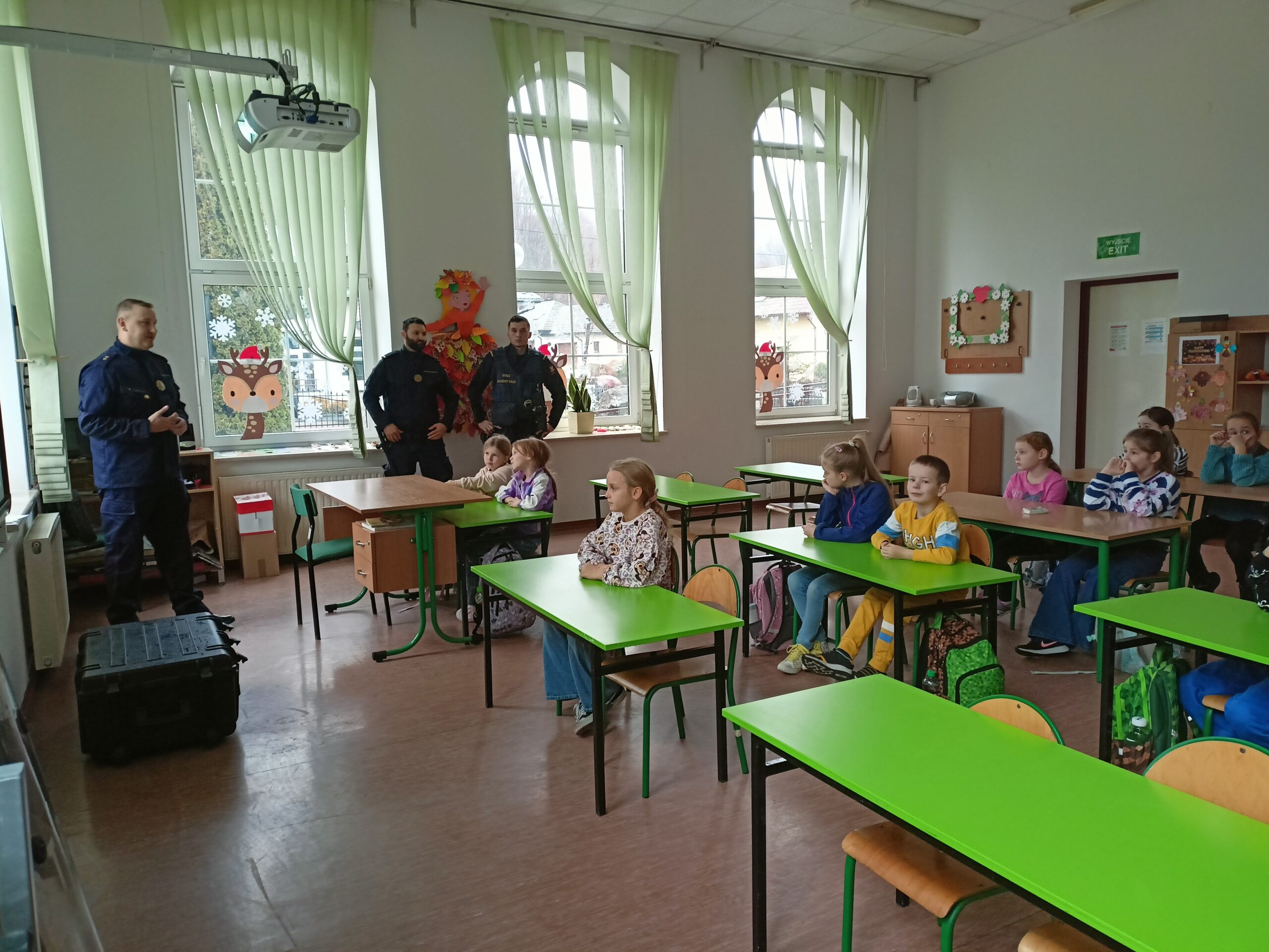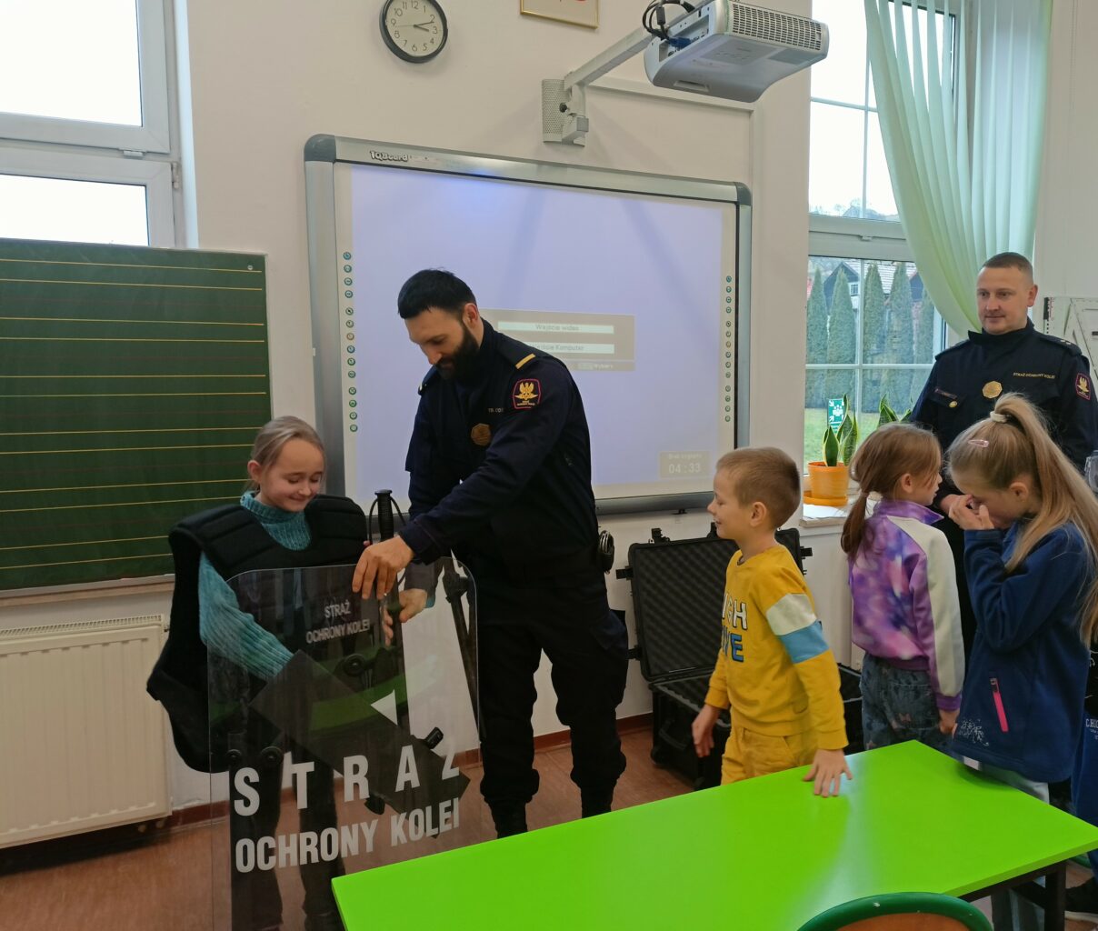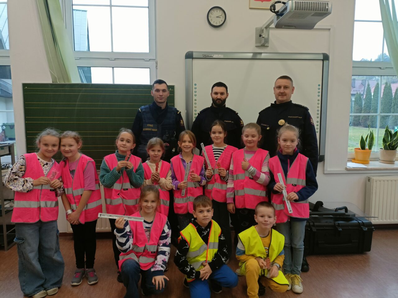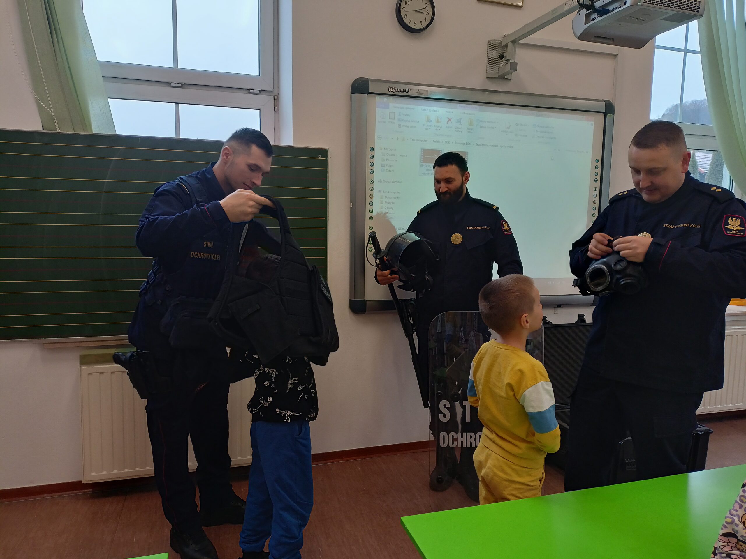W ramach całorocznej innowacji pedagogicznej związanej z bezpieczeństwem klasa 2a wzięła udział w spotkaniu ze Strażą Ochrony Kolei z Nowego Sącza. SOK to umundurowana i uzbrojona jednostka, której zadaniem jest strzeżenie bezpieczeństwa na przejazdach kolejowych, peronach, w pociągach, na obszarach kolejowych. Funkcjonariusze SOK przeprowadzili zajęcia tematyczne związane z bezpieczeństwem podczas przechodzenia i przejeżdżania przez torowiska. Uczniowie zdobyli cenną wiedzę, która może uratować komuś życie. Dowiedzieli się czym jest tzw. żółta naklejka PLK, która zapobiega zdarzeniom na przejazdach kolejowo-drogowych i zostali ambasadorami kampanii społecznej „Bezpieczny przejazd”. Najwięcej radości sprawiła dzieciom druga część zajęć, w której mogli stać się prawdziwymi „sokistami” ubierając uniform, trzymając jak się później okazało ciężką tarczę i hełm. Funkcjonariusze przypomnieli również o noszeniu odblasków, które są niezbędne o tej porze roku i propagując akcję „Świeć przykładem – noś odblaski”. Na zakończenie zajęć uczniowie otrzymali upominki – zeszyty edukacyjne, kolorowanki, łamigłówki, odblaski, gadżety promujące bezpieczeństwo na przejazdach kolejowych. [MS]