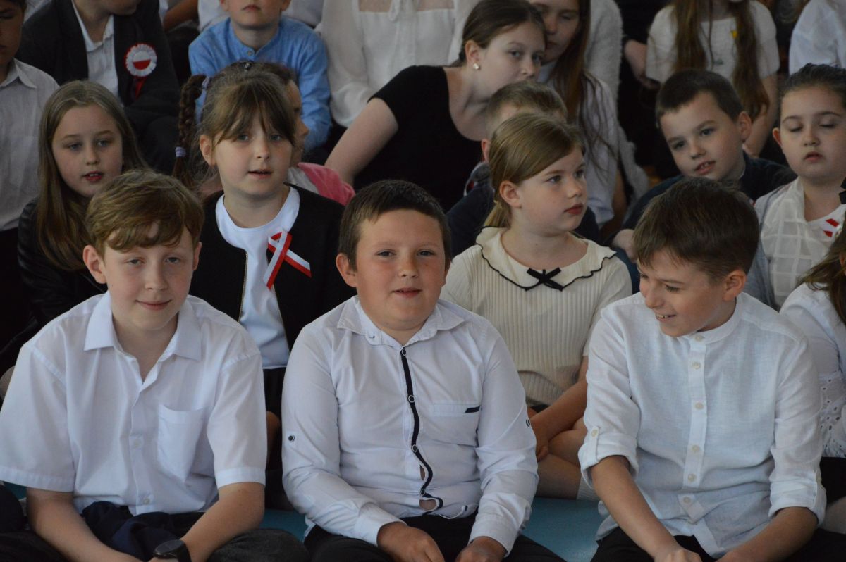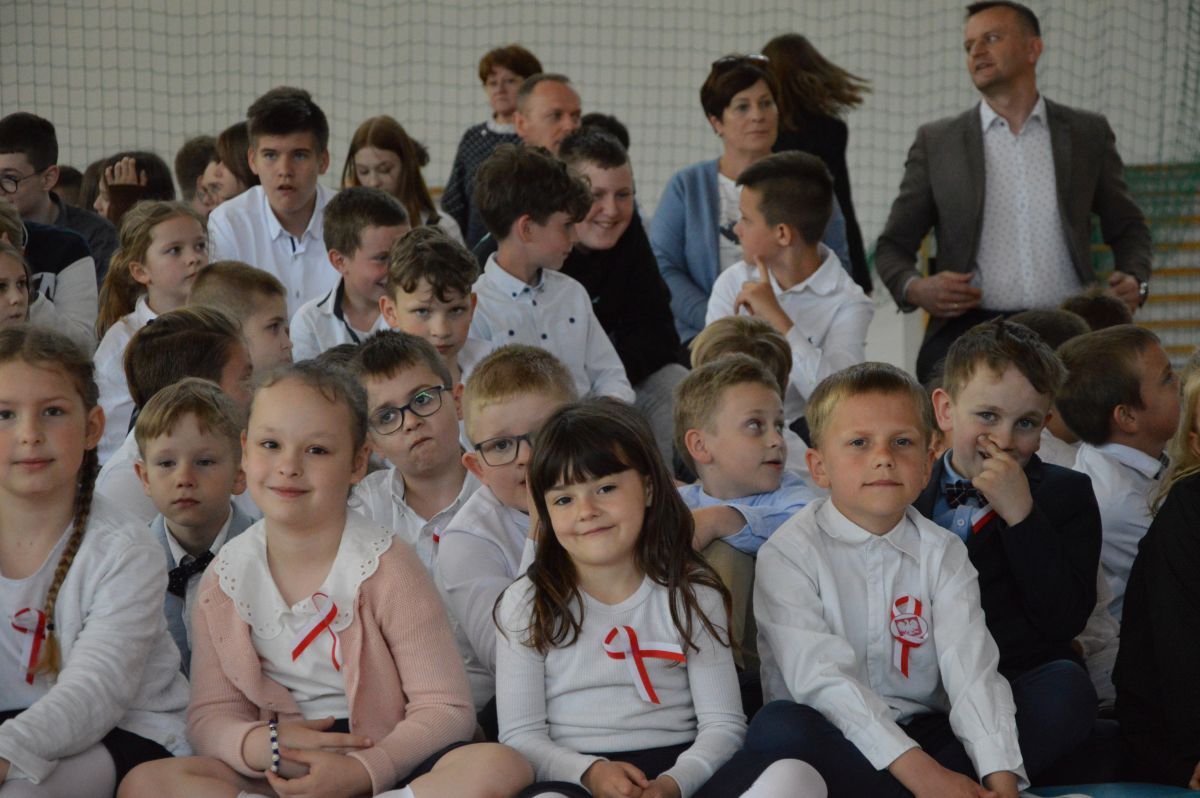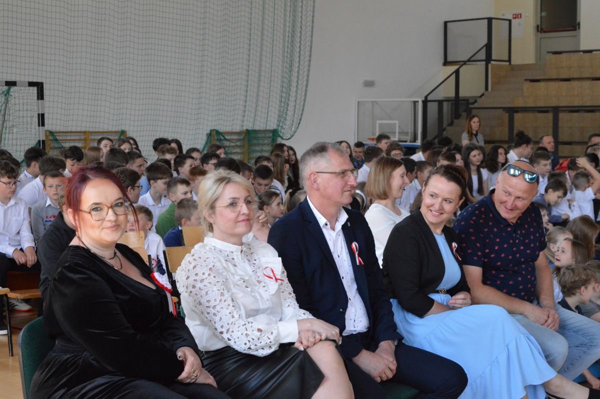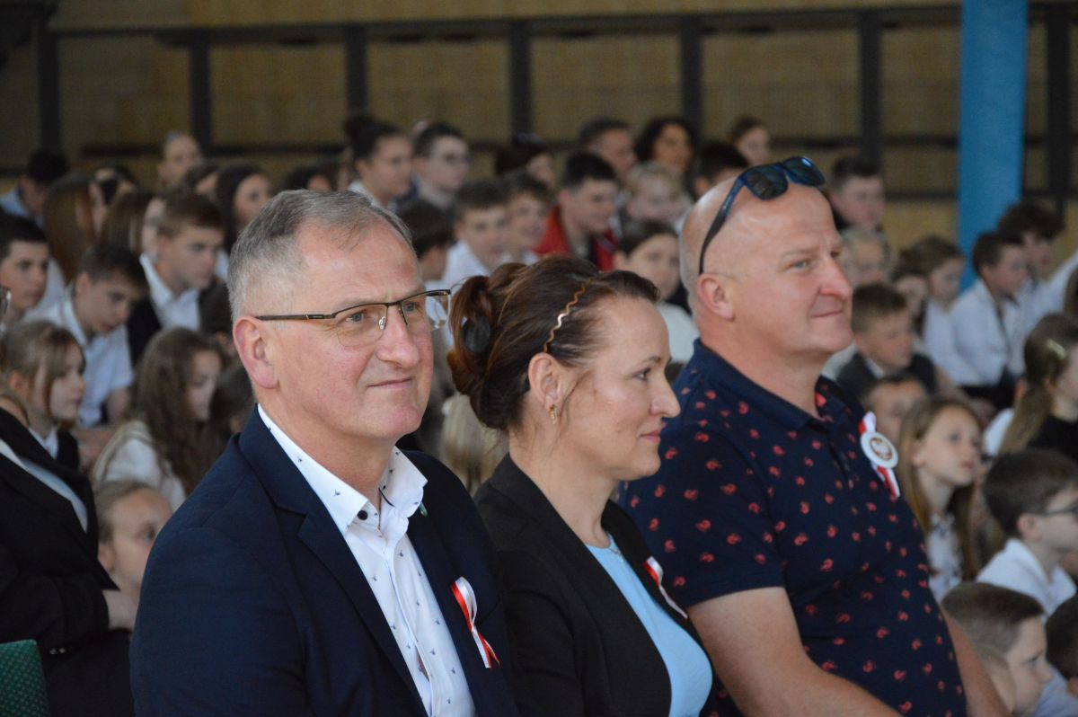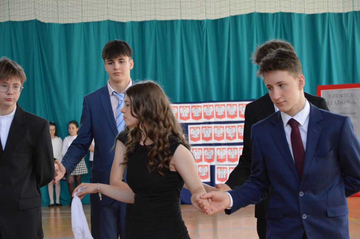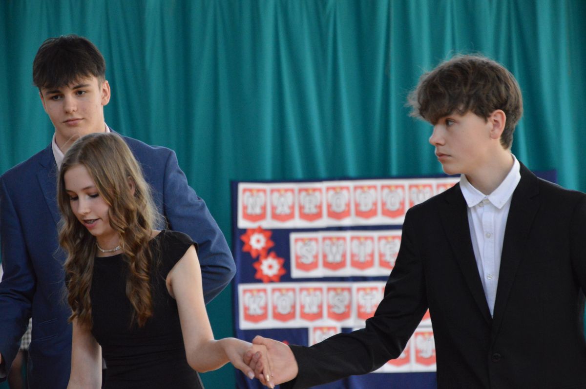 W tym roku uroczystość upamiętniająca Święto Trzeciego Maja wybrzmiała u nas trzema polonezami: „Trzeciego Maja”, „Pamięć w nas” i polonezem Kilara z Pana Tadeusza. Ten trzeci wytańczyła klasa 8b i było pięknie!. Wydarzenie przygotowały pani Dagmara i pani Beata. Nie zabrakło pani Renaty z chórem oraz skrzypaczek Moniki, Kingi i Emilki. Uroczystość uświetniła obecność zacnych gości, w osobach pana Wójta oraz radnych pana Tomasza Kotarby i pani Katarzyny Obrzud. Dało się również zauważyć panią Zofię, emerytowaną nauczycielkę naszej szkoły, która obserwowała wnuka prezentującego się w polonezie. Akademię zakończyła pani dyrektor Justyna Łękawska, życząc nam słonecznych majowych świąt. [PK]