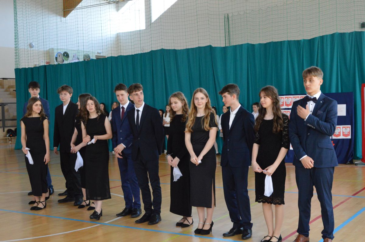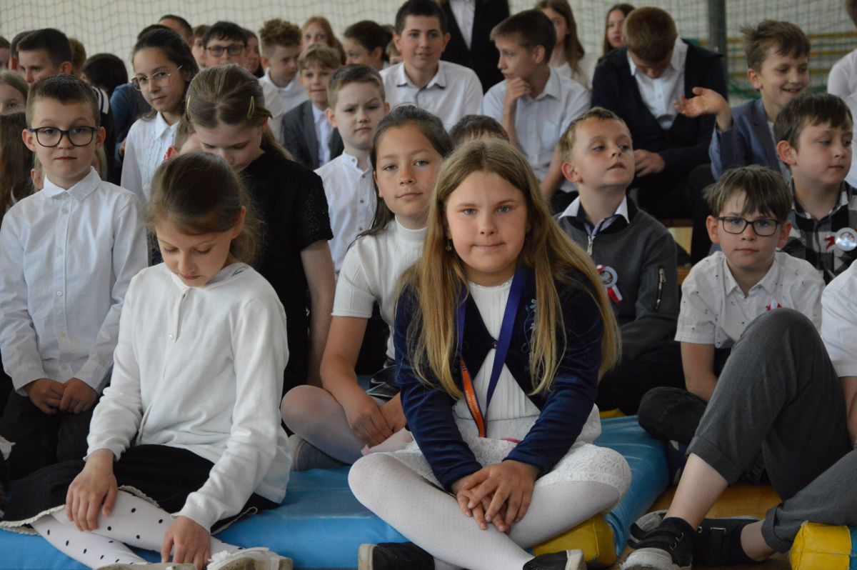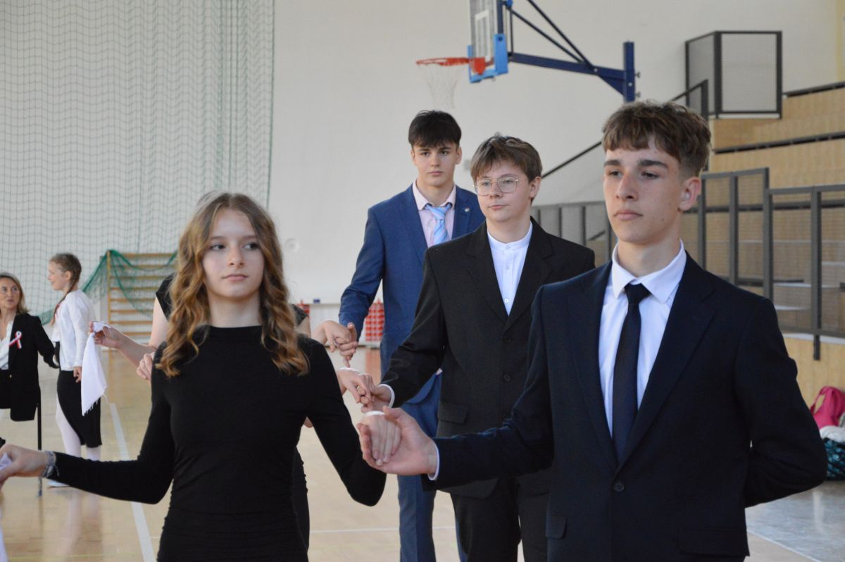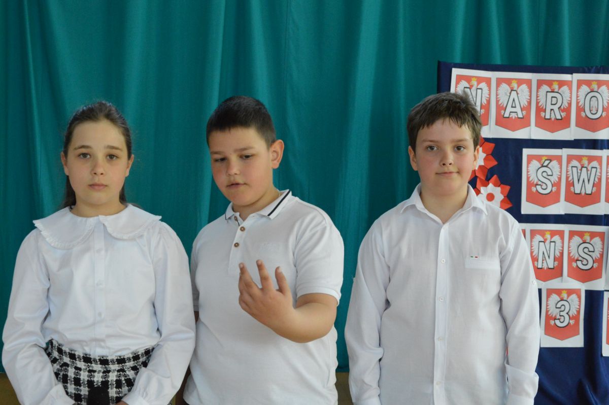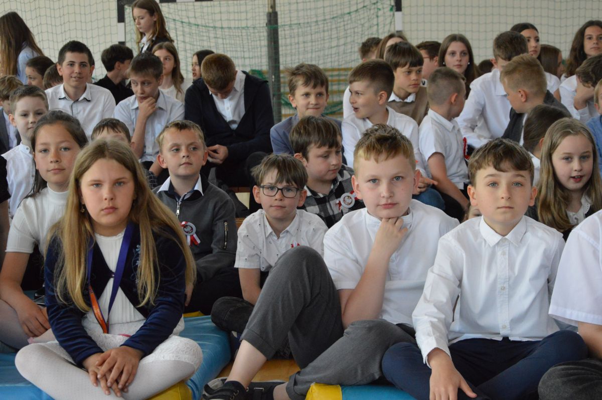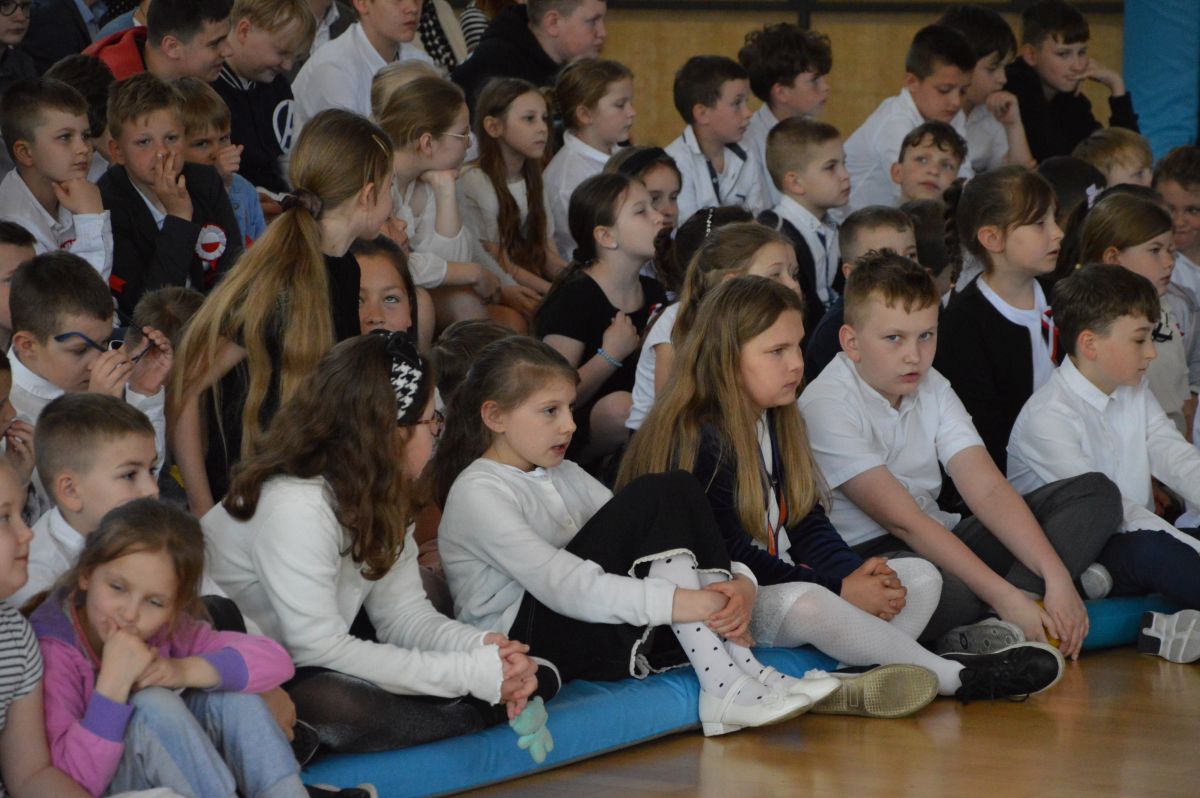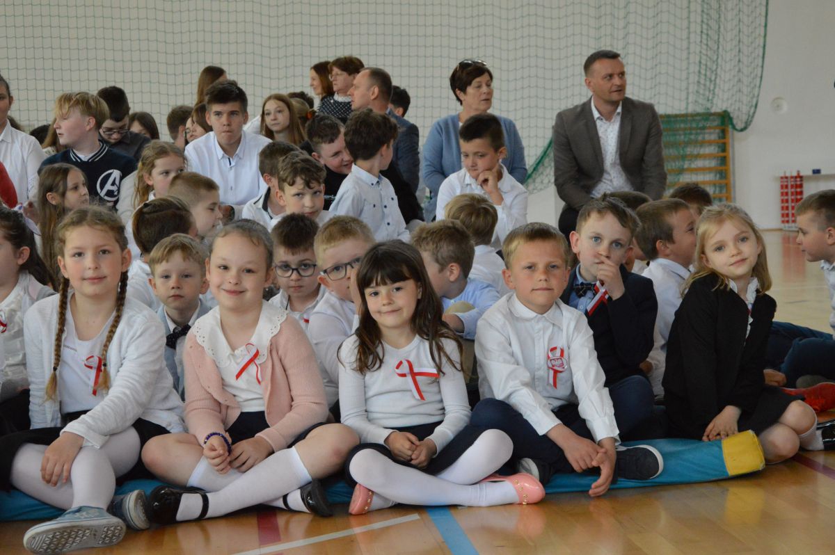 W tym roku uroczystość upamiętniająca Święto Trzeciego Maja wybrzmiała u nas trzema polonezami: „Trzeciego Maja”, „Pamięć w nas” i polonezem Kilara z Pana Tadeusza. Ten trzeci wytańczyła klasa 8b i było pięknie!. Wydarzenie przygotowały pani Dagmara i pani Beata. Nie zabrakło pani Renaty z chórem oraz skrzypaczek Moniki, Kingi i Emilki. Uroczystość uświetniła obecność zacnych gości, w osobach pana Wójta oraz radnych pana Tomasza Kotarby i pani Katarzyny Obrzud. Dało się również zauważyć panią Zofię, emerytowaną nauczycielkę naszej szkoły, która obserwowała wnuka prezentującego się w polonezie. Akademię zakończyła pani dyrektor Justyna Łękawska, życząc nam słonecznych majowych świąt. [PK]
