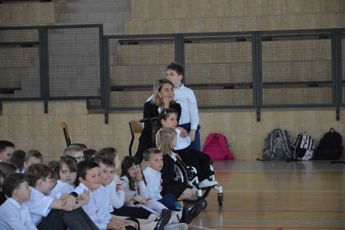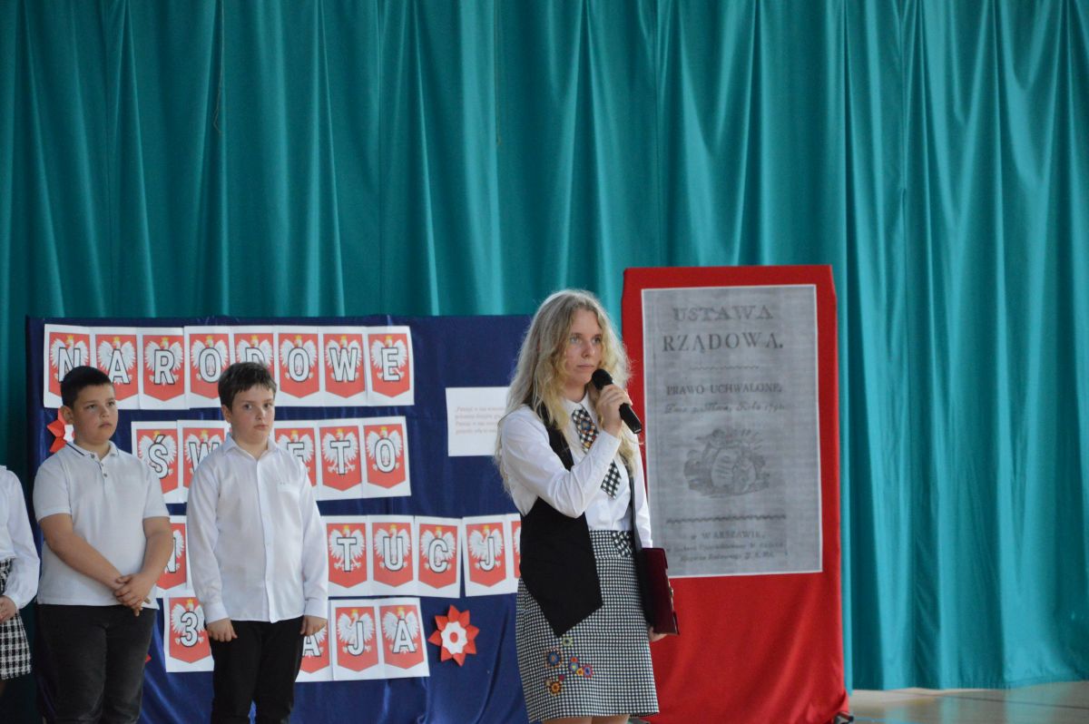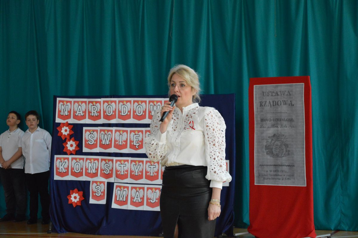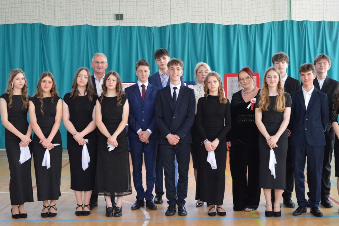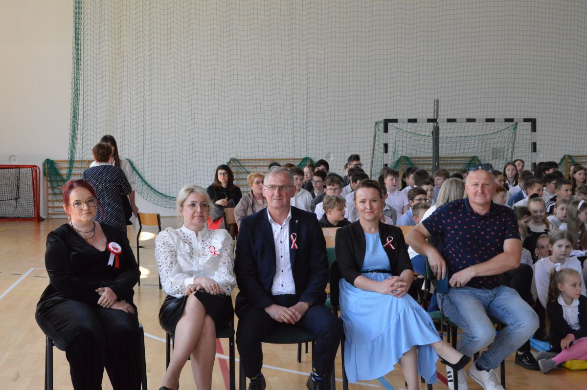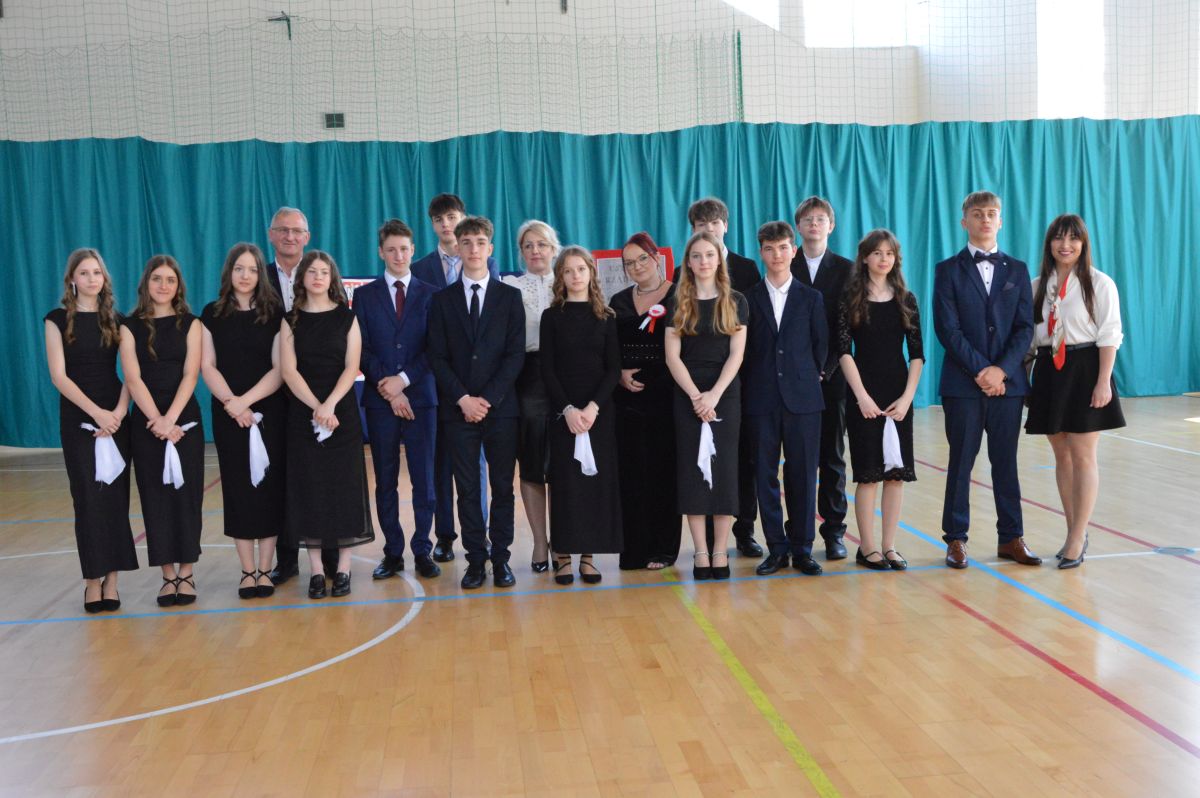 W tym roku uroczystość upamiętniająca Święto Trzeciego Maja wybrzmiała u nas trzema polonezami: „Trzeciego Maja”, „Pamięć w nas” i polonezem Kilara z Pana Tadeusza. Ten trzeci wytańczyła klasa 8b i było pięknie!. Wydarzenie przygotowały pani Dagmara i pani Beata. Nie zabrakło pani Renaty z chórem oraz skrzypaczek Moniki, Kingi i Emilki. Uroczystość uświetniła obecność zacnych gości, w osobach pana Wójta oraz radnych pana Tomasza Kotarby i pani Katarzyny Obrzud. Dało się również zauważyć panią Zofię, emerytowaną nauczycielkę naszej szkoły, która obserwowała wnuka prezentującego się w polonezie. Akademię zakończyła pani dyrektor Justyna Łękawska, życząc nam słonecznych majowych świąt. [PK]