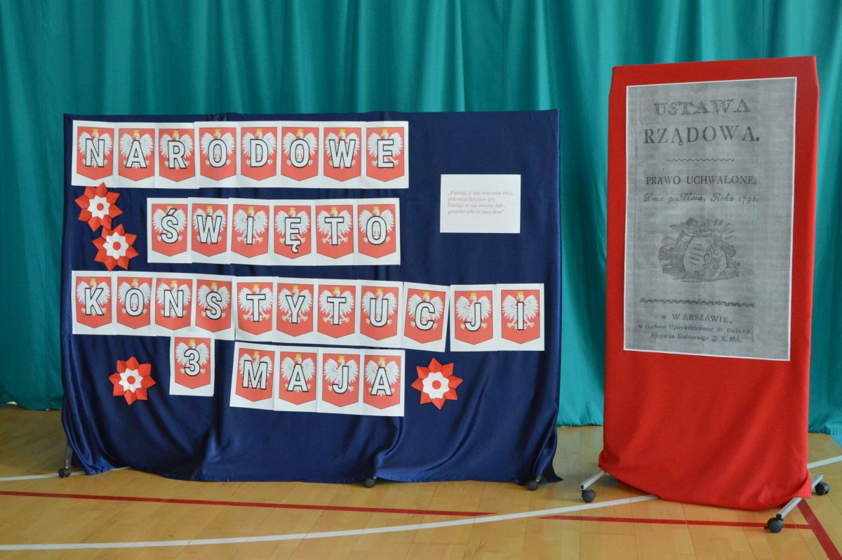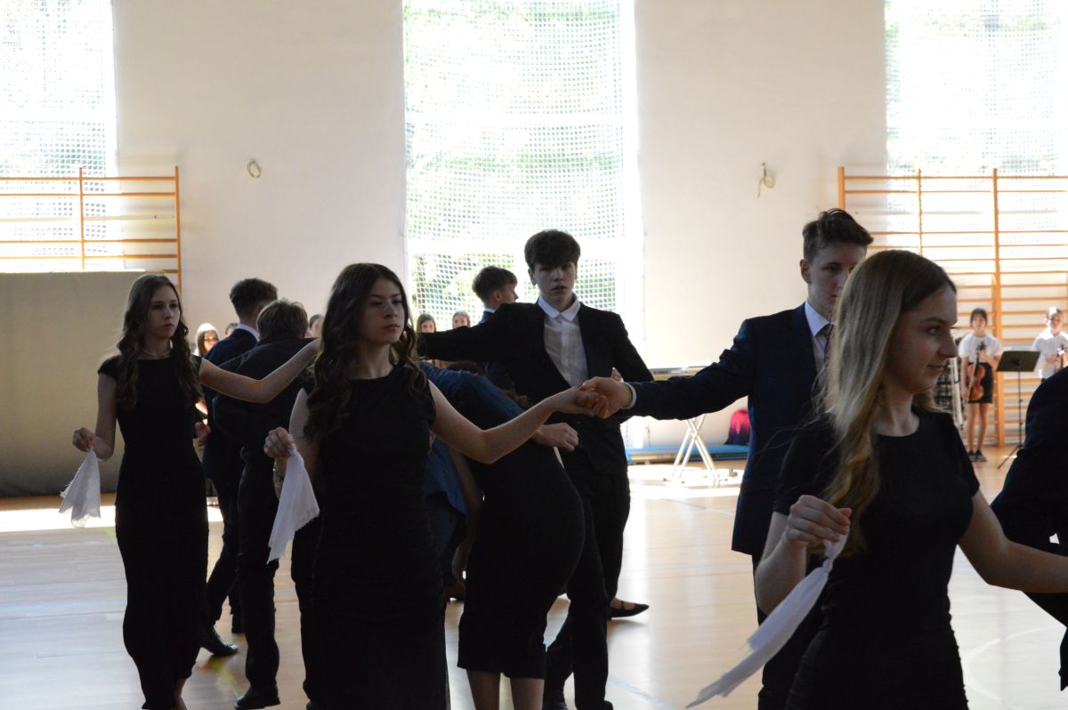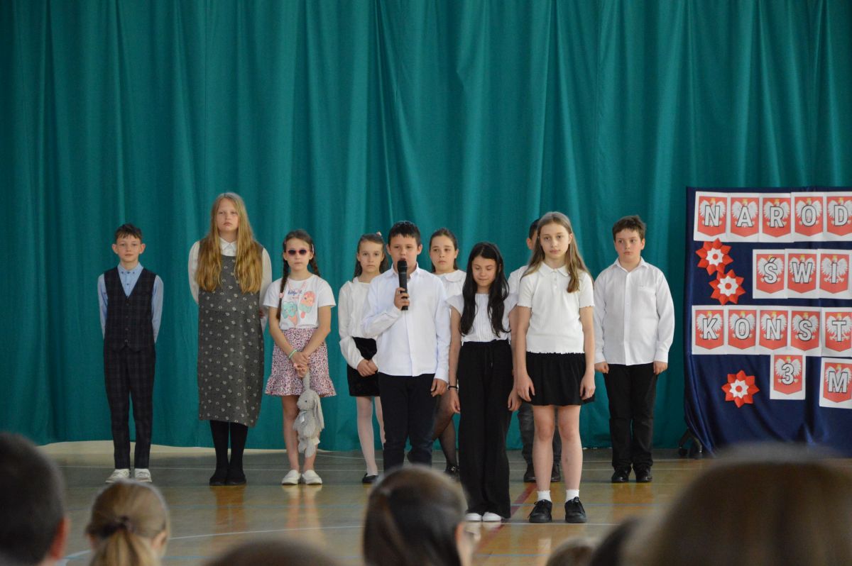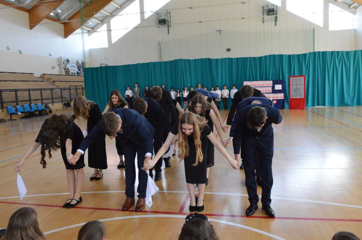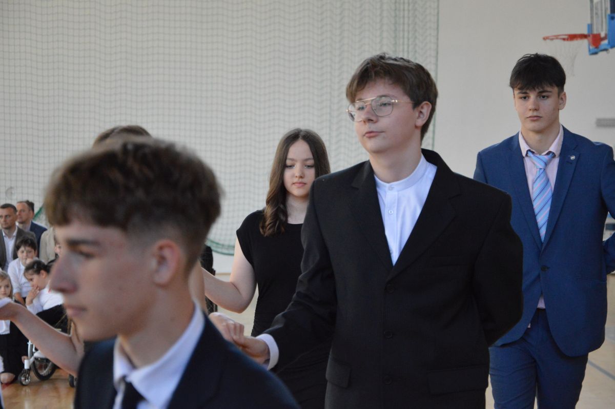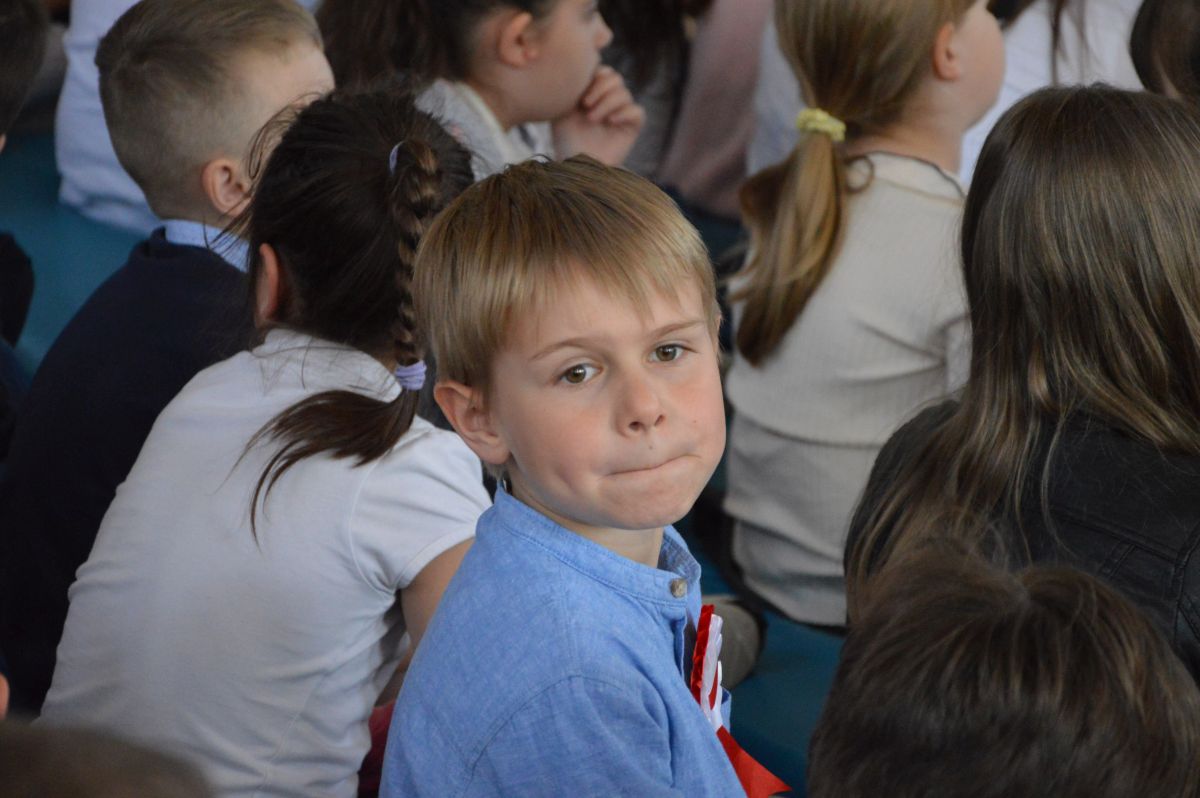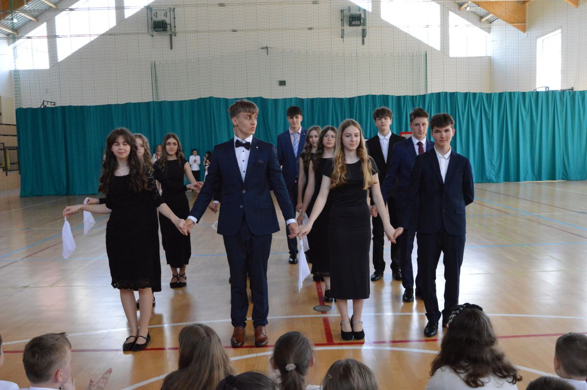 W tym roku uroczystość upamiętniająca Święto Trzeciego Maja wybrzmiała u nas trzema polonezami: „Trzeciego Maja”, „Pamięć w nas” i polonezem Kilara z Pana Tadeusza. Ten trzeci wytańczyła klasa 8b i było pięknie!. Wydarzenie przygotowały pani Dagmara i pani Beata. Nie zabrakło pani Renaty z chórem oraz skrzypaczek Moniki, Kingi i Emilki. Uroczystość uświetniła obecność zacnych gości, w osobach pana Wójta oraz radnych pana Tomasza Kotarby i pani Katarzyny Obrzud. Dało się również zauważyć panią Zofię, emerytowaną nauczycielkę naszej szkoły, która obserwowała wnuka prezentującego się w polonezie. Akademię zakończyła pani dyrektor Justyna Łękawska, życząc nam słonecznych majowych świąt. [PK]
