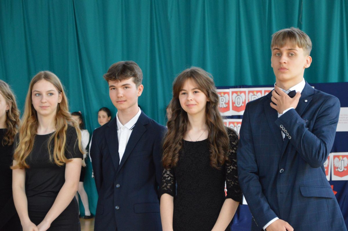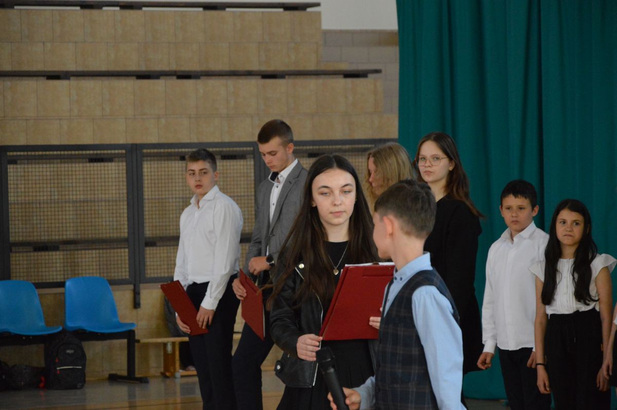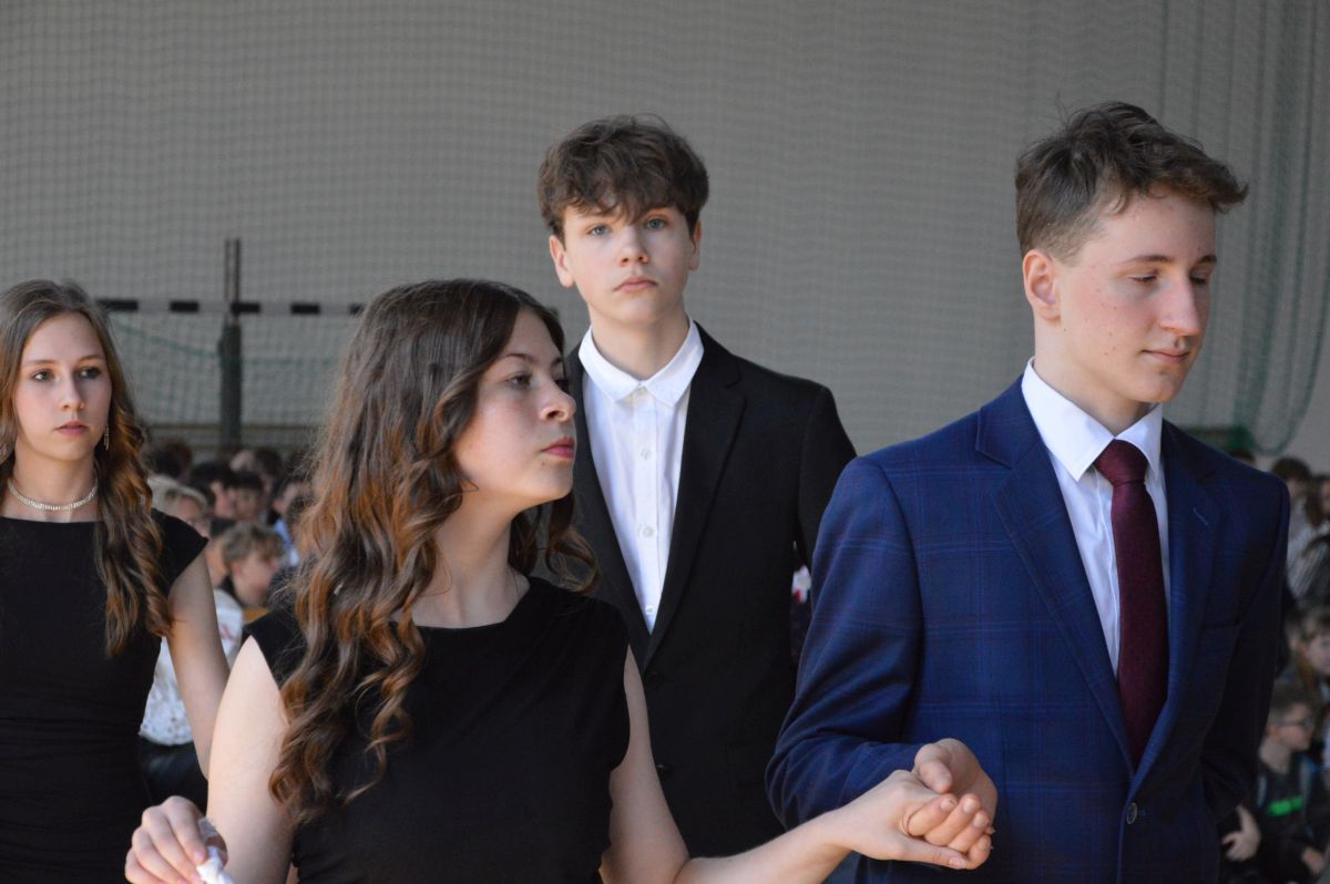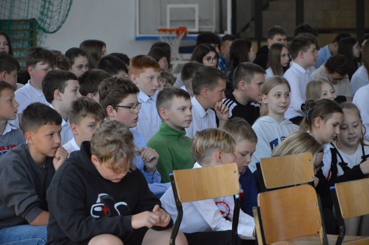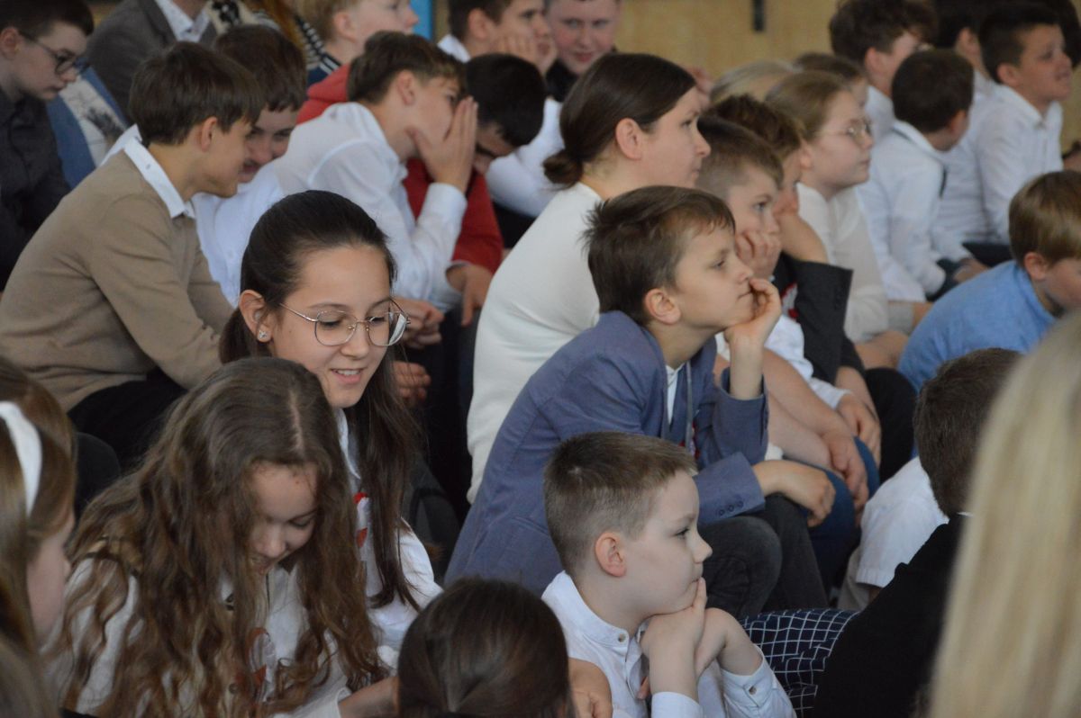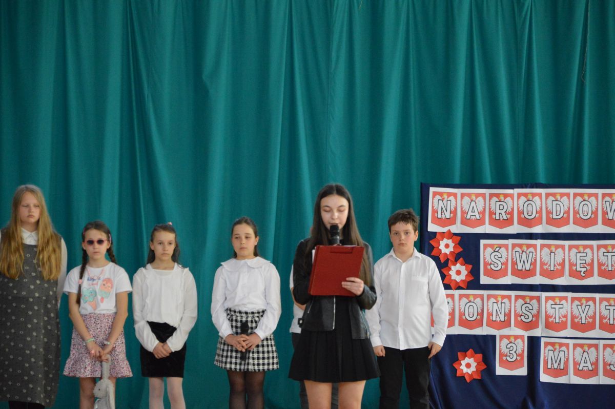 W tym roku uroczystość upamiętniająca Święto Trzeciego Maja wybrzmiała u nas trzema polonezami: „Trzeciego Maja”, „Pamięć w nas” i polonezem Kilara z Pana Tadeusza. Ten trzeci wytańczyła klasa 8b i było pięknie!. Wydarzenie przygotowały pani Dagmara i pani Beata. Nie zabrakło pani Renaty z chórem oraz skrzypaczek Moniki, Kingi i Emilki. Uroczystość uświetniła obecność zacnych gości, w osobach pana Wójta oraz radnych pana Tomasza Kotarby i pani Katarzyny Obrzud. Dało się również zauważyć panią Zofię, emerytowaną nauczycielkę naszej szkoły, która obserwowała wnuka prezentującego się w polonezie. Akademię zakończyła pani dyrektor Justyna Łękawska, życząc nam słonecznych majowych świąt. [PK]