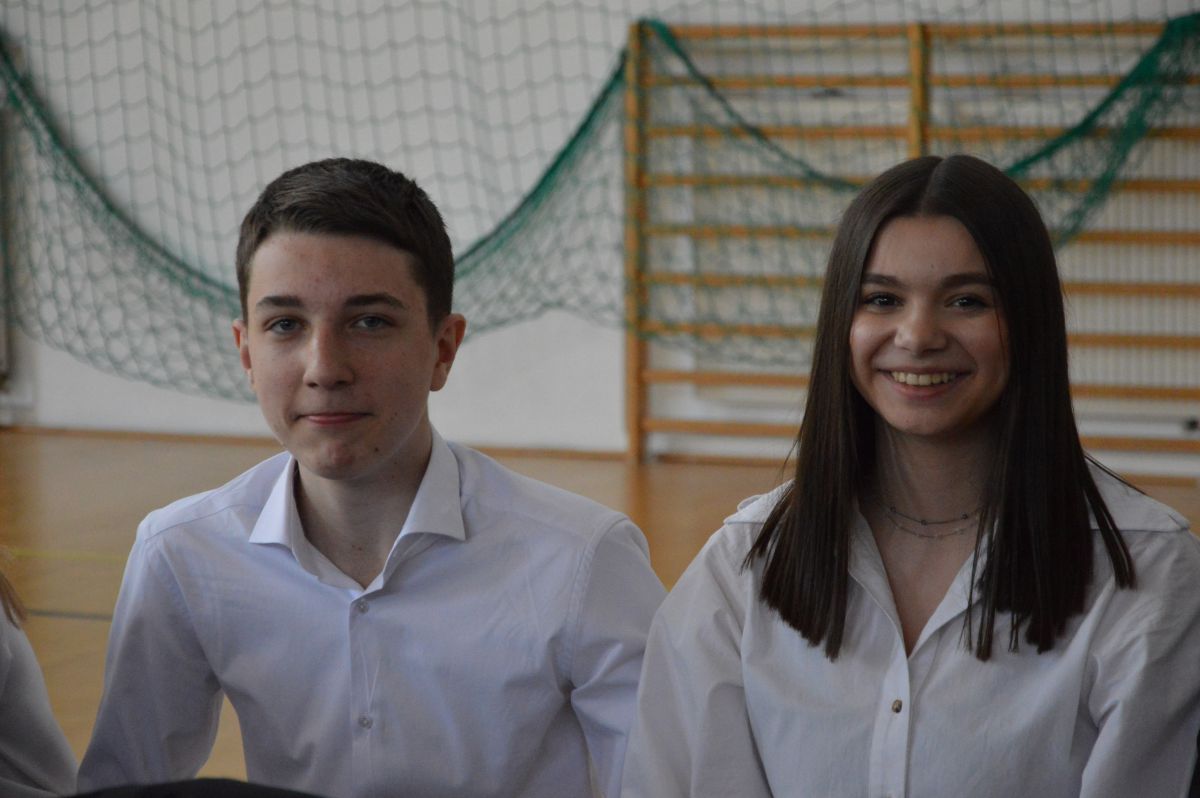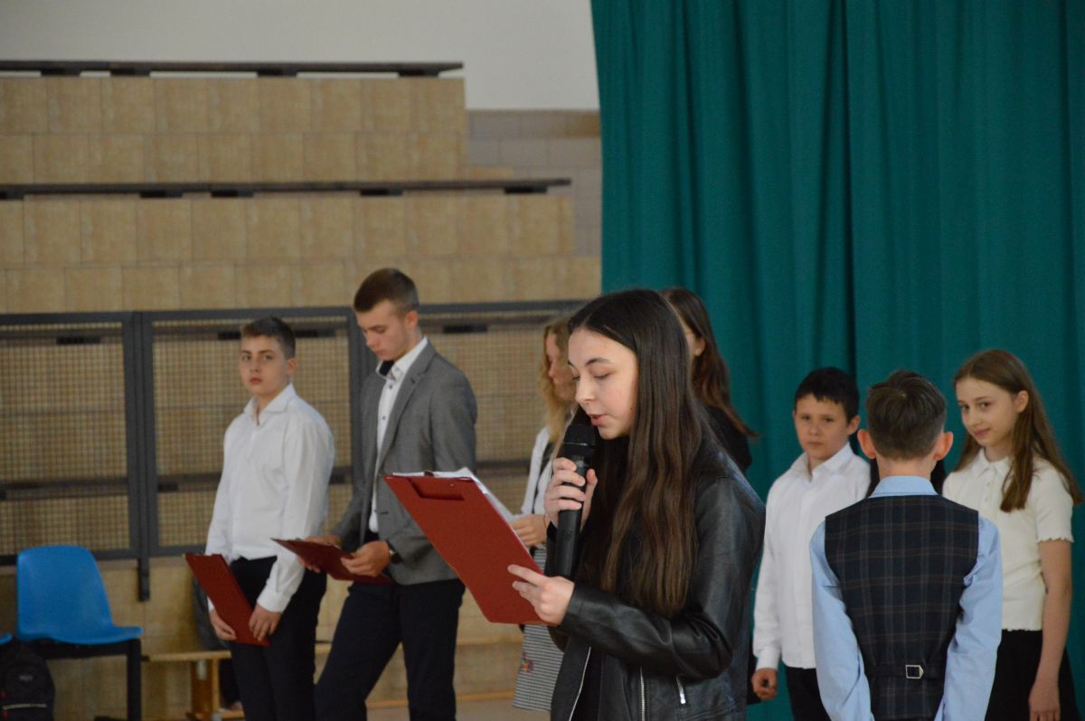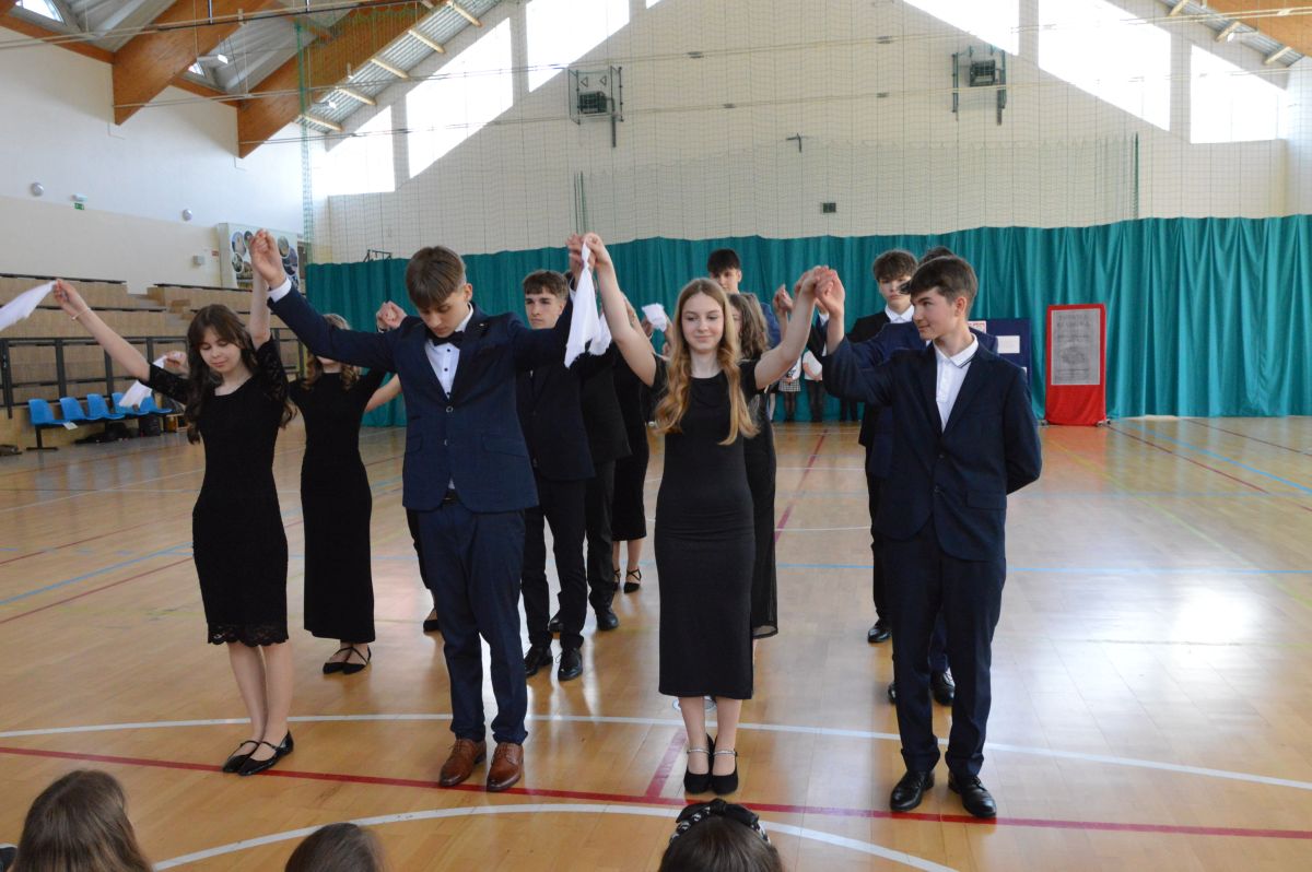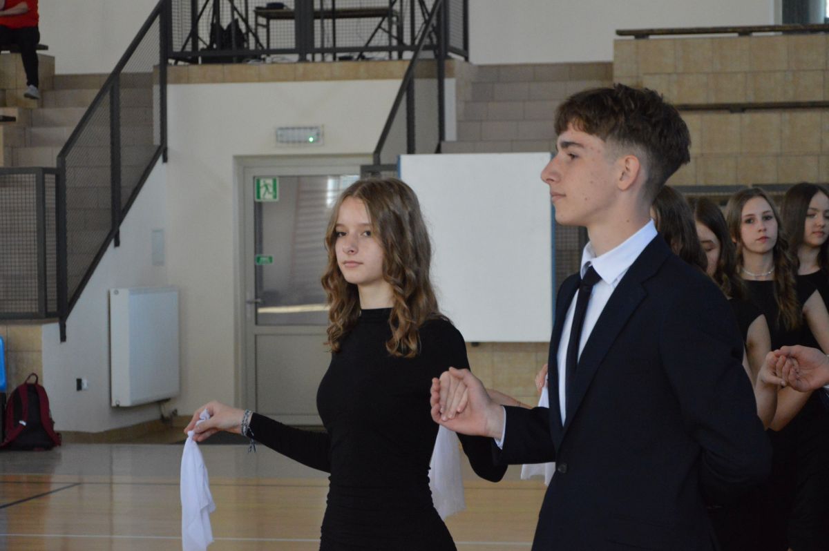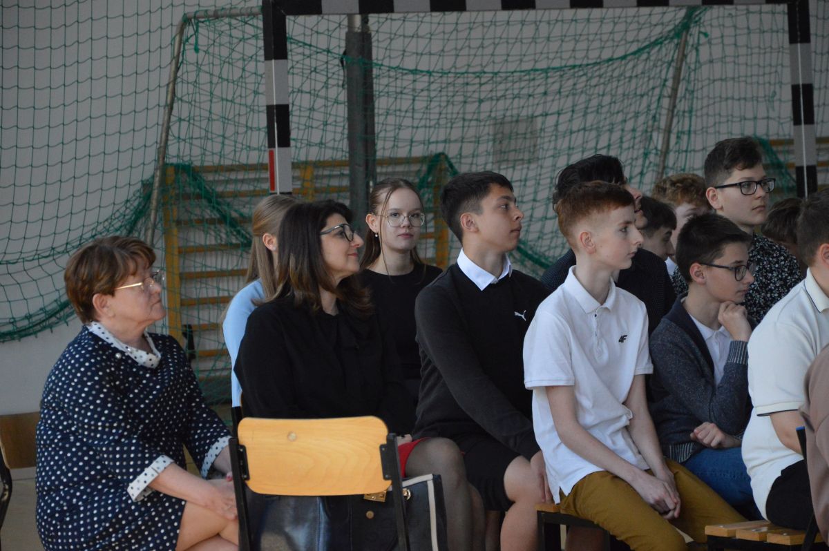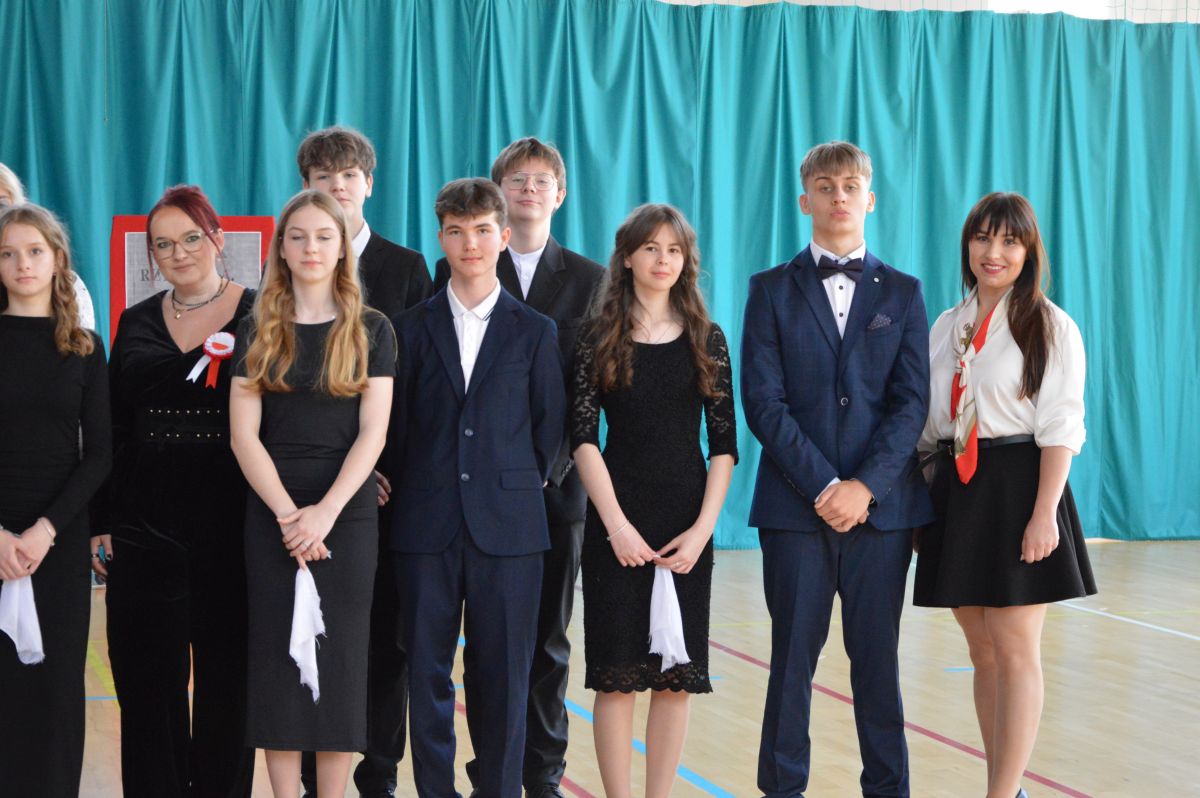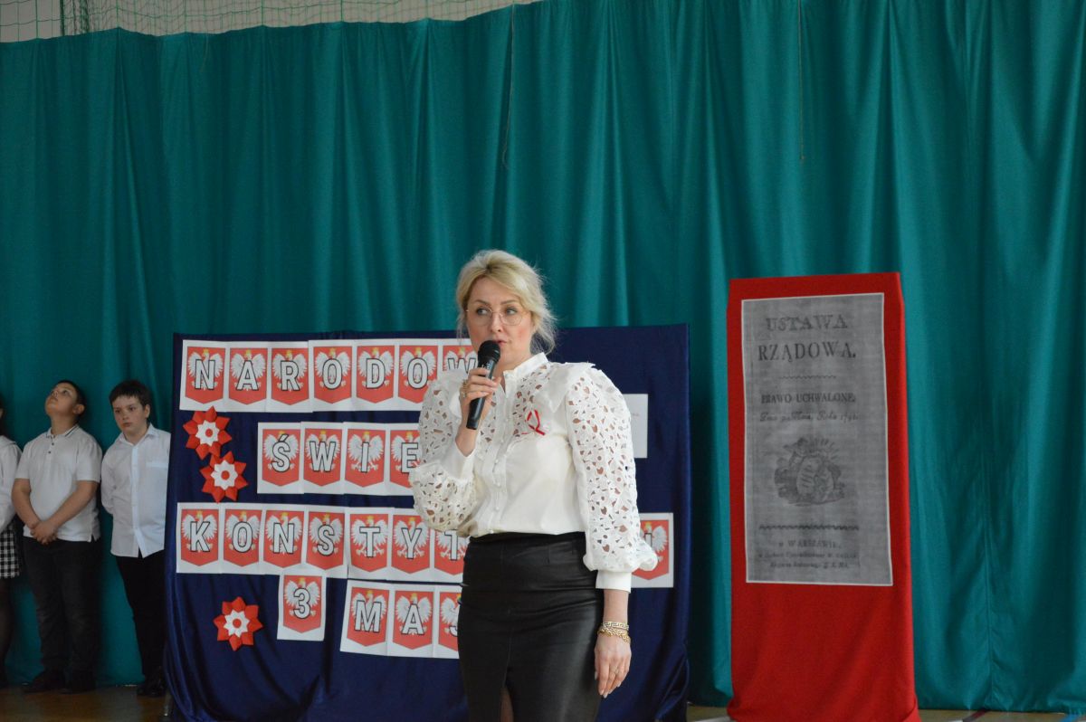 W tym roku uroczystość upamiętniająca Święto Trzeciego Maja wybrzmiała u nas trzema polonezami: „Trzeciego Maja”, „Pamięć w nas” i polonezem Kilara z Pana Tadeusza. Ten trzeci wytańczyła klasa 8b i było pięknie!. Wydarzenie przygotowały pani Dagmara i pani Beata. Nie zabrakło pani Renaty z chórem oraz skrzypaczek Moniki, Kingi i Emilki. Uroczystość uświetniła obecność zacnych gości, w osobach pana Wójta oraz radnych pana Tomasza Kotarby i pani Katarzyny Obrzud. Dało się również zauważyć panią Zofię, emerytowaną nauczycielkę naszej szkoły, która obserwowała wnuka prezentującego się w polonezie. Akademię zakończyła pani dyrektor Justyna Łękawska, życząc nam słonecznych majowych świąt. [PK]