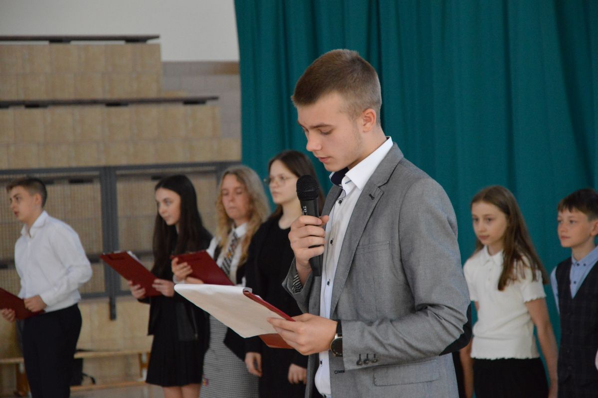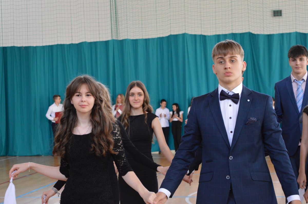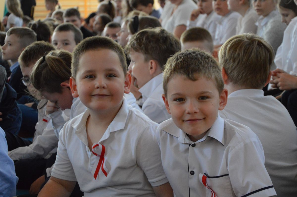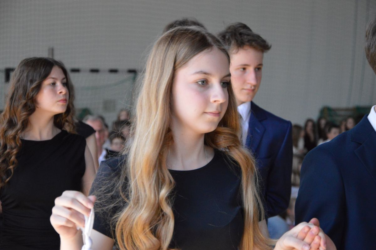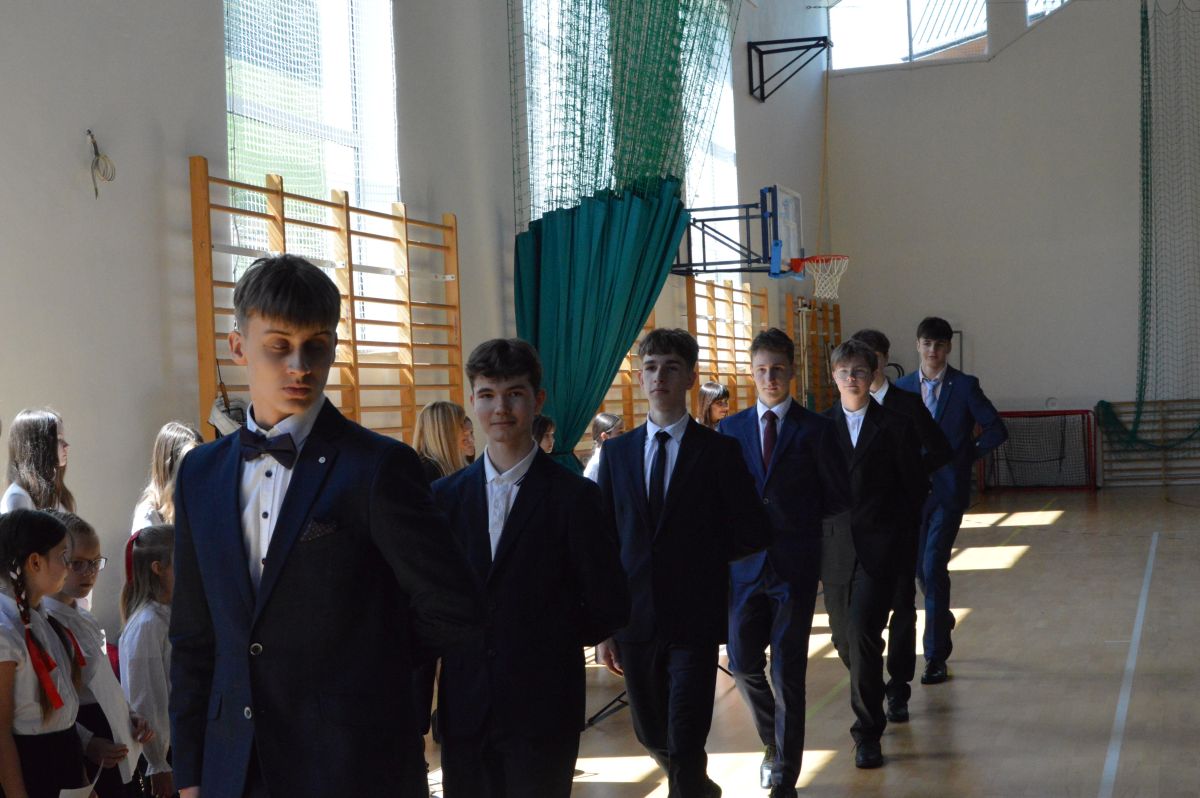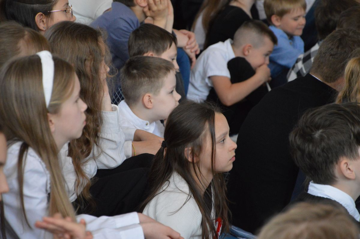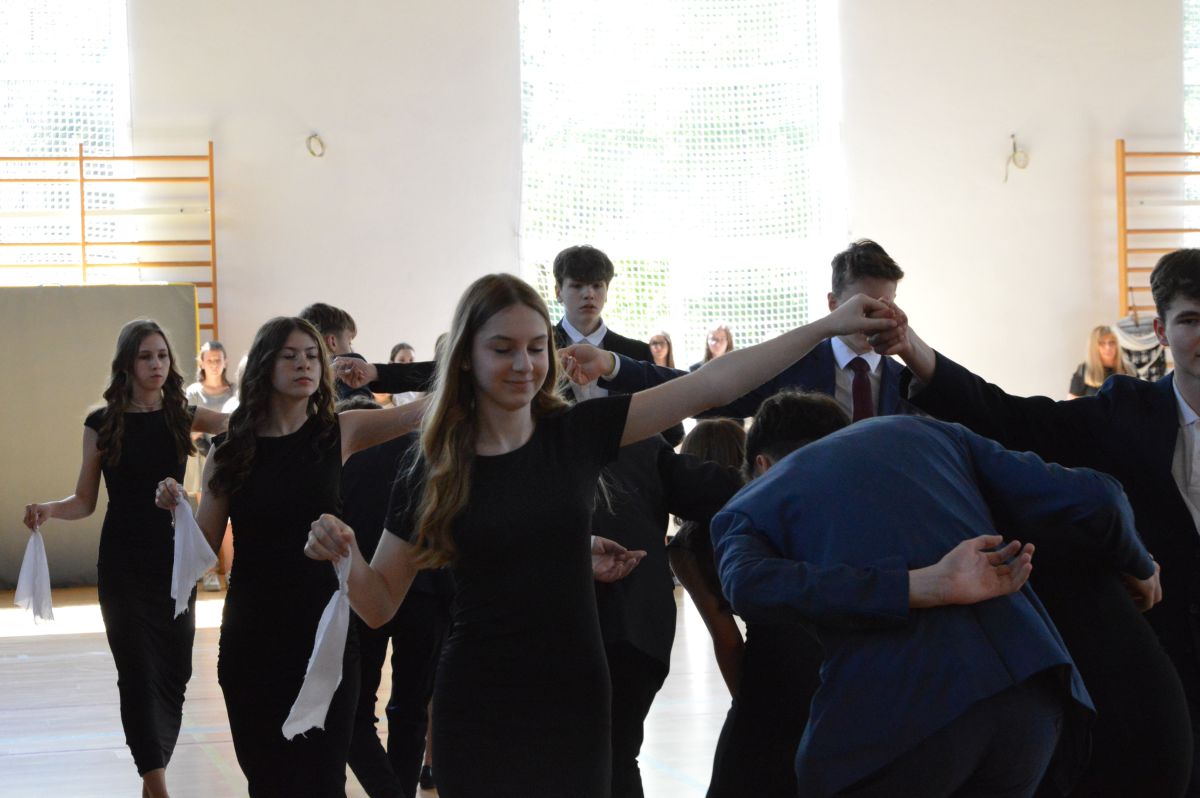 W tym roku uroczystość upamiętniająca Święto Trzeciego Maja wybrzmiała u nas trzema polonezami: „Trzeciego Maja”, „Pamięć w nas” i polonezem Kilara z Pana Tadeusza. Ten trzeci wytańczyła klasa 8b i było pięknie!. Wydarzenie przygotowały pani Dagmara i pani Beata. Nie zabrakło pani Renaty z chórem oraz skrzypaczek Moniki, Kingi i Emilki. Uroczystość uświetniła obecność zacnych gości, w osobach pana Wójta oraz radnych pana Tomasza Kotarby i pani Katarzyny Obrzud. Dało się również zauważyć panią Zofię, emerytowaną nauczycielkę naszej szkoły, która obserwowała wnuka prezentującego się w polonezie. Akademię zakończyła pani dyrektor Justyna Łękawska, życząc nam słonecznych majowych świąt. [PK]