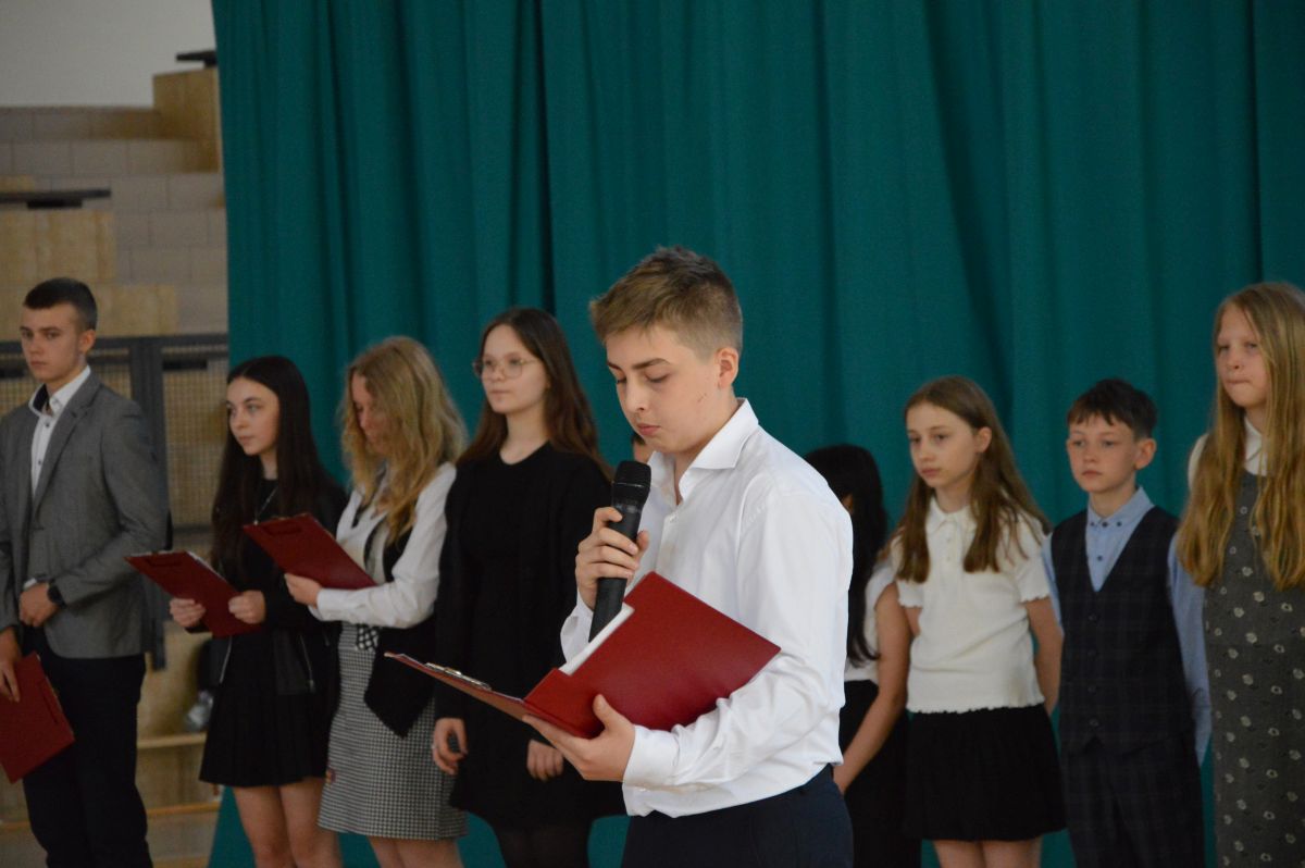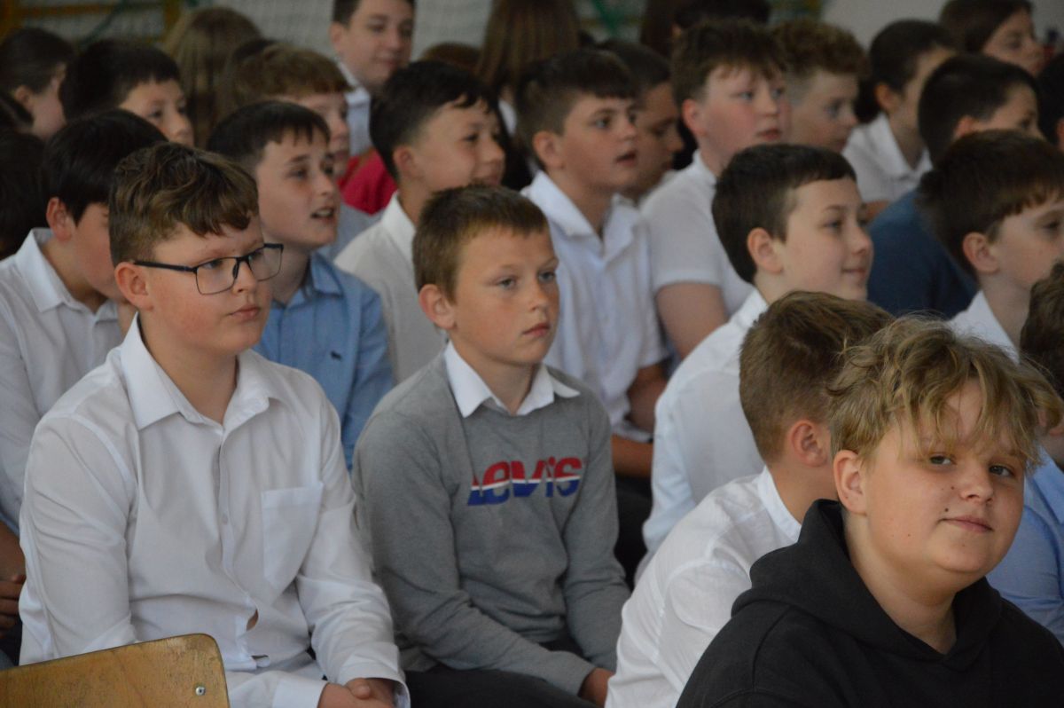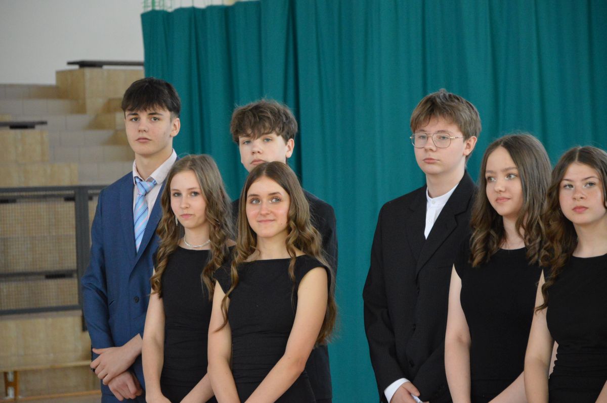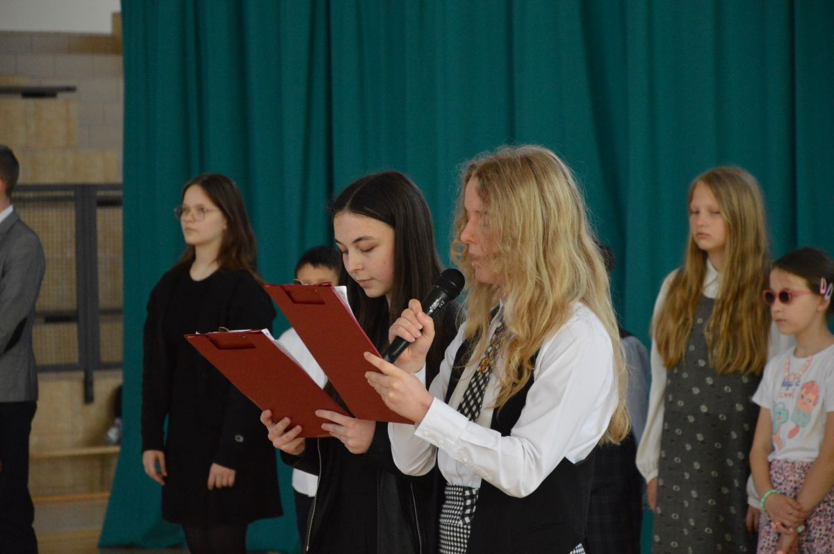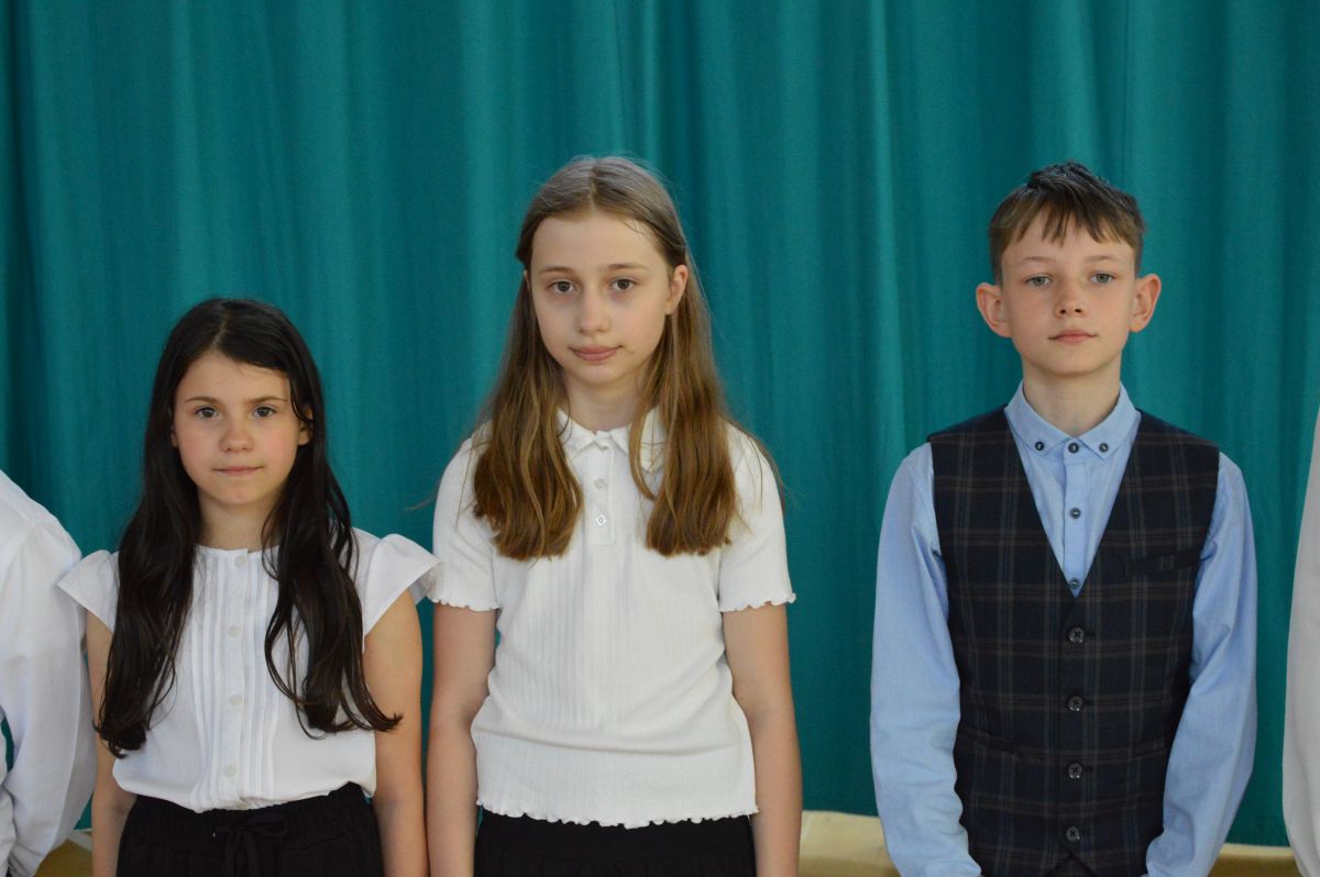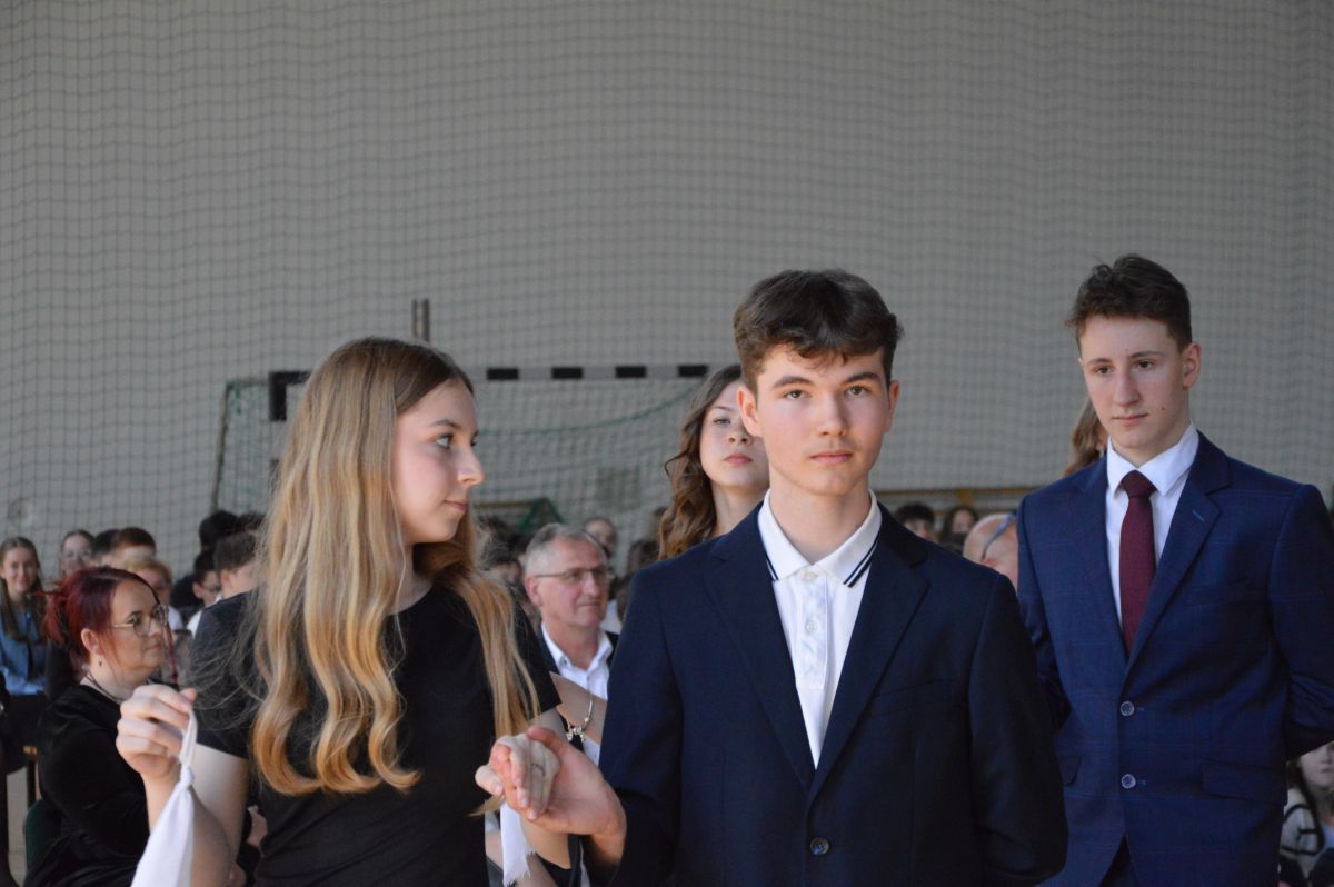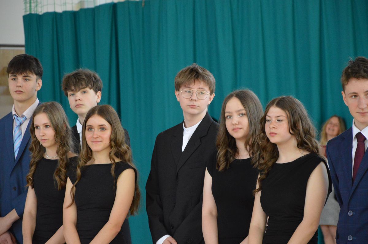 W tym roku uroczystość upamiętniająca Święto Trzeciego Maja wybrzmiała u nas trzema polonezami: „Trzeciego Maja”, „Pamięć w nas” i polonezem Kilara z Pana Tadeusza. Ten trzeci wytańczyła klasa 8b i było pięknie!. Wydarzenie przygotowały pani Dagmara i pani Beata. Nie zabrakło pani Renaty z chórem oraz skrzypaczek Moniki, Kingi i Emilki. Uroczystość uświetniła obecność zacnych gości, w osobach pana Wójta oraz radnych pana Tomasza Kotarby i pani Katarzyny Obrzud. Dało się również zauważyć panią Zofię, emerytowaną nauczycielkę naszej szkoły, która obserwowała wnuka prezentującego się w polonezie. Akademię zakończyła pani dyrektor Justyna Łękawska, życząc nam słonecznych majowych świąt. [PK]