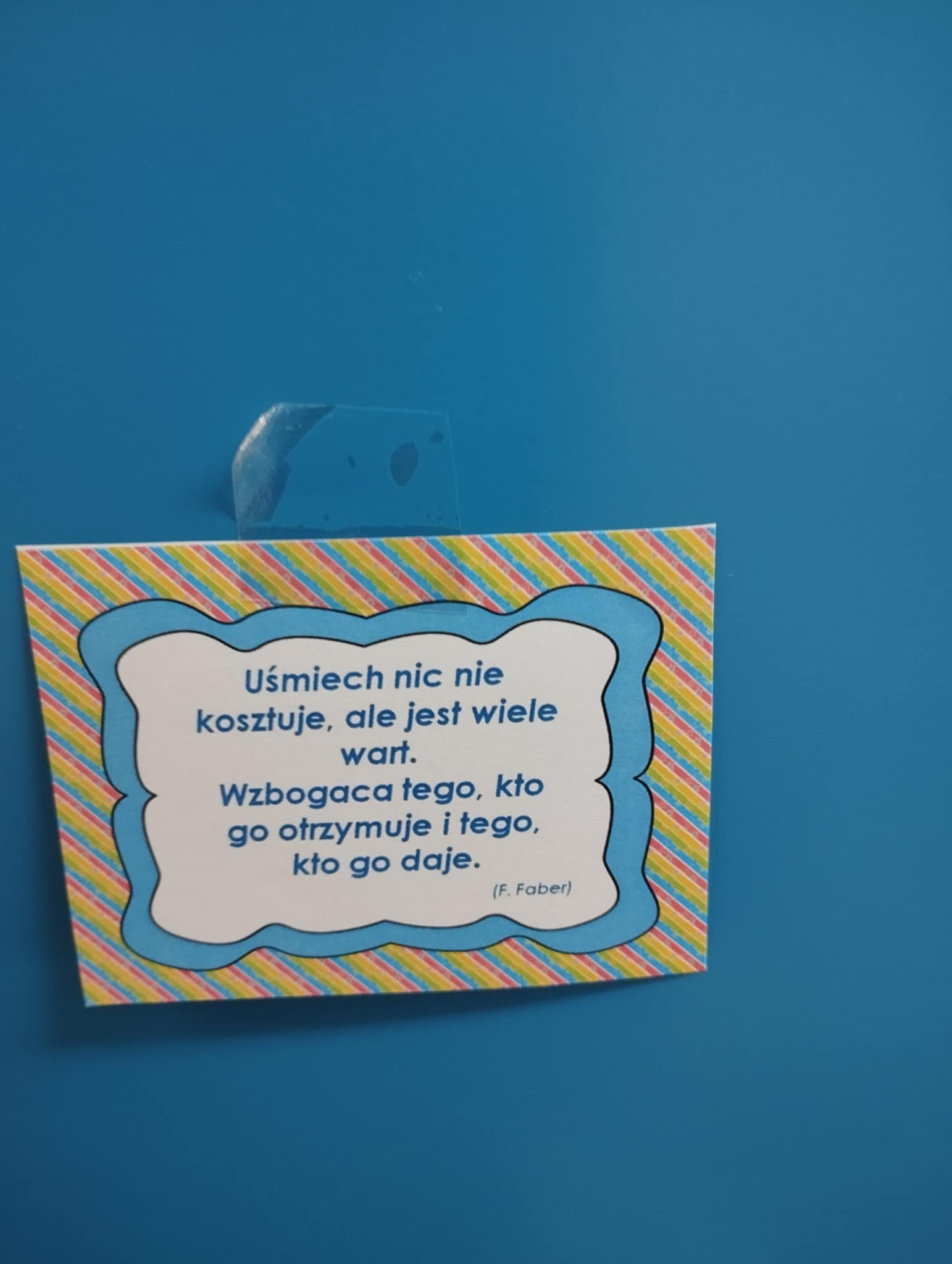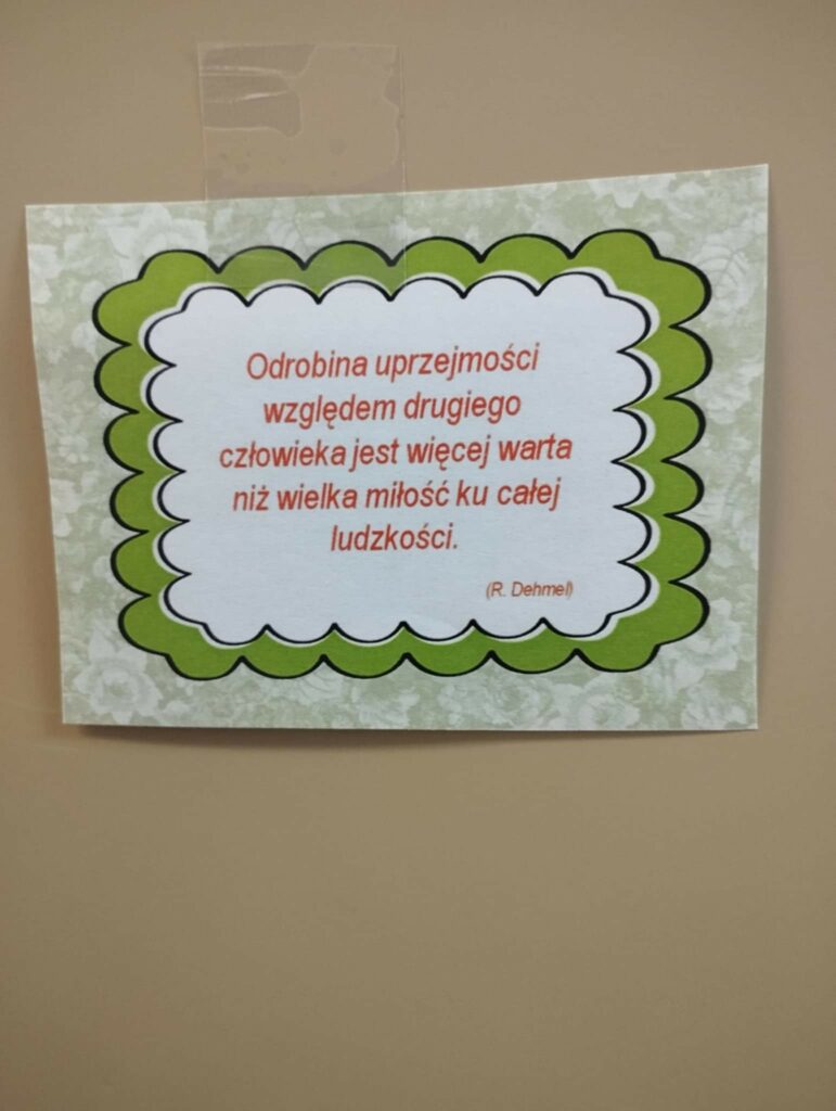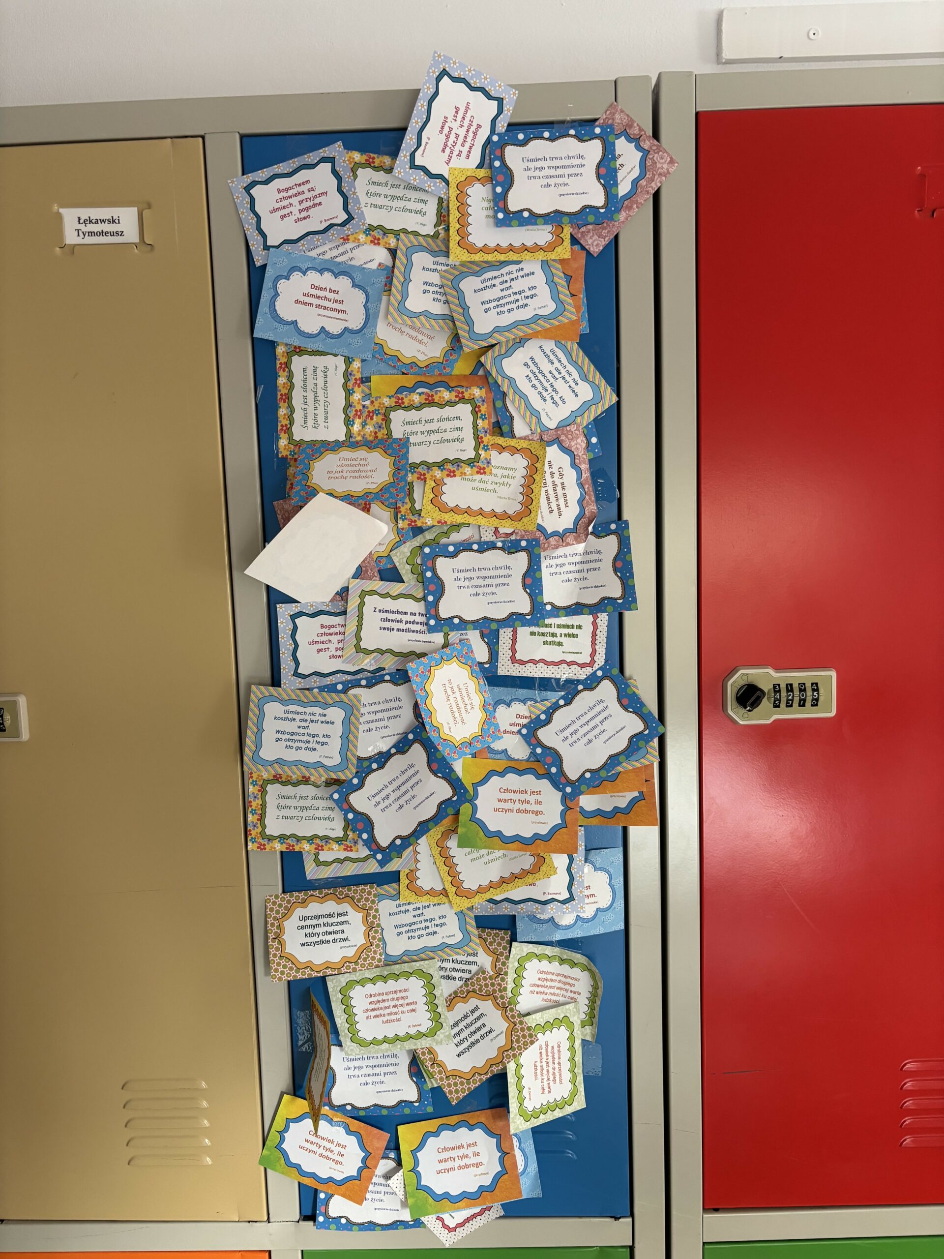 Ponadto pani pedagog, mgr Justyna Dulak, zawiesiła na szafce każdemu uczniowi cytat dotyczący życzliwości. Uczennice klasy 8b przeprowadziły w klasach młodszych lekcje poświęcone empatii i komunikacji – zajęcia dotyczące wzajemnego szacunku, rozwiązywania konfliktów oraz dbania o dobre relacje.