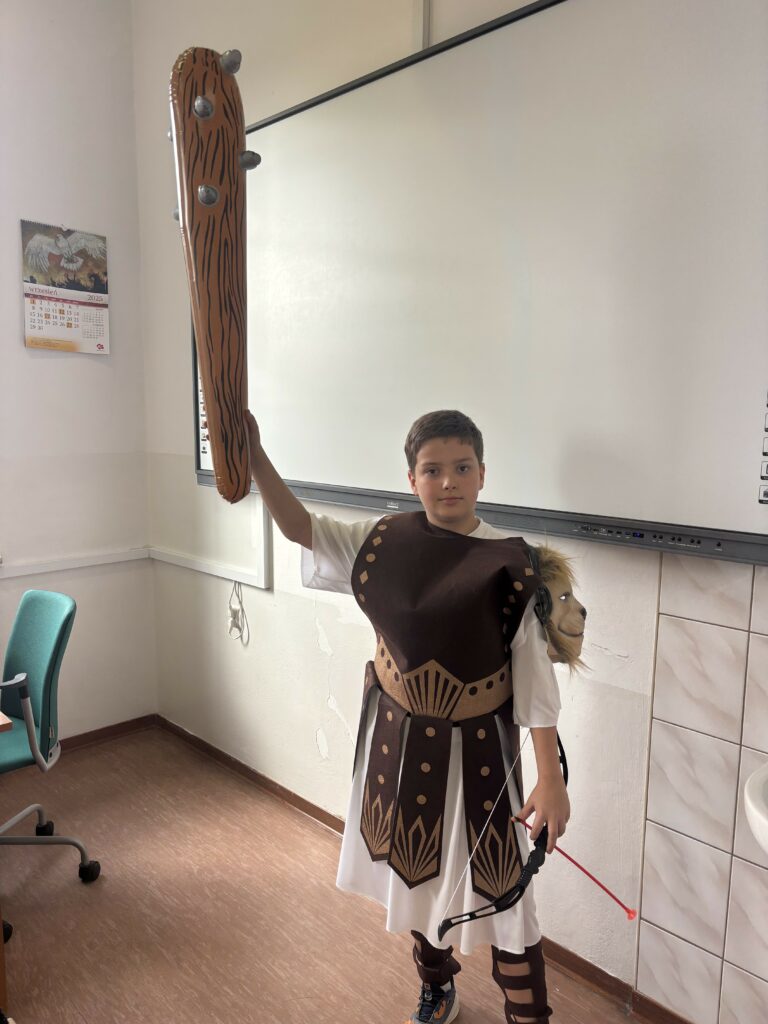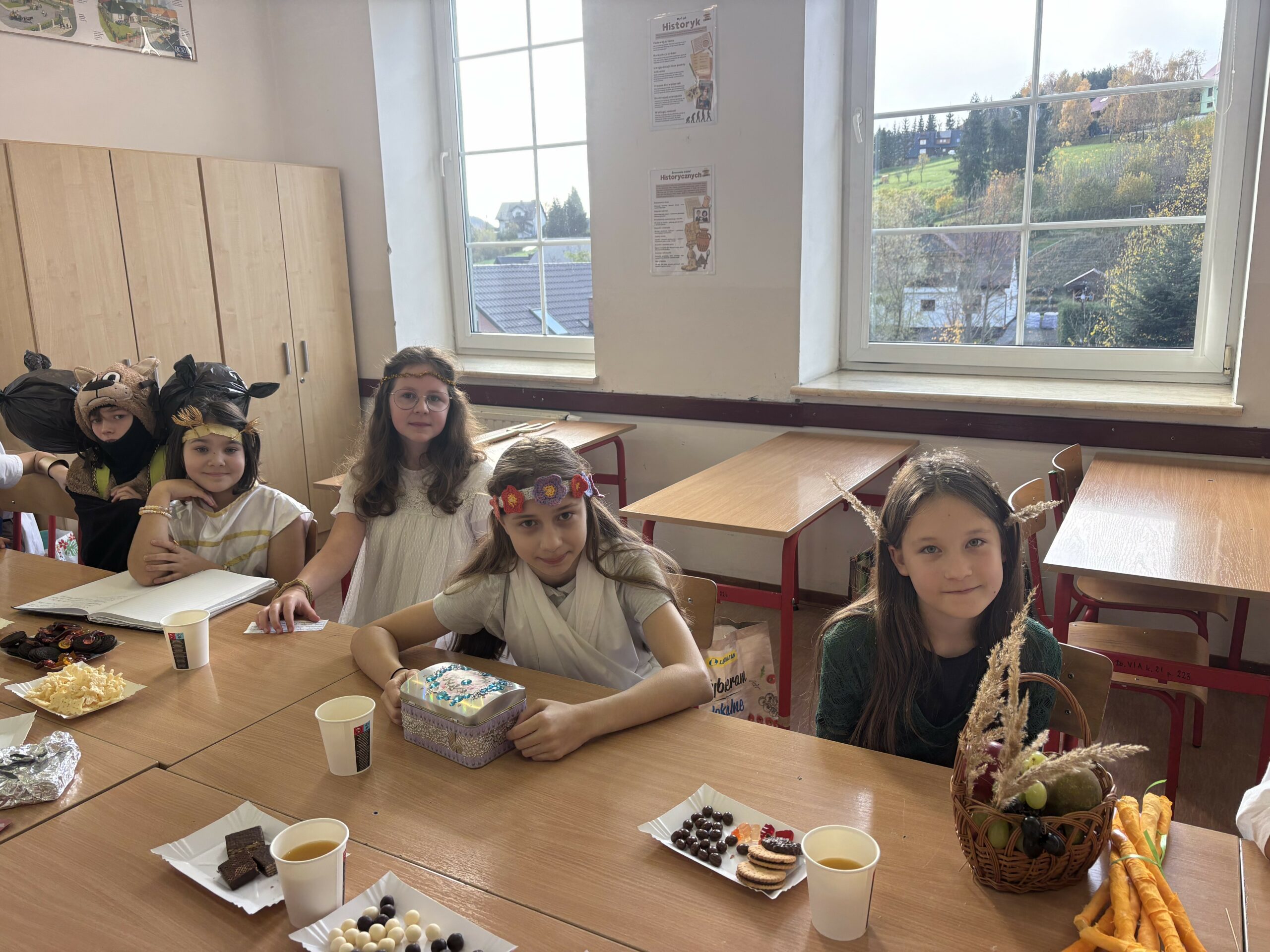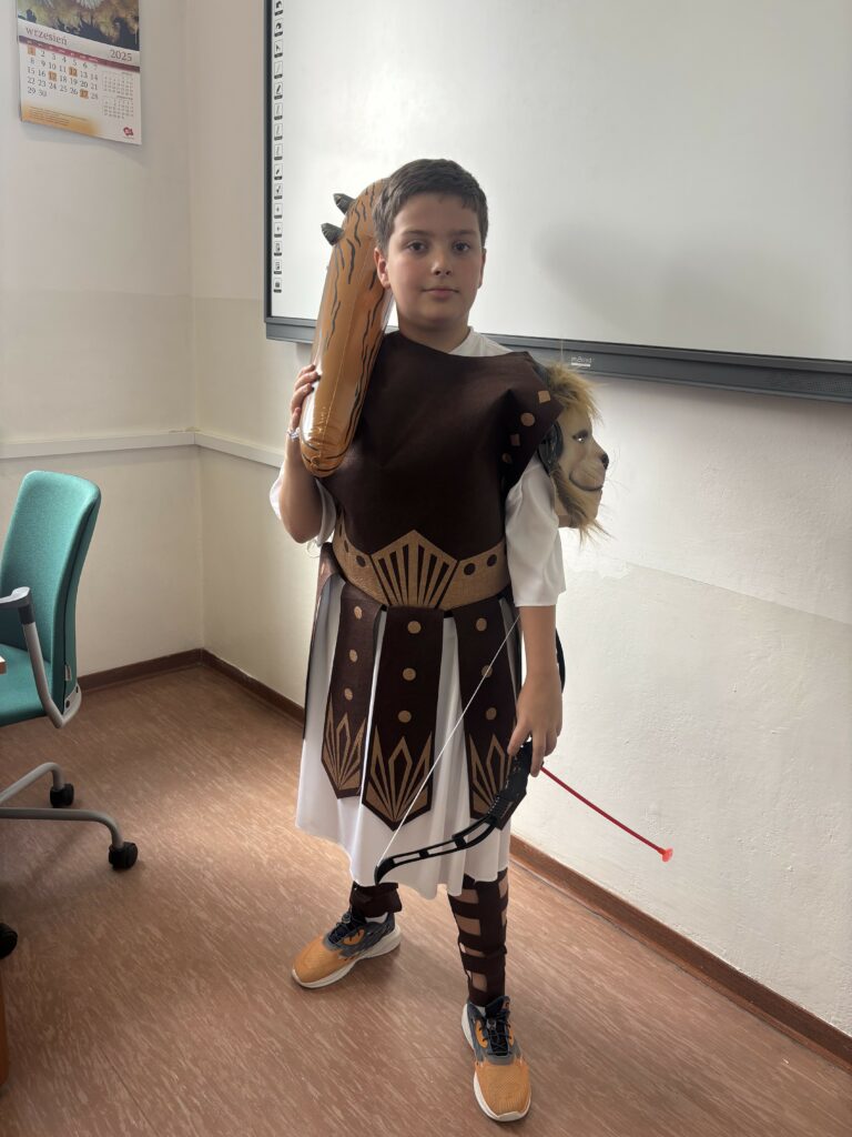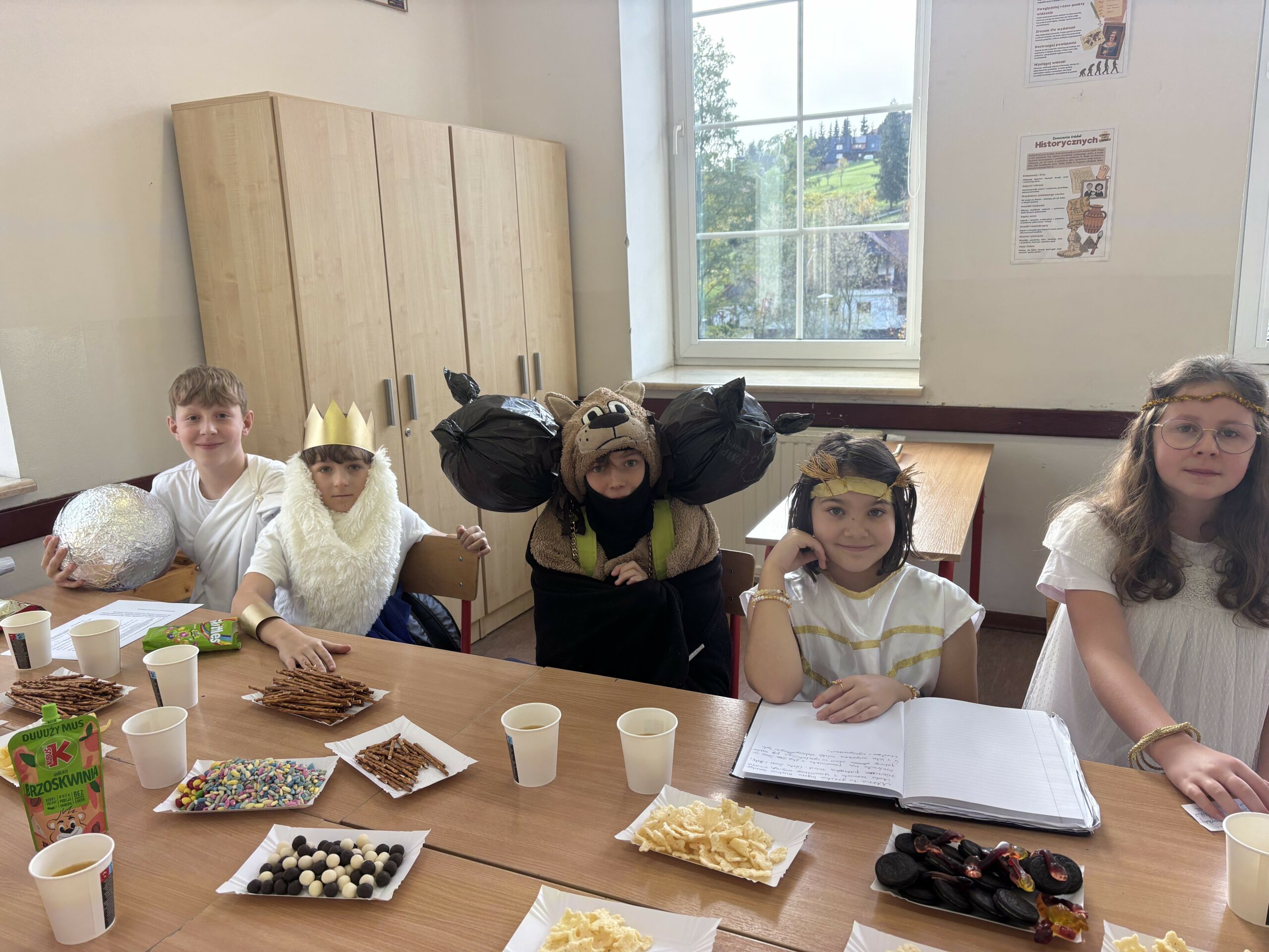28 października, podczas lekcji języka polskiego, uczniowie klasy 5a przenieśli się na mityczny Olimp, gdzie odbyła się niezwykła uczta bogów i herosów. W ramach projektu edukacyjnego piątoklasiści wcielili się w postacie z mitologii greckiej — przygotowali stroje, atrybuty oraz ciekawie zaprezentowali najważniejsze informacje o wylosowanych bohaterach. W czasie uczty uczestnicy raczyli się ambrozją i boskim nektarem, tworząc prawdziwie olimpijską atmosferę. Zajęcia stanowiły znakomitą okazję do utrwalenia wiedzy o mitologii greckiej przed nadchodzącym sprawdzianem, rozwijania kreatywności oraz umiejętności prezentacji swojej wypowiedzi przed publicznością. [DK]
