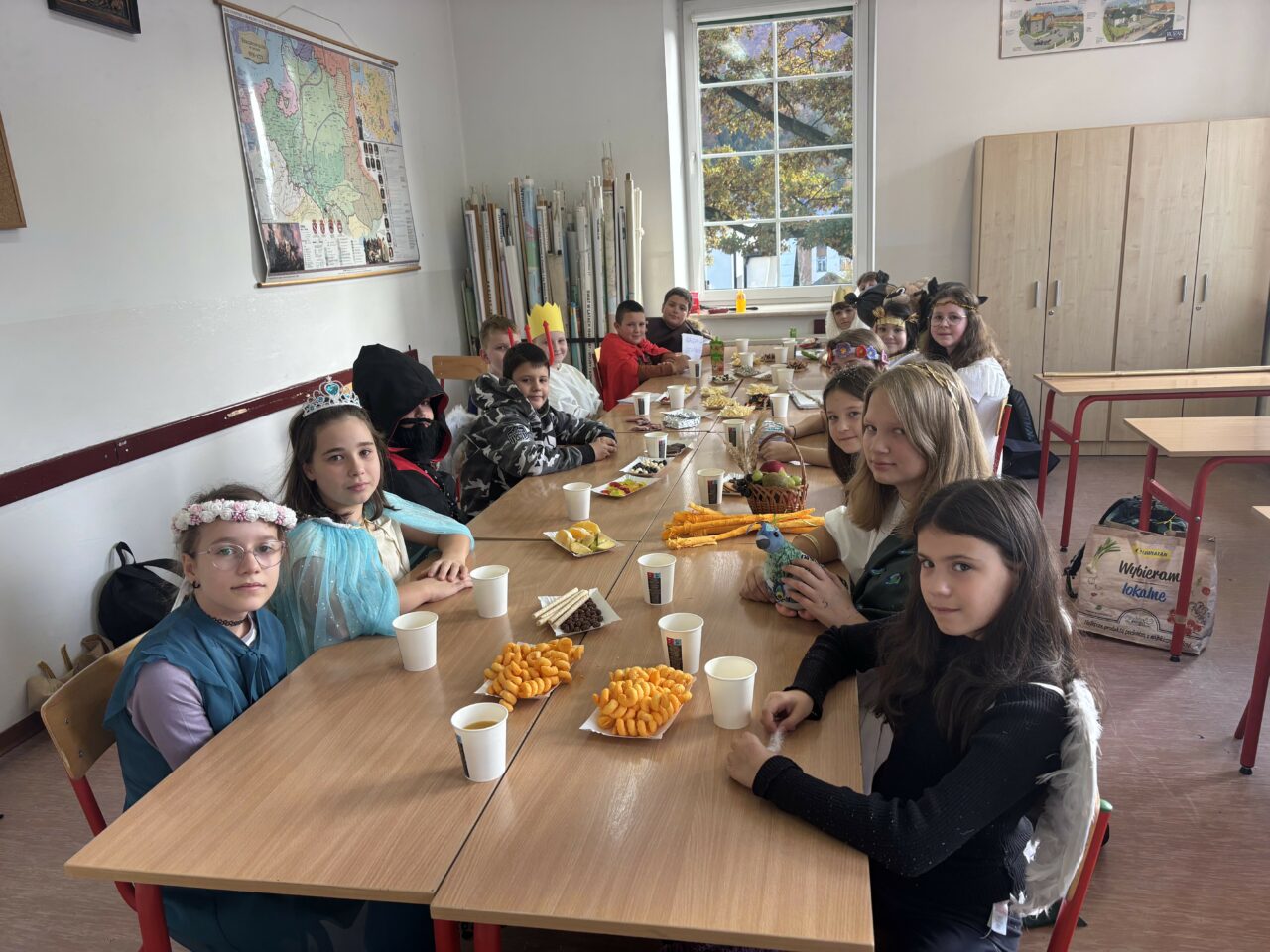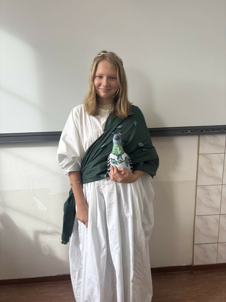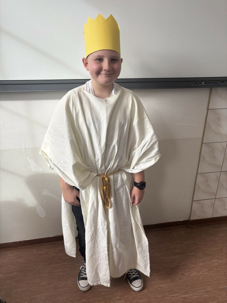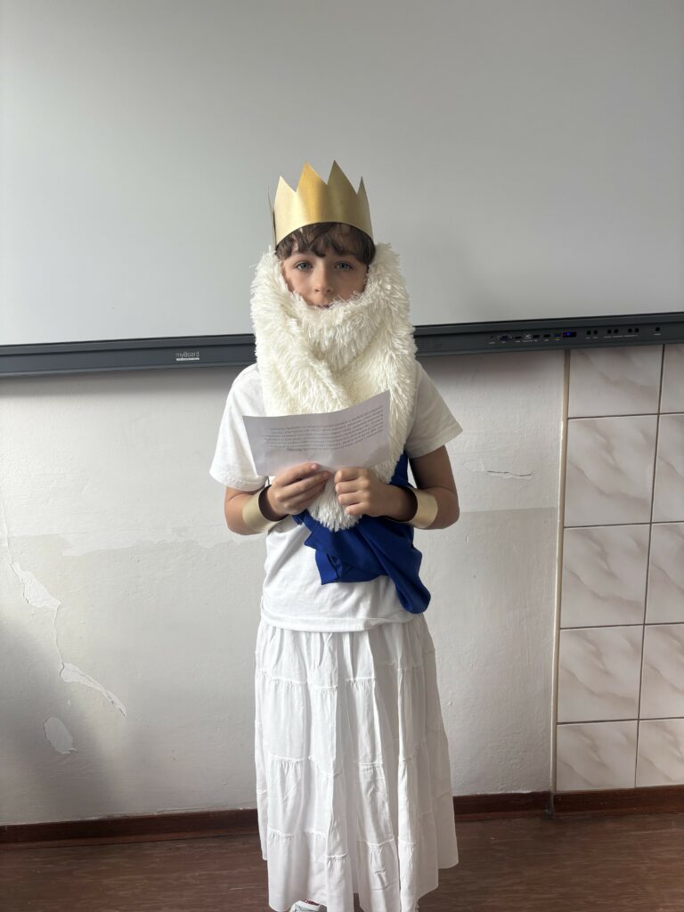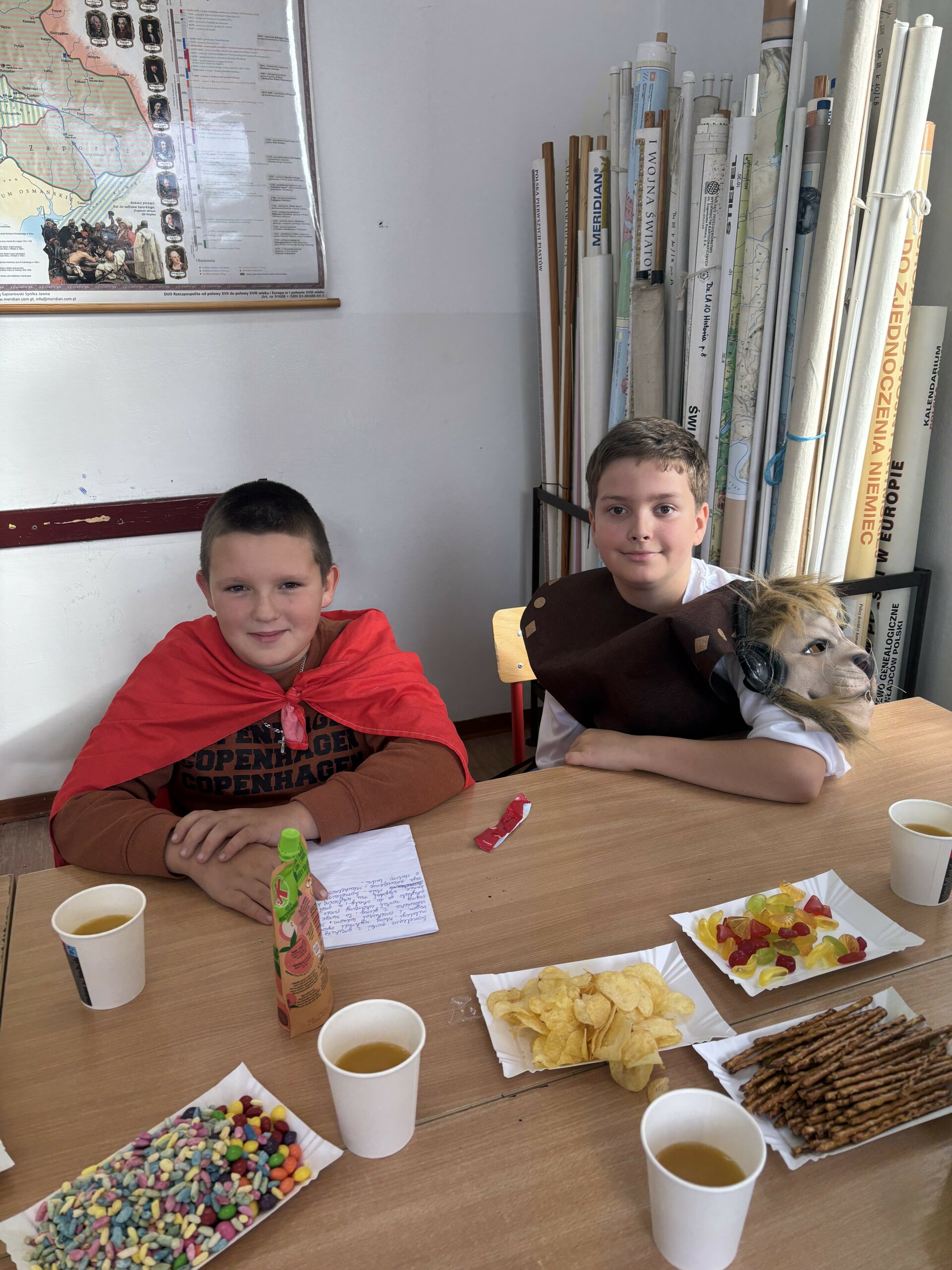28 października, podczas lekcji języka polskiego, uczniowie klasy 5a przenieśli się na mityczny Olimp, gdzie odbyła się niezwykła uczta bogów i herosów. W ramach projektu edukacyjnego piątoklasiści wcielili się w postacie z mitologii greckiej — przygotowali stroje, atrybuty oraz ciekawie zaprezentowali najważniejsze informacje o wylosowanych bohaterach. W czasie uczty uczestnicy raczyli się ambrozją i boskim nektarem, tworząc prawdziwie olimpijską atmosferę. Zajęcia stanowiły znakomitą okazję do utrwalenia wiedzy o mitologii greckiej przed nadchodzącym sprawdzianem, rozwijania kreatywności oraz umiejętności prezentacji swojej wypowiedzi przed publicznością. [DK]