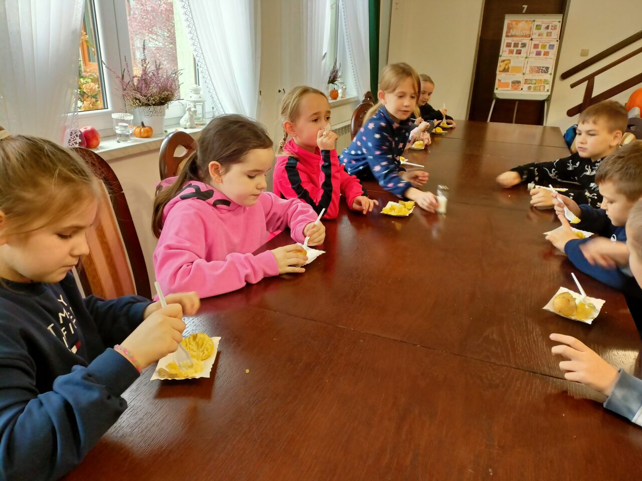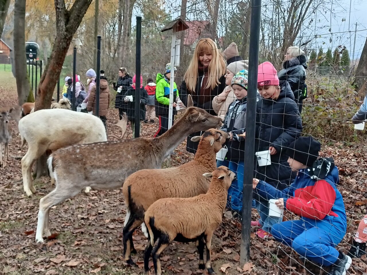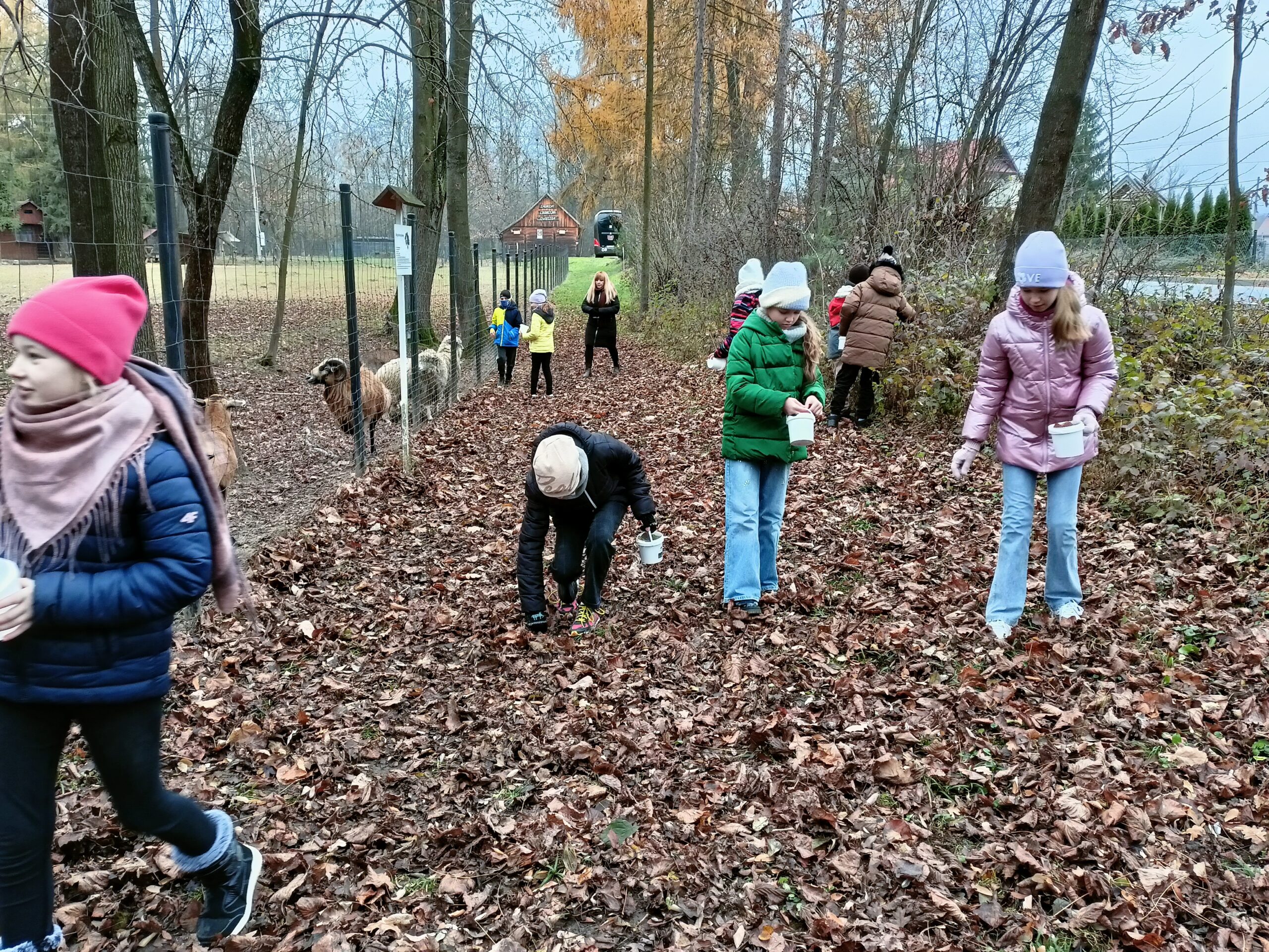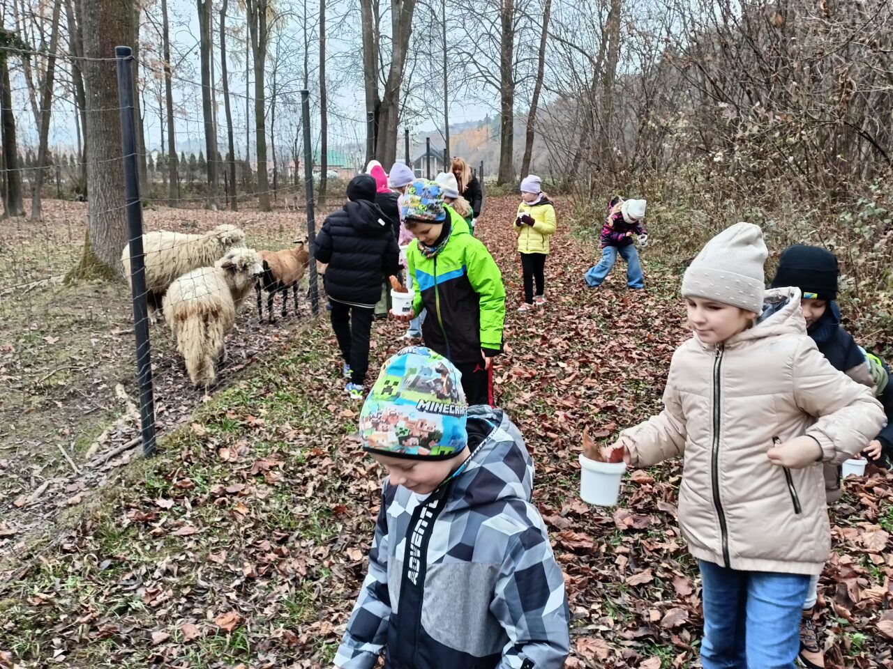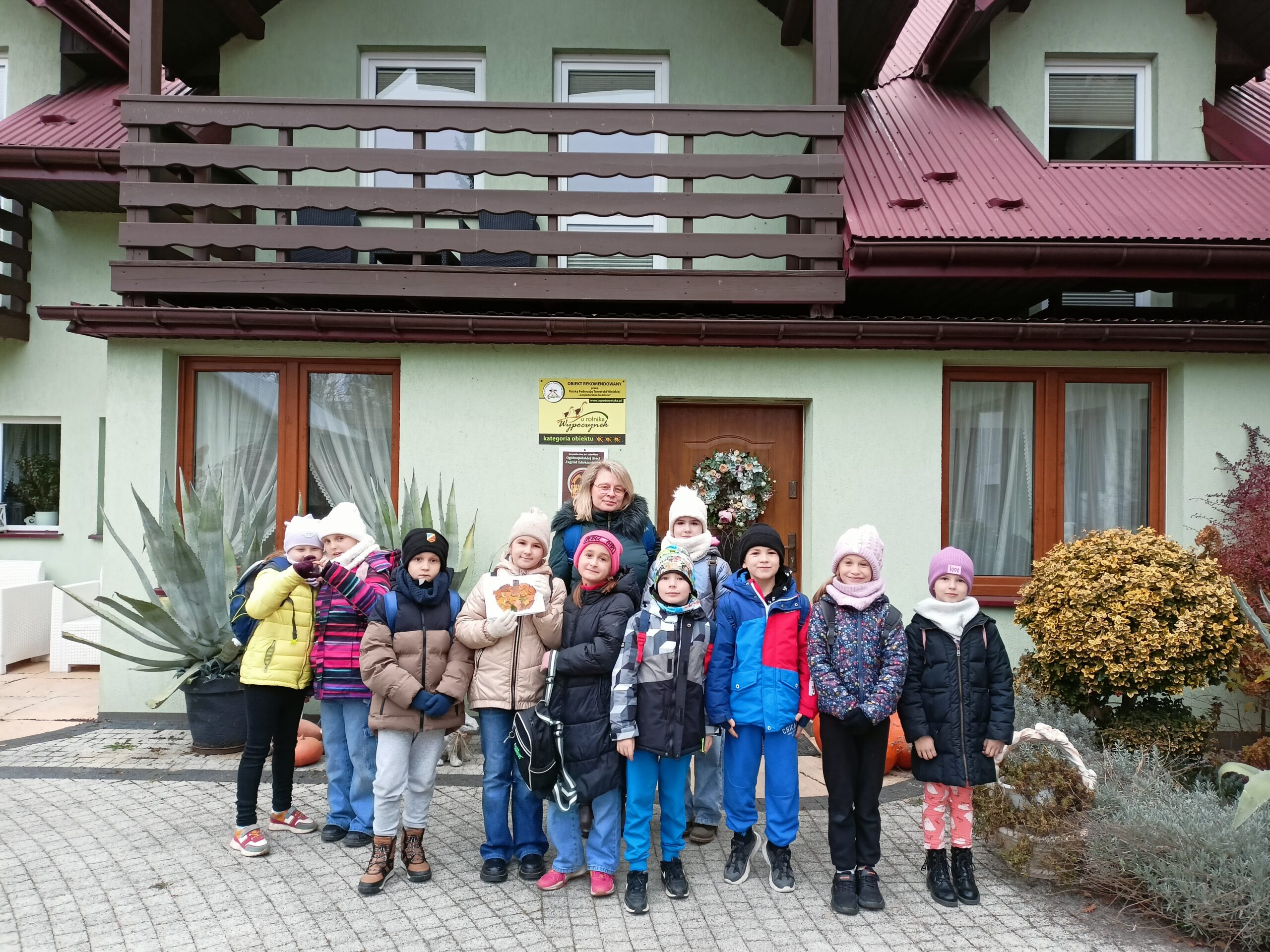 13 listopada klasy 2a i 3a wybrały się na jesienne warsztaty do gospodarstwa agroturystycznego „Owieczka” w Łukowicy. Podczas zajęć uczniowie dowiedzieli się różnych ciekawych faktów na temat dyni i ziemniaków. Mieli okazję degustować pieczonego ziemniaka oraz zupę dyniową. Warsztaty obfitowały w różne formy aktywności. Dzieci przygotowywały ciasteczka, które kształtem nawiązywały do jesienni. Wśród nich można było odnaleźć jeża, wiewiórki, dynie, gruszki, jabłka, liście. Kolejną atrakcją był spacer ścieżką edukacyjną. Uczniowie zgłębili wiedzę na temat zwierząt i roślin występujących w lesie. Mogli nakarmić zwierzęta w zagrodzie m.in. owce, daniele, barany oraz nazbierać liści, by stworzyć jesienną mozaikę dyniową. Bogactwo fauny i flory o tej porze roku było „żywą” lekcją przyrody. [MS]