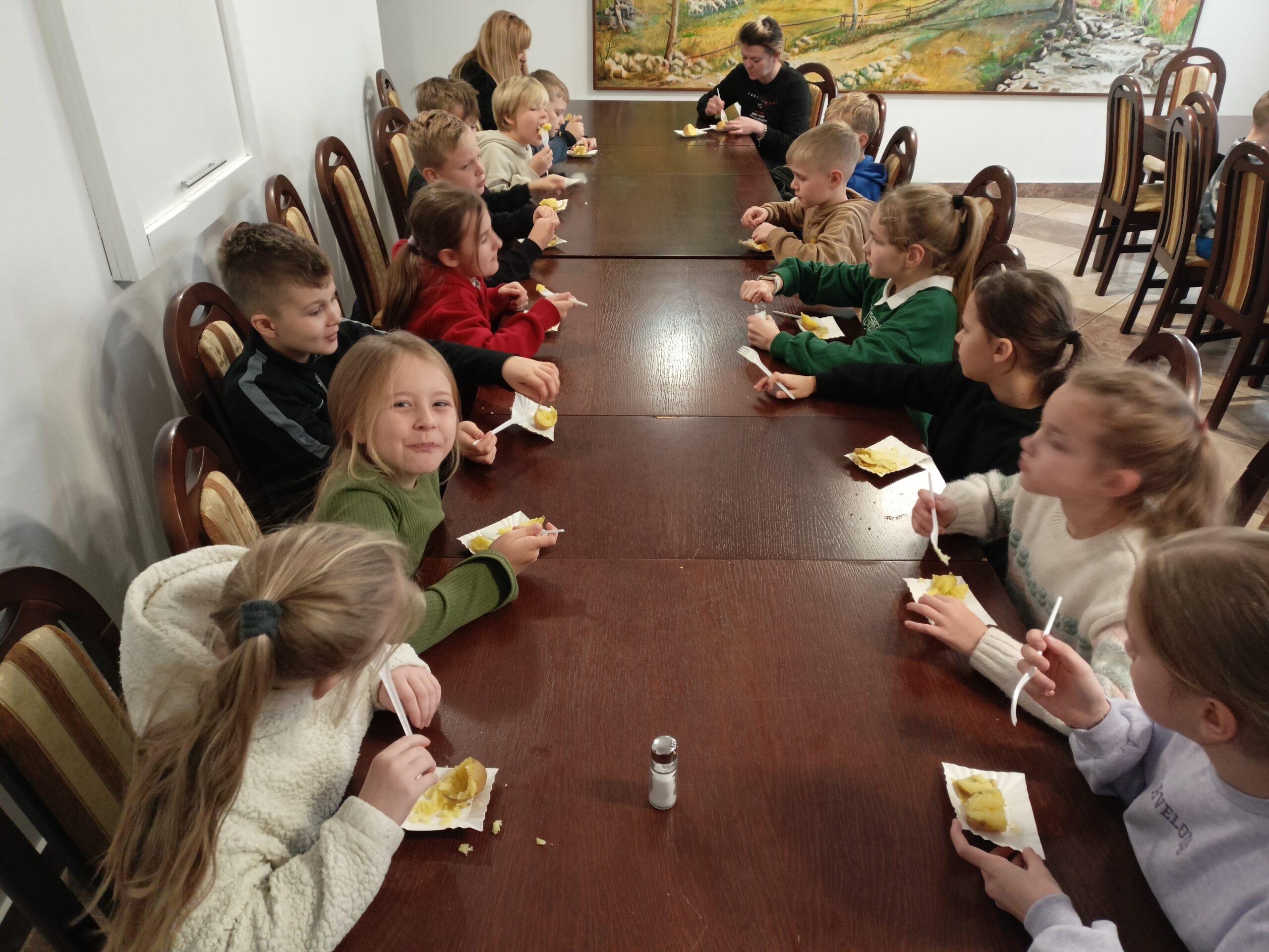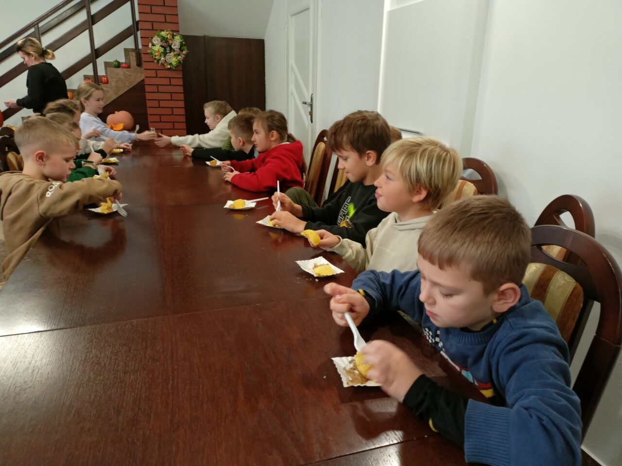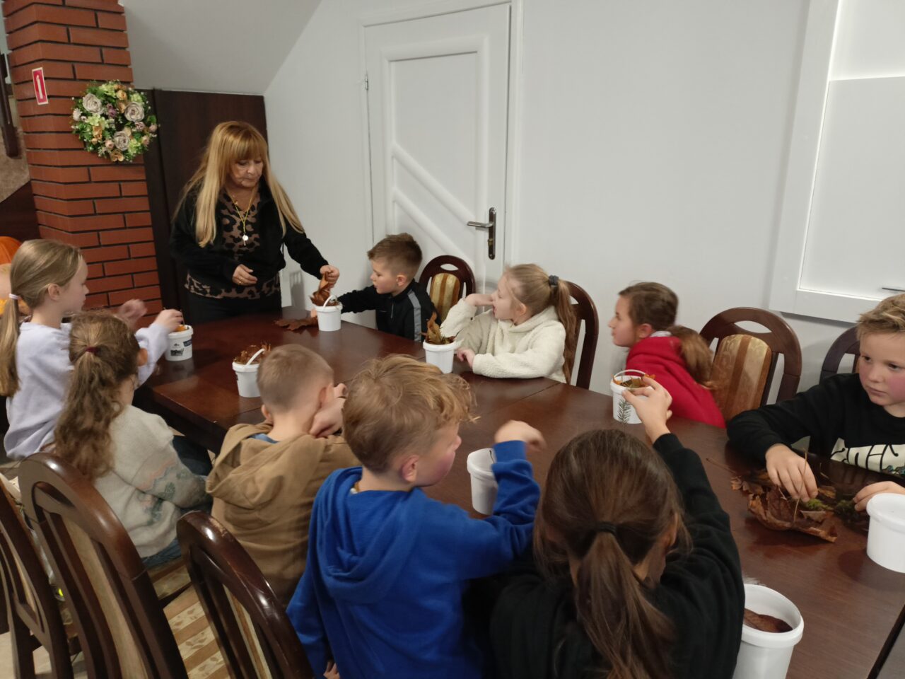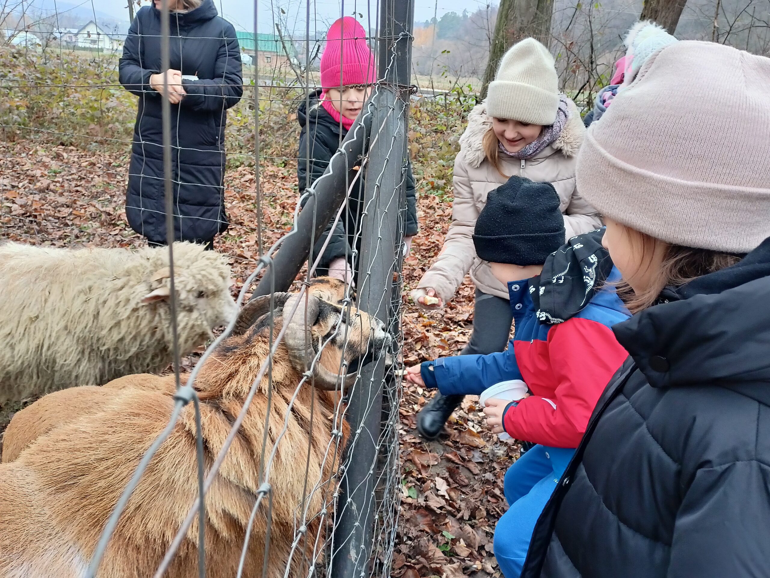 13 listopada klasy 2a i 3a wybrały się na jesienne warsztaty do gospodarstwa agroturystycznego „Owieczka” w Łukowicy. Podczas zajęć uczniowie dowiedzieli się różnych ciekawych faktów na temat dyni i ziemniaków. Mieli okazję degustować pieczonego ziemniaka oraz zupę dyniową. Warsztaty obfitowały w różne formy aktywności. Dzieci przygotowywały ciasteczka, które kształtem nawiązywały do jesienni. Wśród nich można było odnaleźć jeża, wiewiórki, dynie, gruszki, jabłka, liście. Kolejną atrakcją był spacer ścieżką edukacyjną. Uczniowie zgłębili wiedzę na temat zwierząt i roślin występujących w lesie. Mogli nakarmić zwierzęta w zagrodzie m.in. owce, daniele, barany oraz nazbierać liści, by stworzyć jesienną mozaikę dyniową. Bogactwo fauny i flory o tej porze roku było „żywą” lekcją przyrody. [MS]