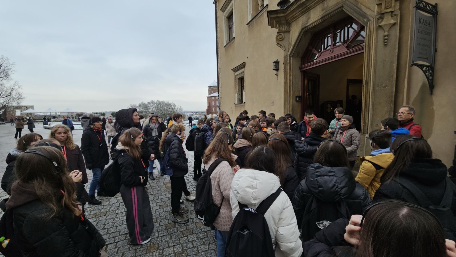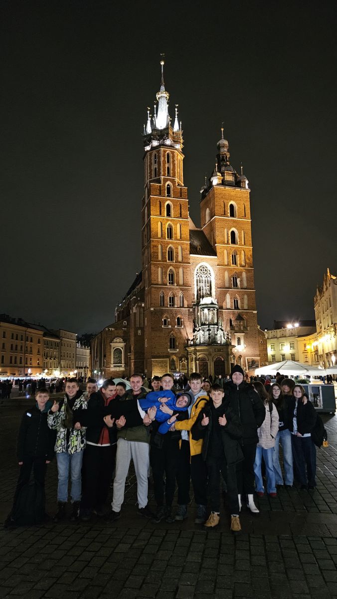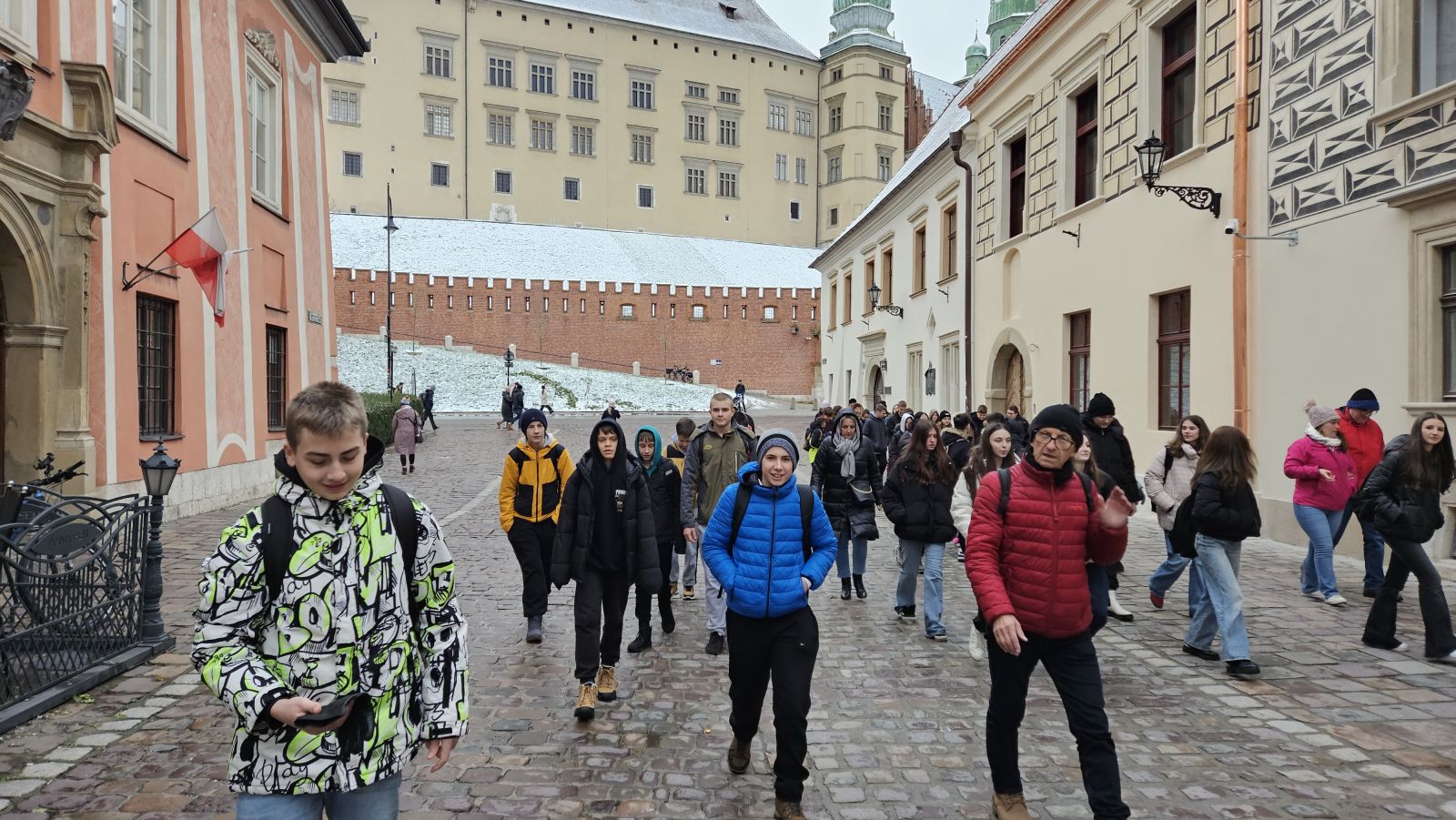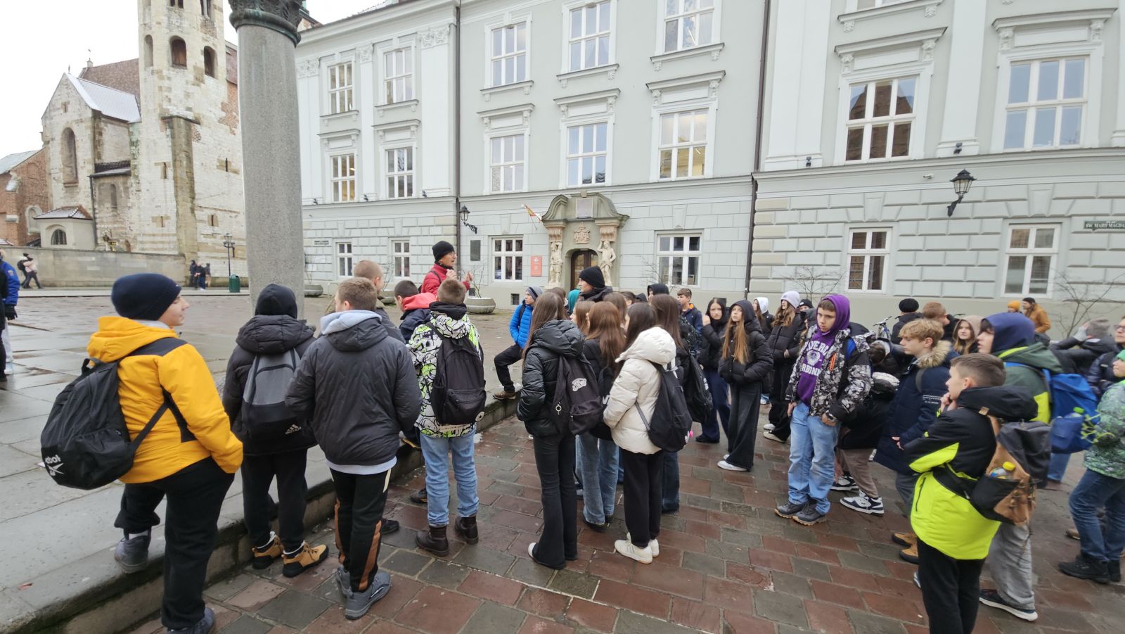 21 listopada 2025 r. uczniowie klasy 7b i 8b w zimowej scenerii udali się na całodniową wycieczkę do Krakowa. Pierwszym punktem programu było Centrum Edukacji Przyrodniczej Uniwersytetu Jagiellońskiego, gdzie uczestnicy wzięli udział w warsztatach poświęconych budowie szkieletu człowieka. Niektórzy odkryli, gdzie znajduje się kość, o której istnieniu wcześniej nie mieli pojęcia. Zwiedzanie wystawy „Zwierzęta i człowiek w przyrodzie” pokazało, że w świecie fauny wcale nie jest nudno – zwłaszcza, gdy zwierzęta muszą kombinować, jak nie zostać czyjąś przekąską. Zajęcia pozwoliły uczniom w praktyczny sposób poznać funkcjonowanie układu kostnego oraz zależności między organizmami w ekosystemach. Następnie grupa udała się na Wawel, by zwiedzić Katedrę, Groby Królewskie oraz słynny Dzwon Zygmunta, który – niestety – pozostał cichy, mimo że wszyscy bardzo chcieli usłyszeć jego brzmienie. Nie zabrakło też chwili na uzupełnienie energii w znanym królestwie złotych frytek i burgerów. Ostatnim etapem wycieczki było zwiedzanie multimedialnej ekspozycji w Podziemiach Rynku Głównego, ukazującej historię średniowiecznego Krakowa. Wycieczka była doskonałą okazją do nauki przez doświadczenia oraz poznania najważniejszych zabytków i historii Krakowa. Trudno o lepszy sposób na edukację i integrację! [ZP]