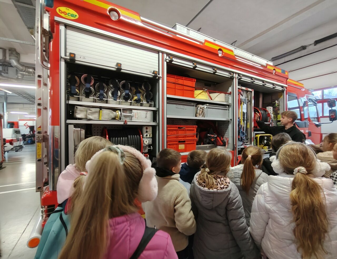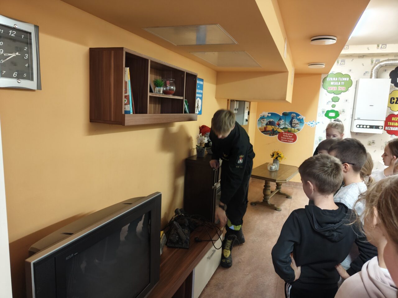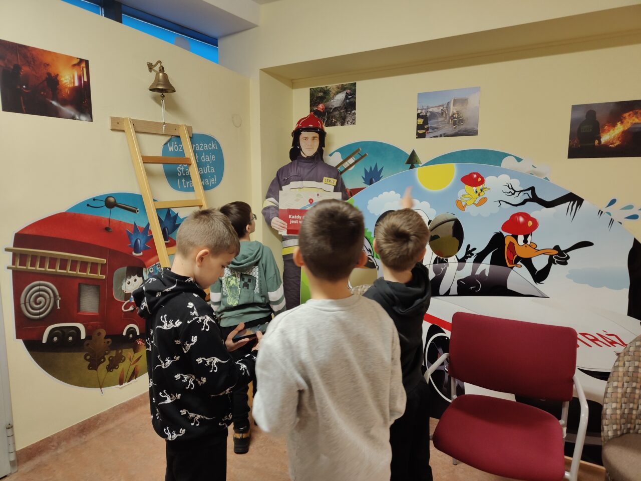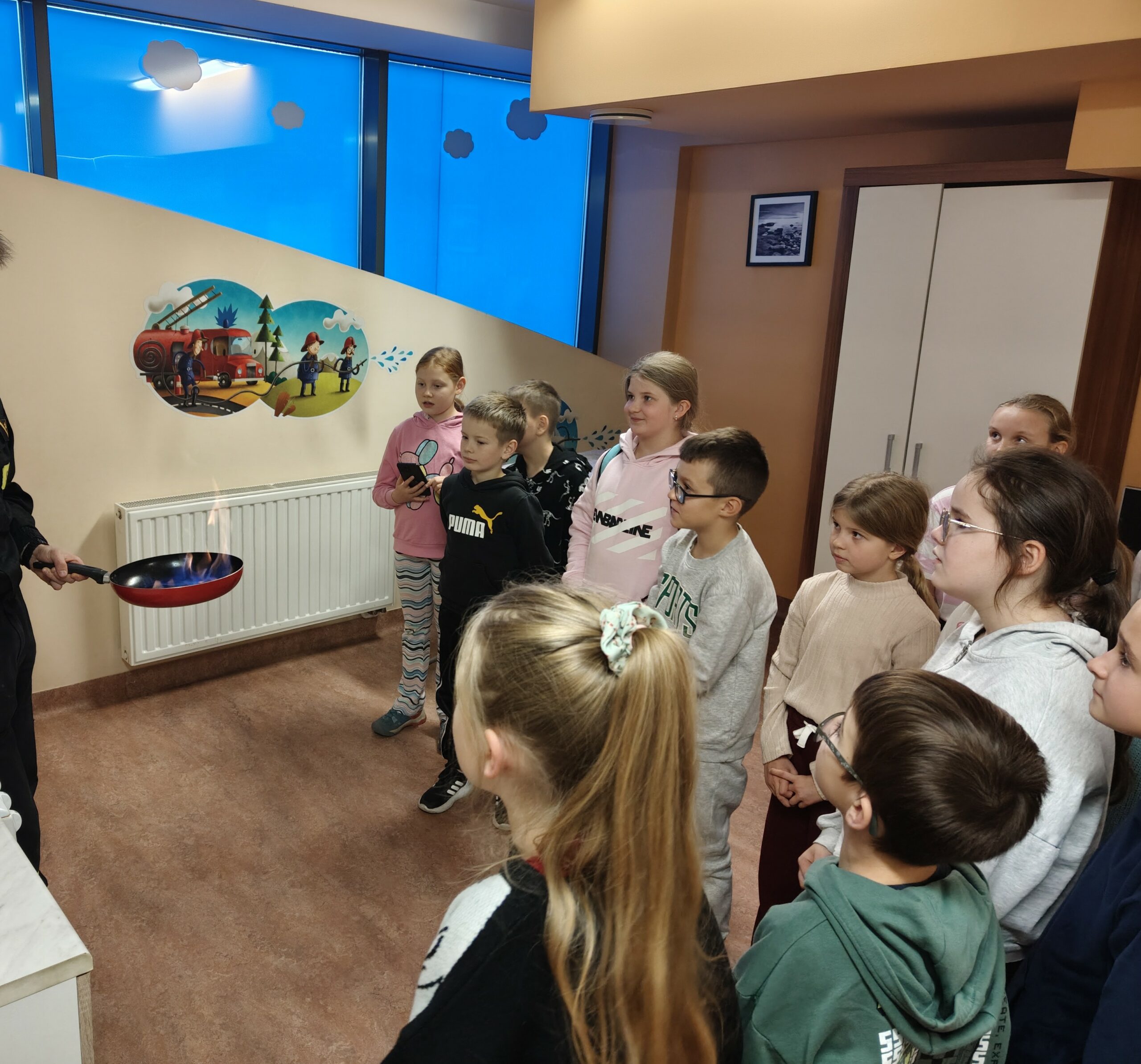 Kolejnym punktem wycieczki była wizyta w Komendzie Miejskiej Państwowej Straży Pożarnej w Nowym Sączu. Strażacy w ramach działań profilaktycznych prowadzą zajęcia edukacyjne – „Bezpieczny dom” z zakresu bezpieczeństwa i postępowania w sytuacjach zagrożenia pożarowego. Zajęcia odbywają się w specjalnej sali edukacyjnej „Ognik”. Dzieci pod okiem doświadczonego strażaka zobaczyły jakie niebezpieczeństwa czyhają w domu np. rozgrzany olej na patelni, który może doprowadzić do pożaru i rozległych oparzeń, uszkodzona instalacja elektryczna niesie ryzyko porażania prądem, a niesprawny piec gazowy grozi zatruciem tlenkiem węgla. Pokaz multimedialny pokazał wiele aspektów pracy strażaków np. podczas pożaru, powodzi, wypadków komunikacyjnych czy trzęsień ziemi. Odwaga i poświęcenie towarzyszą strażakom każdego dnia. Po teorii przyszedł czas na praktykę. Uczniowie musieli wykazać się zasadami stosowanymi podczas ewakuacji. W zadymionym pomieszczeniu szukali bezpiecznego wyjścia. Na koniec dzieci zwiedziły jednostkę. Zobaczyły wozy strażackie i sprzęt ratowniczy. [MS]