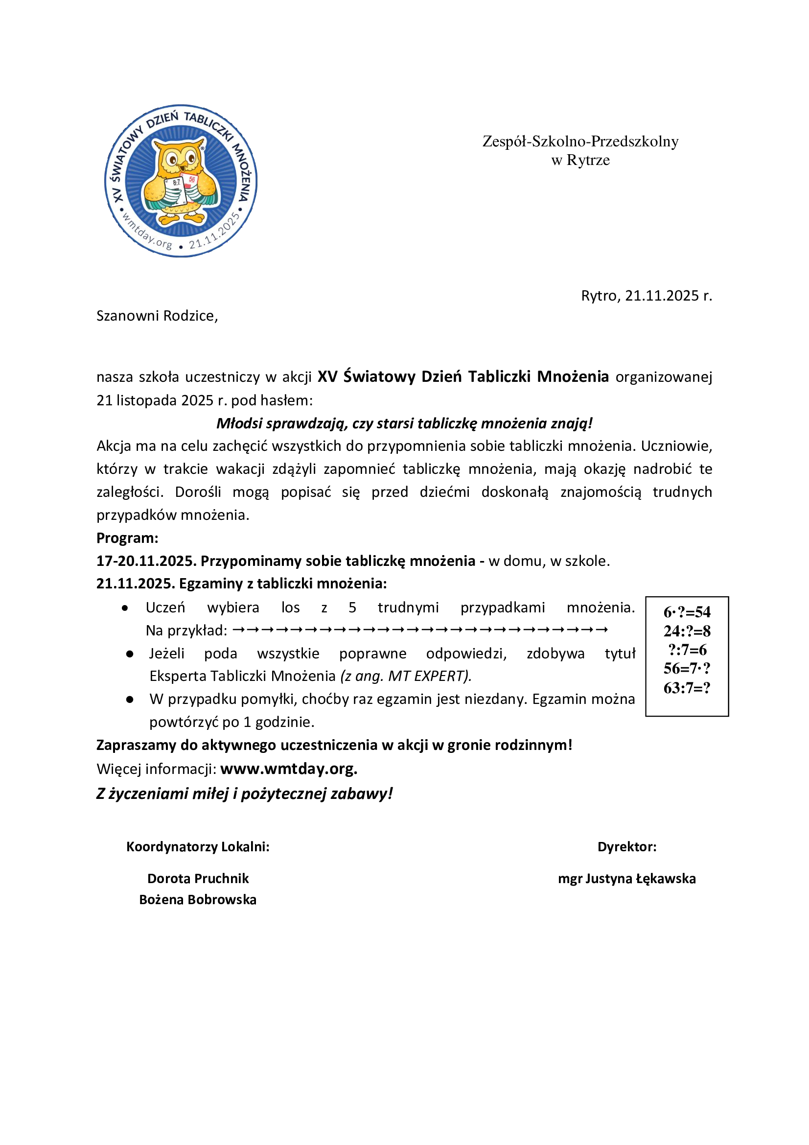 XV Światowy Dzień Tabliczki Mnożenia 12 listopada 2025 12 listopada 2025 Ogłoszenia Światowy Dzień Tabliczki Mnożenia (ŚDTM) (ang. World Multiplication Table Day) to coroczna, bezpłatna akcja edukacyjna organizowana w trzeci piątek listopada. Najbliższa, XV edycja odbędzie się 21 listopada 2025 roku.