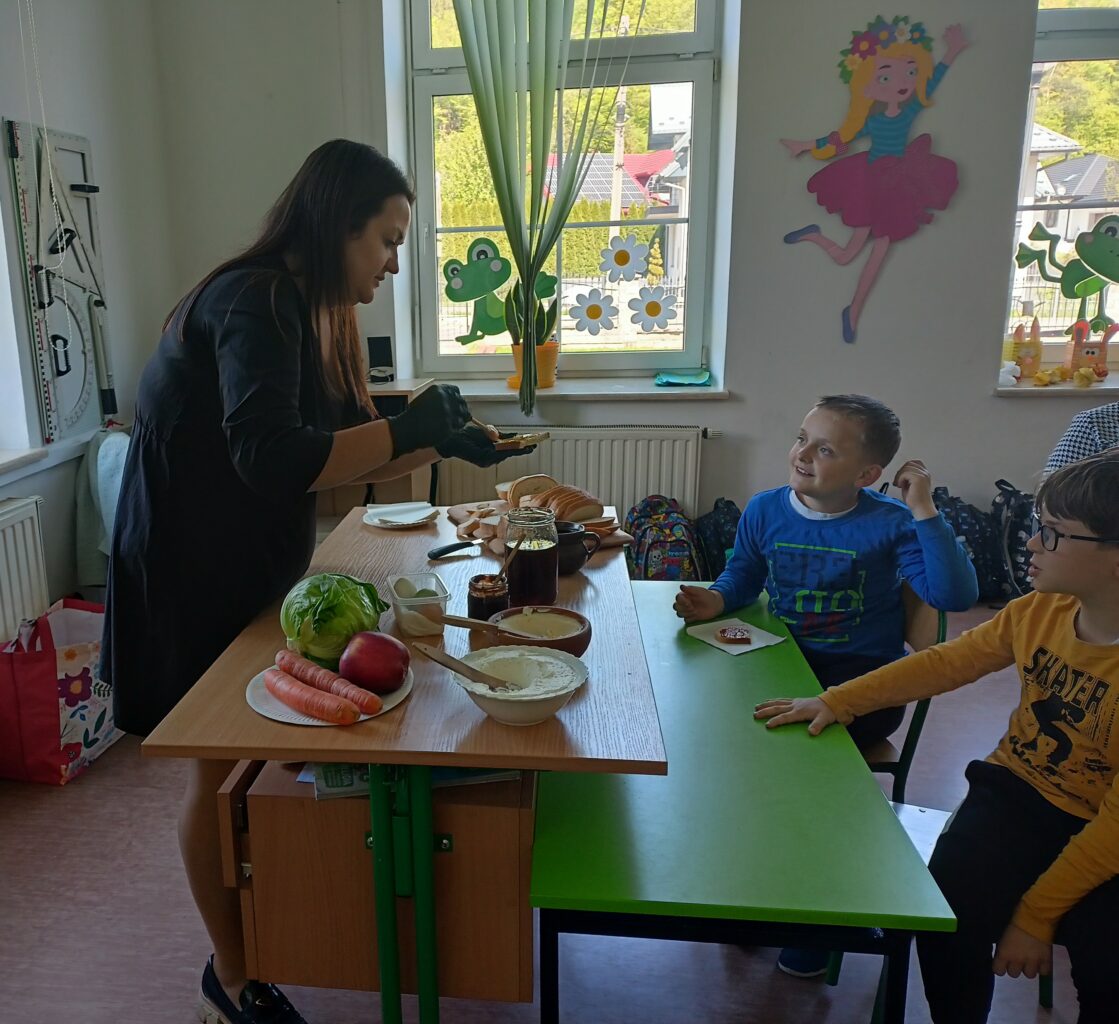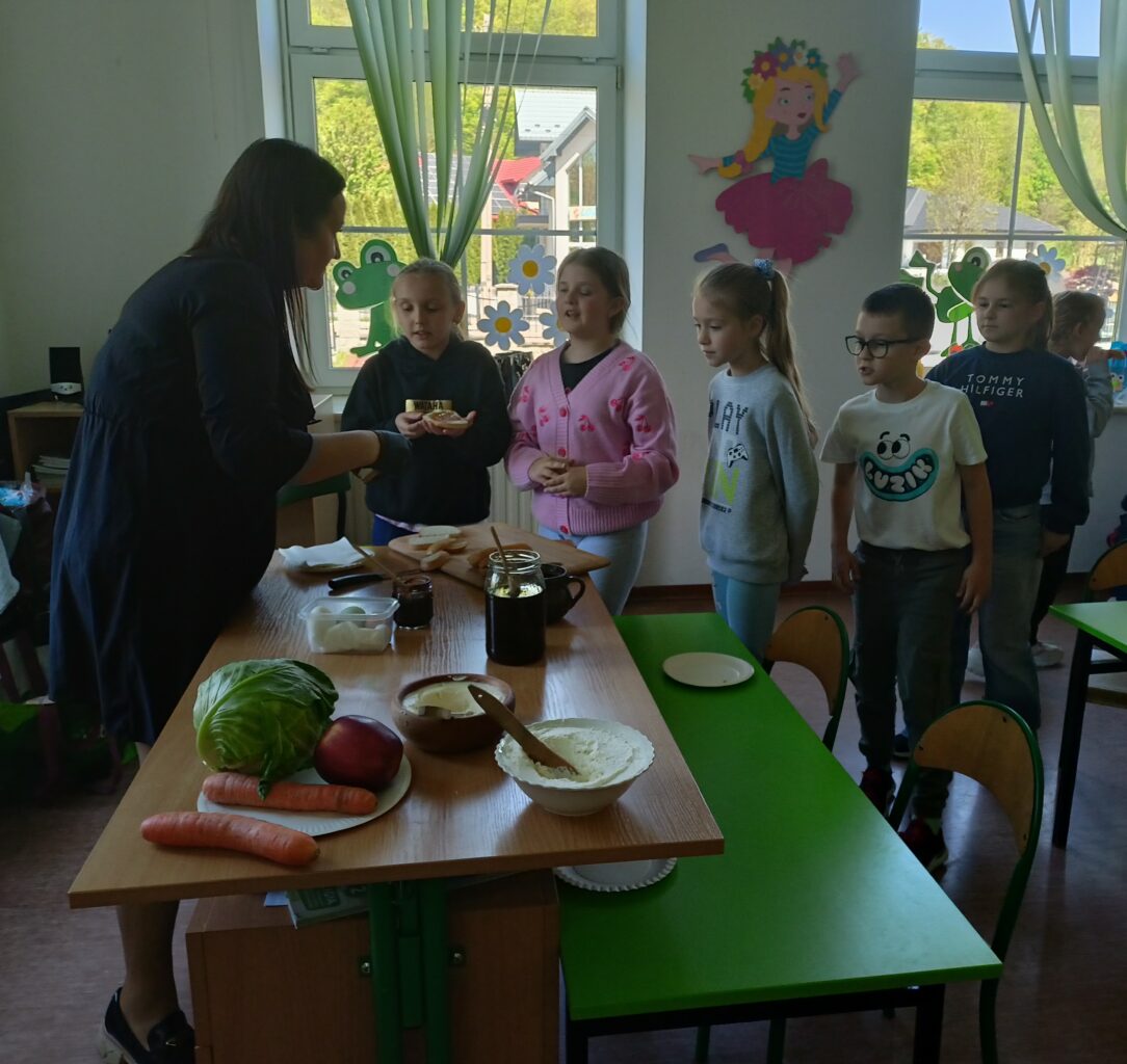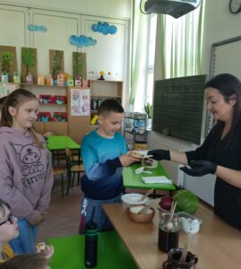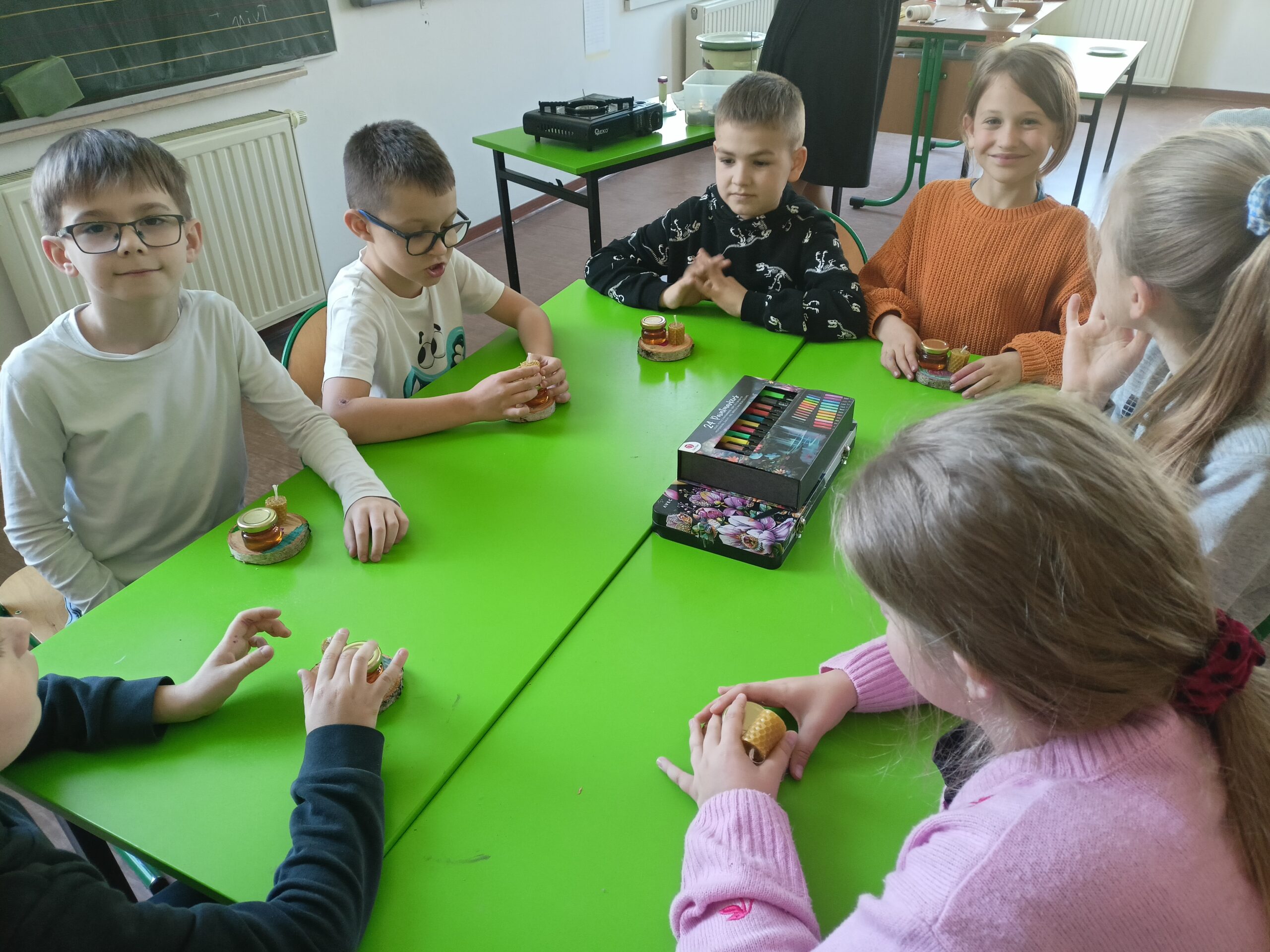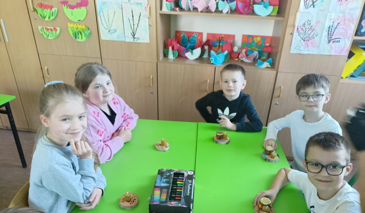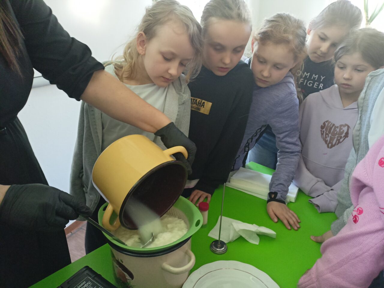 Klasy pierwsze i drugie wzięły udział w warsztatach dotyczących zdrowej żywności. Uczniowie dowiedzieli się jak ważna jest ekologia w naszym codziennym życiu oraz o negatywnym wpływie chemii używanej do produkcji żywności. Dzięki eko gospodarstwom rolnym możemy cieszyć się dobrym zdrowiem i długim życiem. Podczas zajęć dzieci odkryły tajniki powstawania masła, mleka, sera oraz czym jest gospodarstwo agroturystyczne. Warsztaty miały wymiar praktyczny. Uczniowie zobaczyli naturalny proces produkcji sera z mleka krowiego. Degustowali bio produkty takie jak: masło, dżemy, miody, śmietanę. Klasy drugie przygotowały piękne podarunki z okazji zbliżającego się Dnia Mamy. Tworzyli świece z wosku pszczelego i dekorowali podkładki z drzewa brzozowego. [MS]