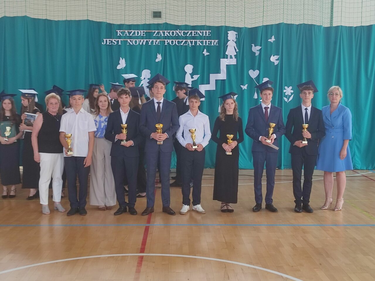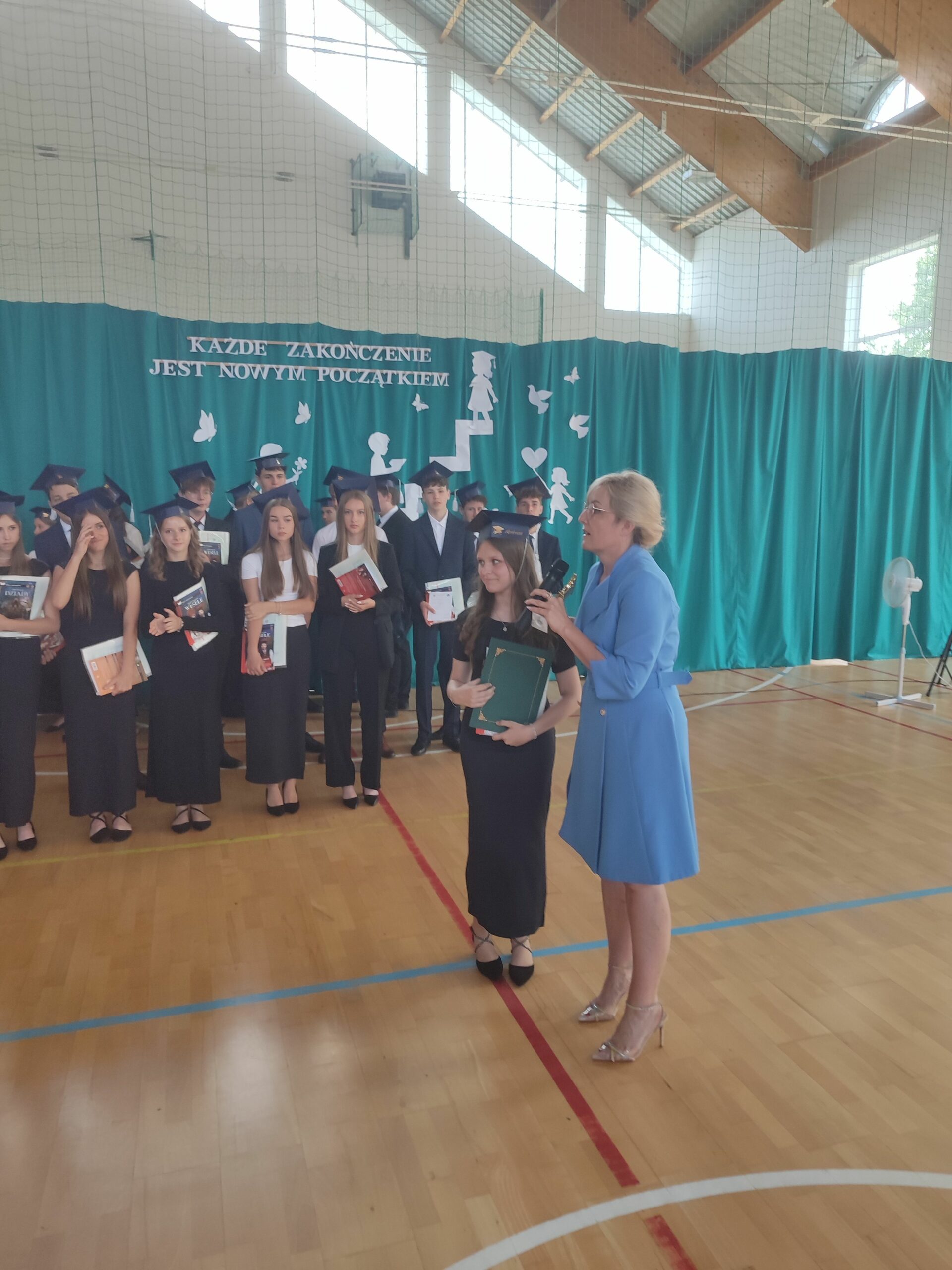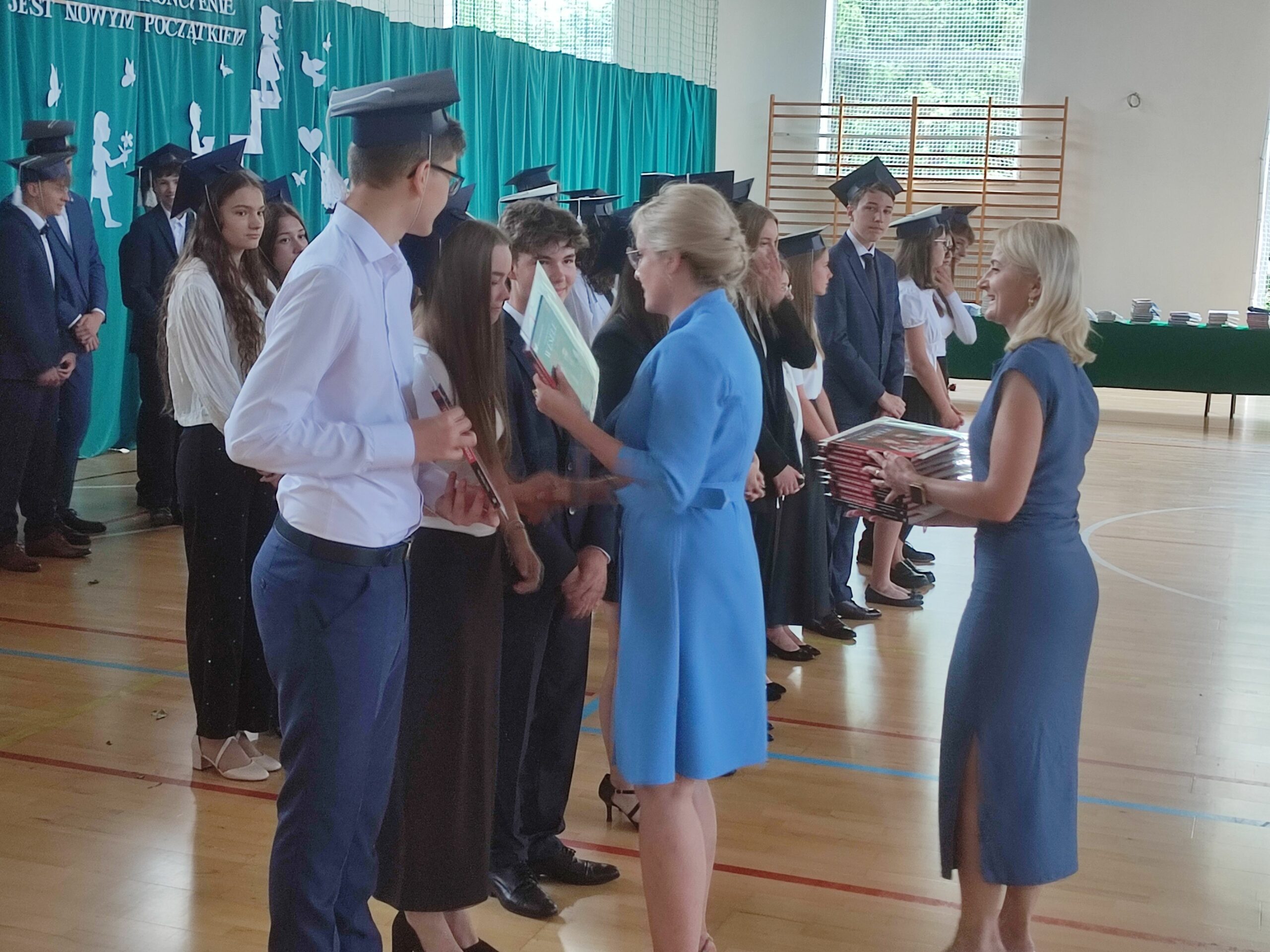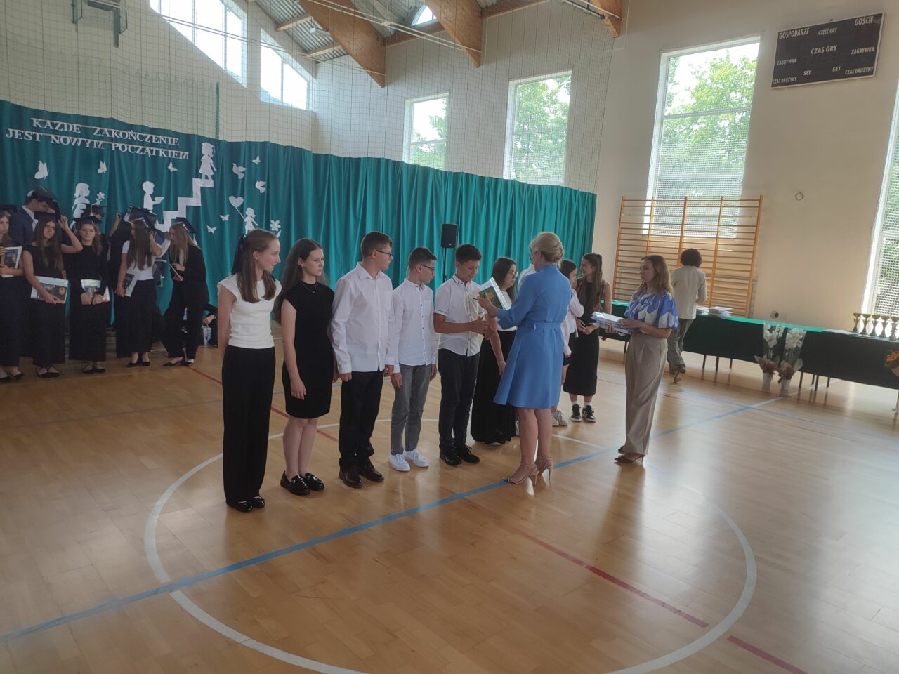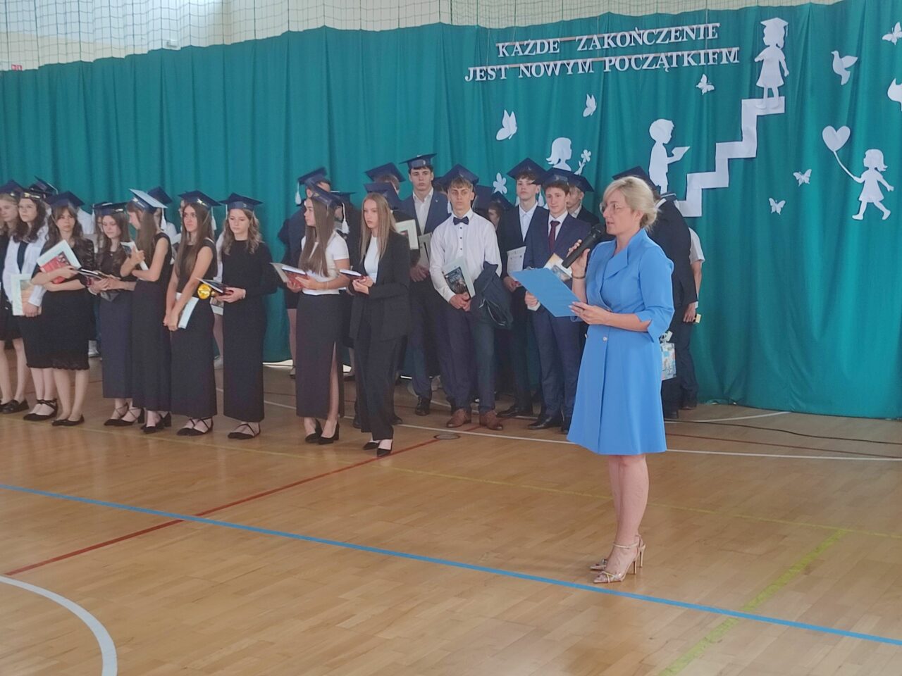 Dzisiaj, w uroczystej atmosferze, żegnamy kolejny rok szkolny, czas wytężonej pracy, nauki. Chciałabym wyrazić wdzięczność wszystkim uczniom za ich zaangażowanie, chęć zdobywania wiedzy i rozwijania swoich pasji. Miniony rok był dla Naszej szkoły pełen wydarzeń i inicjatyw. Uczniowie uczestniczyli w wielu konkursach, olimpiadach, zawodach sportowych, imprezach kulturalnych, jak również licznych projektach edukacyjnych, rozwijając swoje zainteresowania i talenty. Wiele z tych działań przyniosło nam jako szkole sukcesy, z których jesteśmy dumni. Pamiętajmy jednak, że prawdziwe sukcesy to nie tylko te widoczne na zewnątrz, ale przede wszystkim te, które mierzymy postępem w nauce, rozwojem osobistym i umiejętnością radzenia sobie z wyzwaniami.